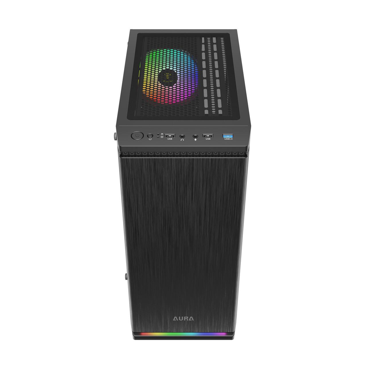Carcasa Gamdias Aura GC8 aRGB neagra, SPCC & ABS & Tempered glass, Mid Tower Case, interior vopsit negru, 2 x 3.5" sau 1 x 2.5"+1 x 3.5"(HDD Cage), 1x 2.5” (intern), fata – 3x 120mm Fans (optional), spate – 1x 120mm aRGB LED Fans (inclus), tavan – 2x 120mm fans (optional), 1x USB 3.0, 2x USB 2.0, HD Audio, ATX/Micro-ATX/Mini-ITX, design premium cu panou lateral din sticla securizata, sloturi expansiune: x7, inaltime maxima cooler procesor: 160mm, lungime maxima placa video: 300mm, lungime maxima sursa: 150mm, suport radiatoare water cooling: spate – radiator 120mm, dimensiuni (LxWxH): 350x188x430mm, greutate: 3.3kg