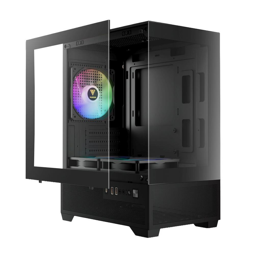Carcasa Gamdias Aura GC9M Elite aRGB neagra, SPCC & ABS & Tempered glass, Mid Tower Case, interior vopsit negru, 1 x 3.5" sau 1 x 2.5", spate – 1x 120mm aRGB LED Fans (inclus), tavan – 2x 120mm fans (optional), podea – 2x 120mm aRGB LED Fans (inclus), 1x USB Type-C, 2x USB 2.0, HD Audio, Micro-ATX/Mini-ITX, design premium panoramic din sticla securizata, sloturi expansiune: x4, inaltime maxima cooler procesor: 155mm, lungime maxima placa video: 280mm, lungime maxima sursa: 150mm, suport radiatoare water cooling: tavan – 1x 280mm (lungime maxima radiator 278mm), spate – 1x 120mm, dimensiuni (LxWxH): 280x195x380mm, greutate: 3.07kg