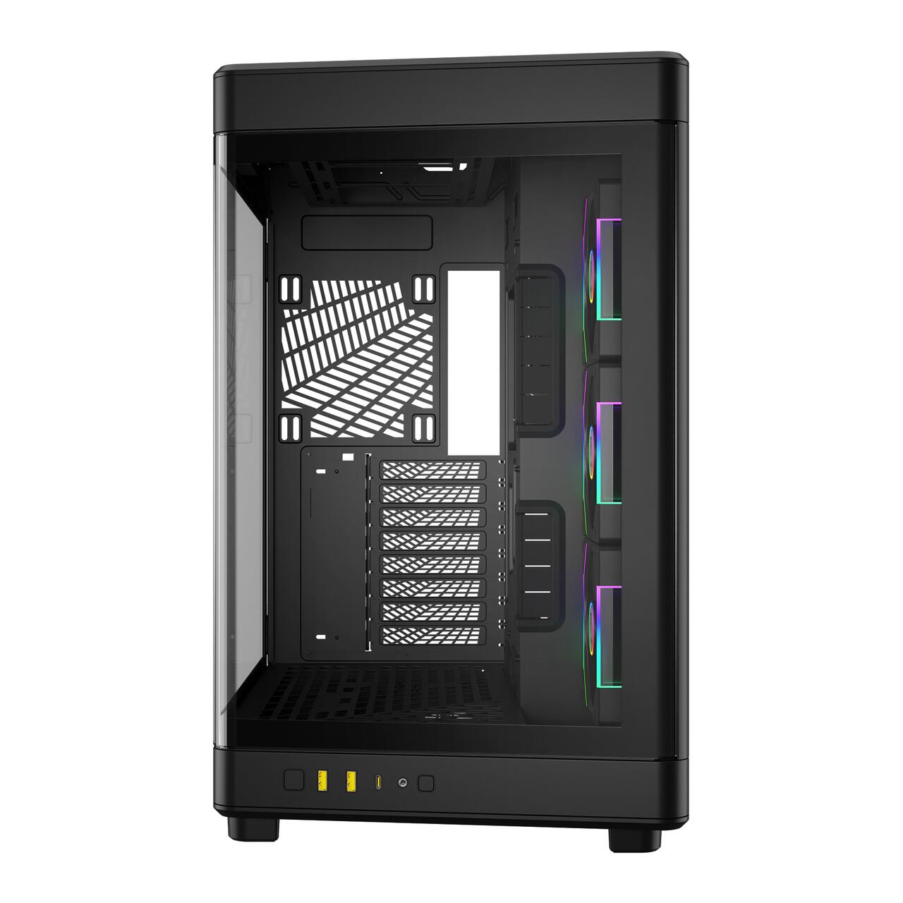 Carcasa Gamdias Neso P1-Pro neagra, SPCC & ABS & Tempered glass, Full Tower Case, dual chamber, interior vopsit negru, 2x 3.5" sau 1x 2.5"+1x 3.5"(HDD Cage), 2x 2.5” (HDD Cage), 3x 2.5” (intern), lateral – 3x 120mm ARGB PWM AEOLUS P2 Fans (inclus) / 2x 140mm Fans (optional), spate – 1x 120/140mm Fans (optional), tavan – 3x 120mm / 2x 140mm fans (optional), podea – 3x 120mm Fans (optional), 2x USB 3.0, 1x USB Type-C, HD Audio, E-ATX(310mm latime)/ATX/Micro-ATX/Mini-ITX, sloturi expansiune: x8, HUB aRGB inclus cu 8 port-uri (3 port-uri sunt ocupate de ventilatoarele montate pe carcasa), design premium cu panou lateral si frontal din sticla securizata, carcase se poate aseza atat vertical (tower) cat si orizontal (desktop), inaltime maxima cooler procesor: 193mm, lungime maxima placa video: 192-426mm, lungime maxima sursa: 180mm, suport radiatoare water cooling: lateral – radiator 360/420mm, spate – radiator 120mm, tavan – radiator 360mm, dimensiuni ((LxWxH): 490x310x495mm, greutate: 11.97kg