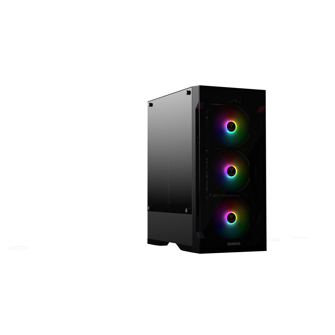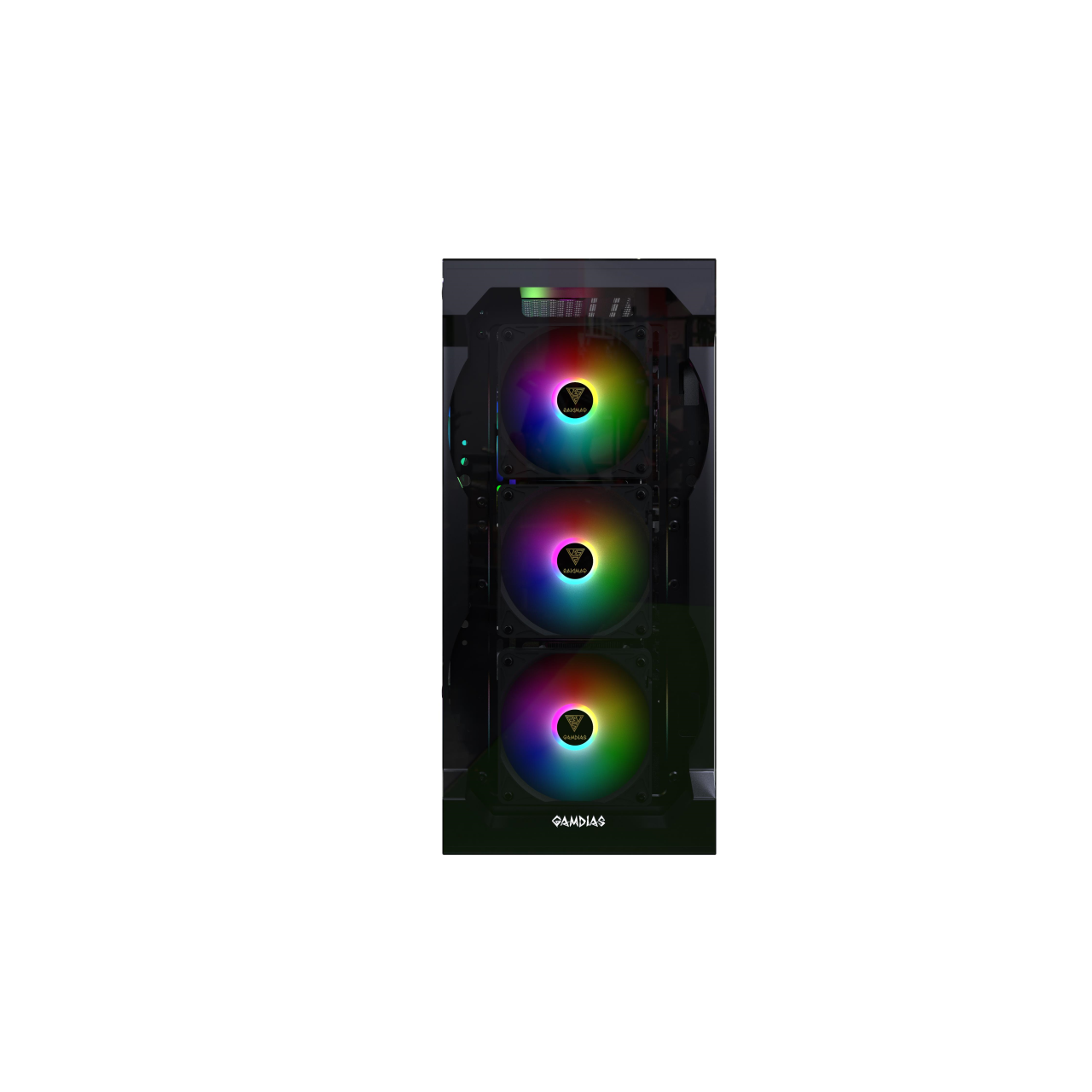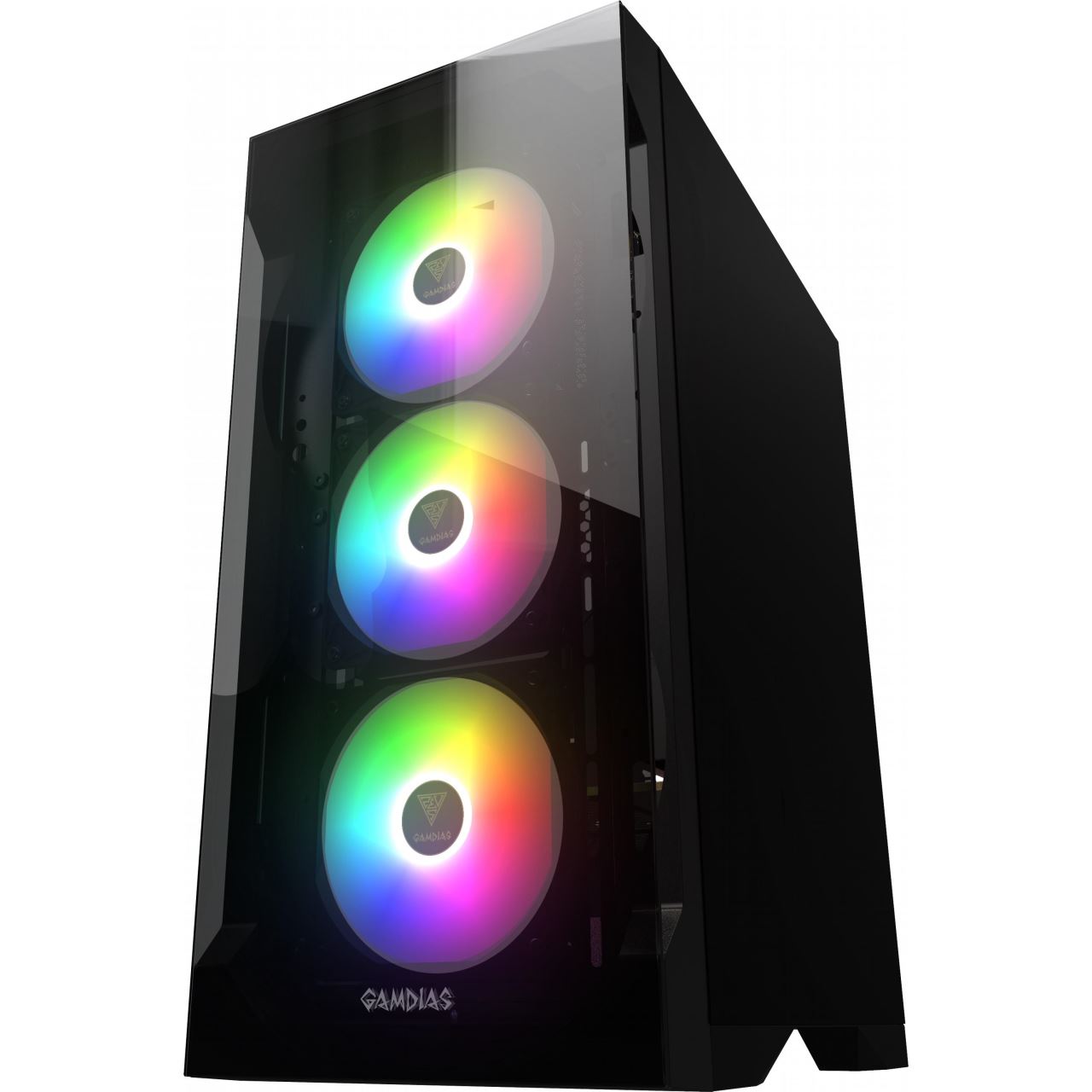 Carcasa Gamdias Talos E2 neagra, SPCC Steel and ABS, ATX Mid Tower Case, interior vopsit negru, 2x3.5” sau 1x3.5” si 1x2.5” (intern), 3x2.5” (intern), fata – 3x 120mm adressable RGB LED fans (inclus) / 2x 140mm / 2x 200mm (optional), spate – 1x 120mm (inclus) / 140mm fan (optional), tavan – 2x 120/140mm fans (optional), 1x USB 3.0, 2x USB 2.0, HD Audio, ATX/Micro-ATX/Mini-ITX, sloturi expansiune: x7, inaltime maxima cooler procesor: 150mm, lungime maxima placa video: 300mm, suport radiatoare water cooling: fata – radiator 360/280mm, tavan – 1x 240mm, spate – radiator 120mm, dimensiuni ((LxWxH): 370x216x462mm, greutate: 5.6kg