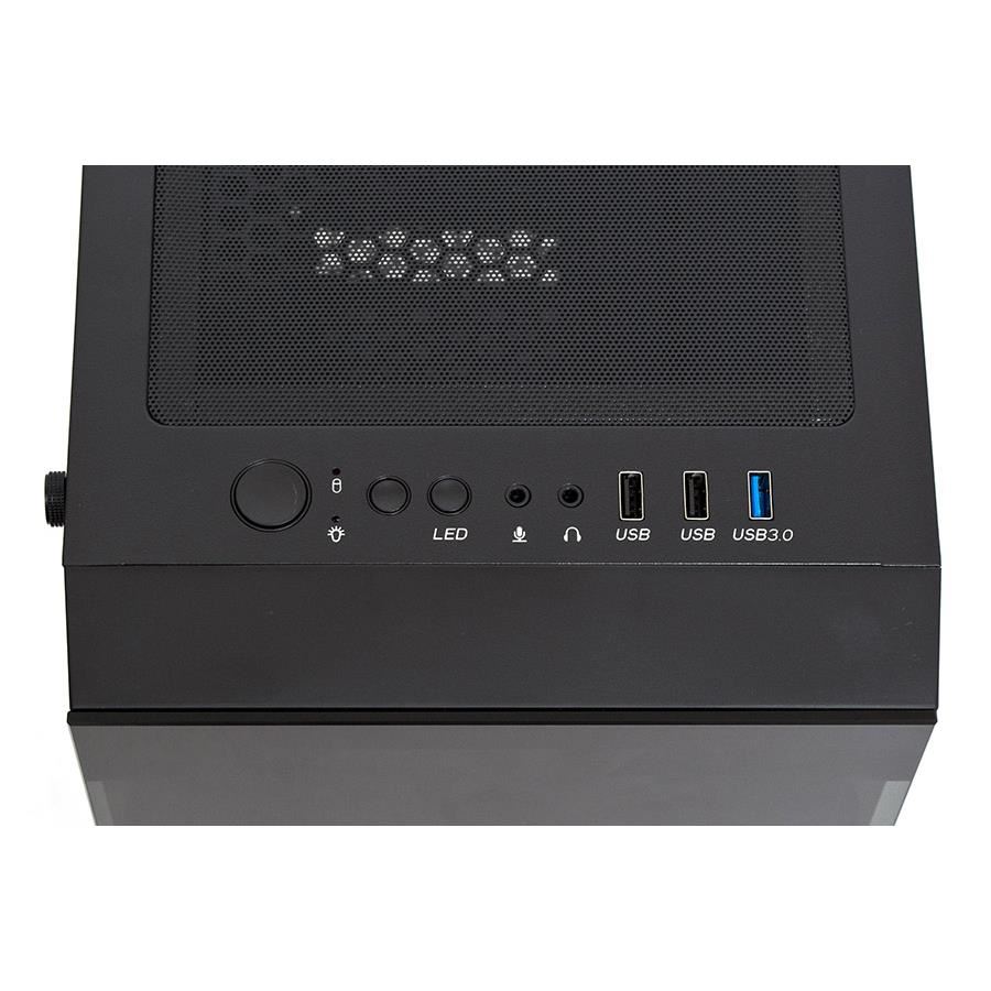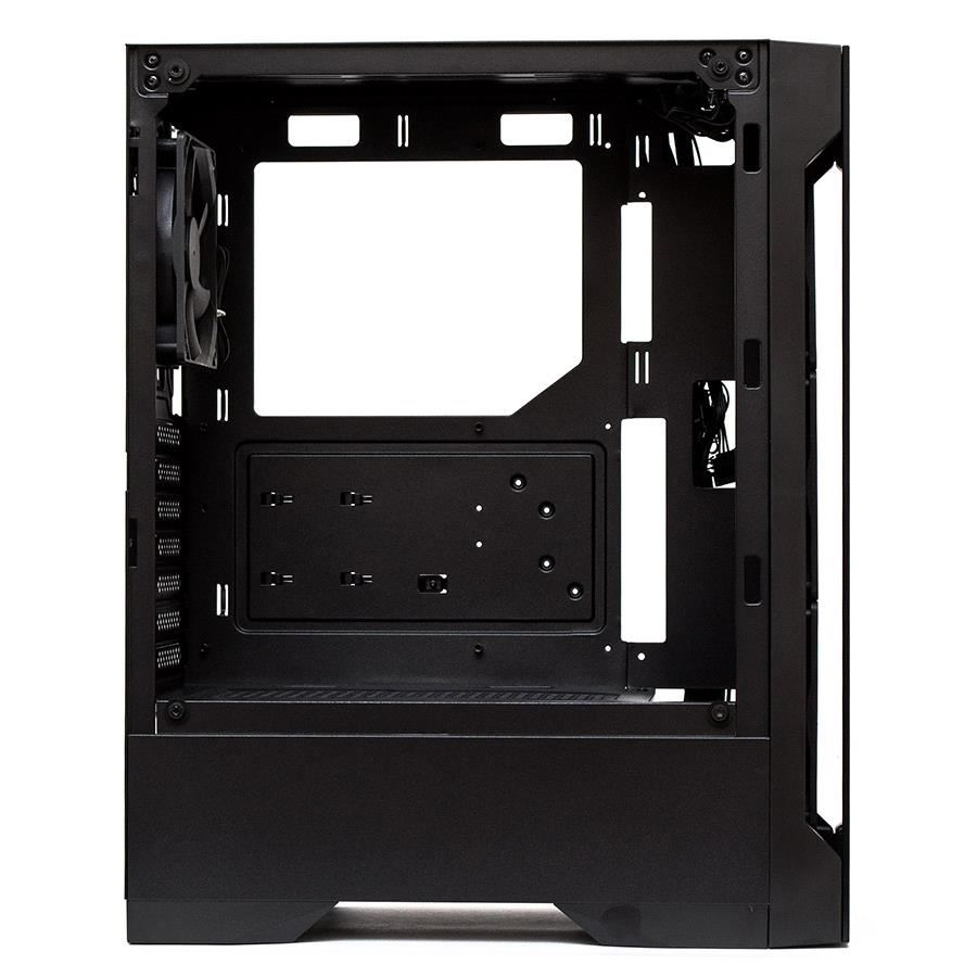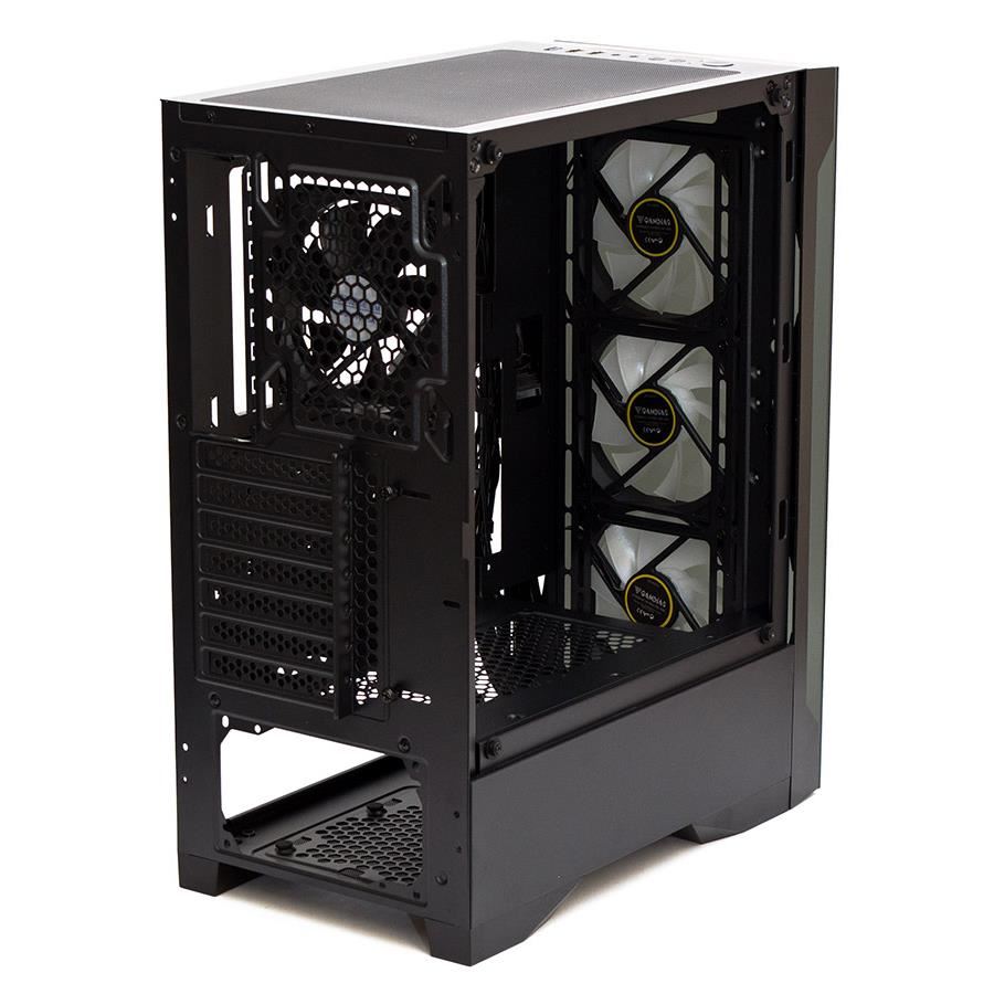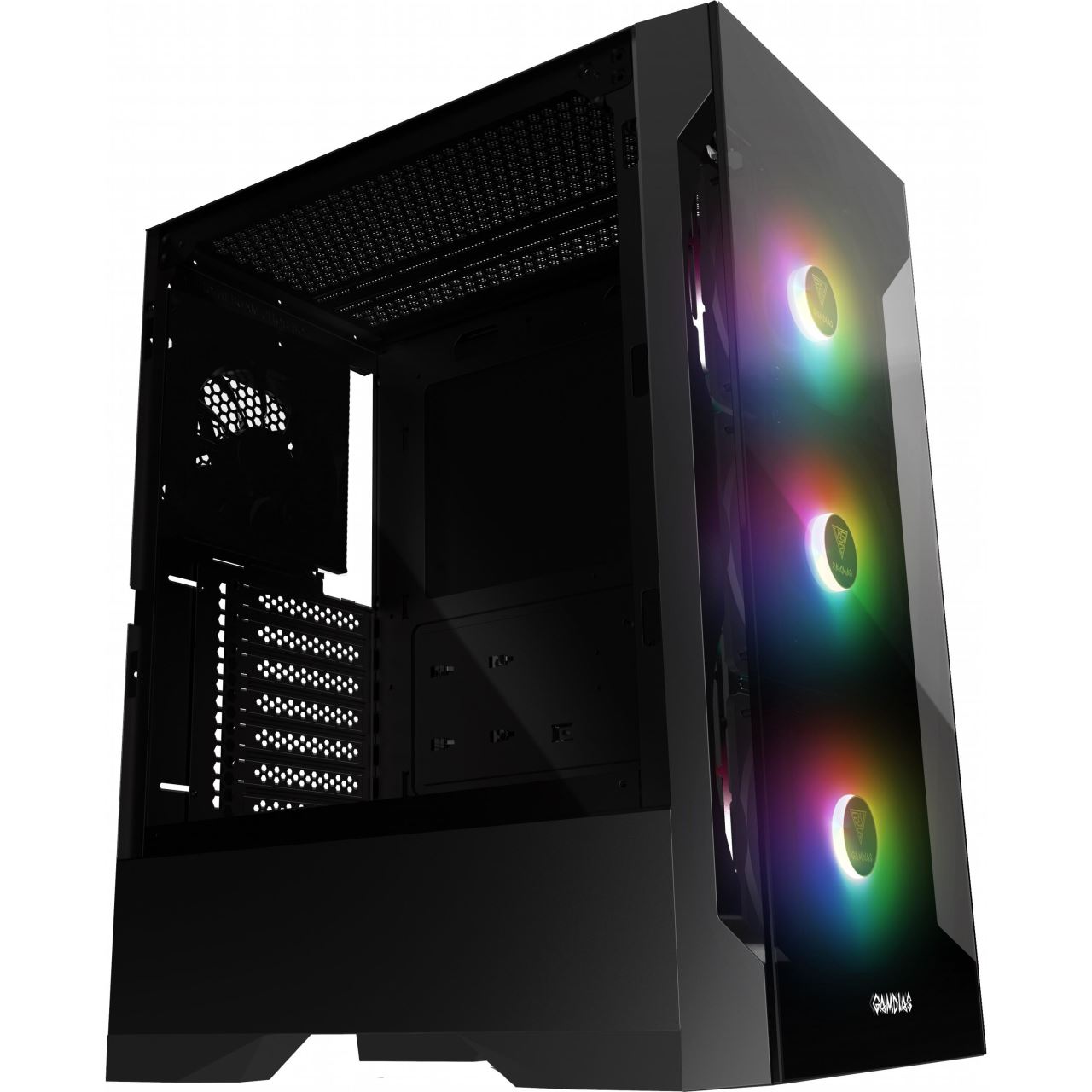 Carcasa Gamdias Talos E2 neagra, SPCC Steel and ABS, ATX Mid Tower Case, interior vopsit negru, 2x3.5” sau 1x3.5” si 1x2.5” (intern), 3x2.5” (intern), fata – 3x 120mm adressable RGB LED fans (inclus) / 2x 140mm / 2x 200mm (optional), spate – 1x 120mm (inclus) / 140mm fan (optional), tavan – 2x 120/140mm fans (optional), 1x USB 3.0, 2x USB 2.0, HD Audio, ATX/Micro-ATX/Mini-ITX, sloturi expansiune: x7, inaltime maxima cooler procesor: 150mm, lungime maxima placa video: 300mm, suport radiatoare water cooling: fata – radiator 360/280mm, tavan – 1x 240mm, spate – radiator 120mm, dimensiuni ((LxWxH): 370x216x462mm, greutate: 5.6kg