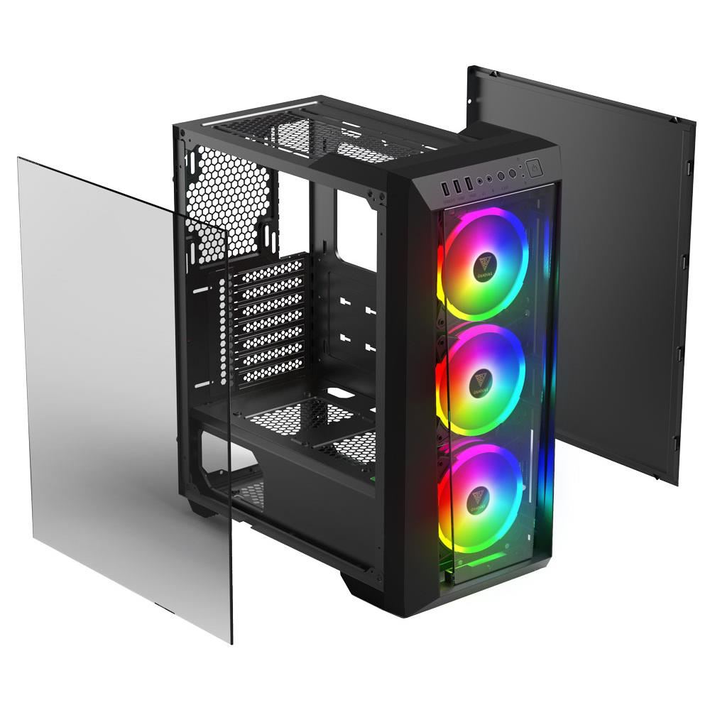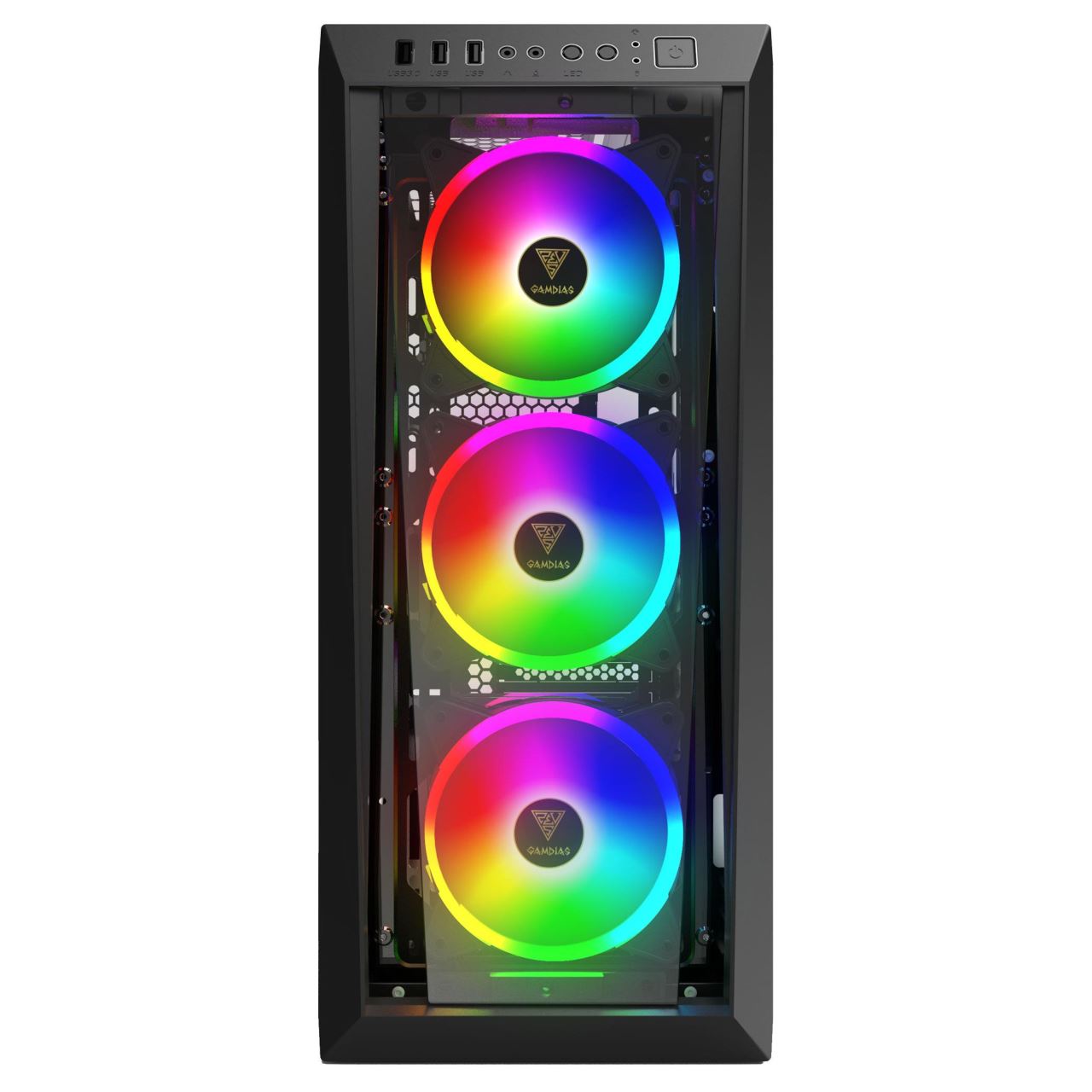 Carcasa Gamdias Talos M1 Lite neagra, SPCC Steel and ABS, ATX Mid Tower Case, interior vopsit negru, 2x 3.5" sau 1x 2.5"+1x 3.5"(HDD Cage), 1x 2.5" (intern), fata – 3x 120mm adressable RGB LED fans (inclus) / 2x 140/200mm (optional), spate – 1x 120/140mm fan (optional), tavan – 2x 120/140mm fans (optional), podea – 2x 120mm (optional), 1x USB 3.0, 2x USB 2.0, HD Audio, 1x RGB controller (se mai pot adauga 3 ventilatoare optionale si o banda LED), ATX/Micro-ATX/Mini-ITX, sloturi expansiune: x7+2, inaltime maxima cooler procesor: 170mm, lungime maxima placa video: 330mm, lungime maxima sursa: 170mm, suport radiatoare water cooling: fata – radiator 280/360mm, spate – radiator 120mm, tavan – radiator 240mm, dimensiuni ((LxWxH): 410x215x485mm, greutate: 7.5kg
