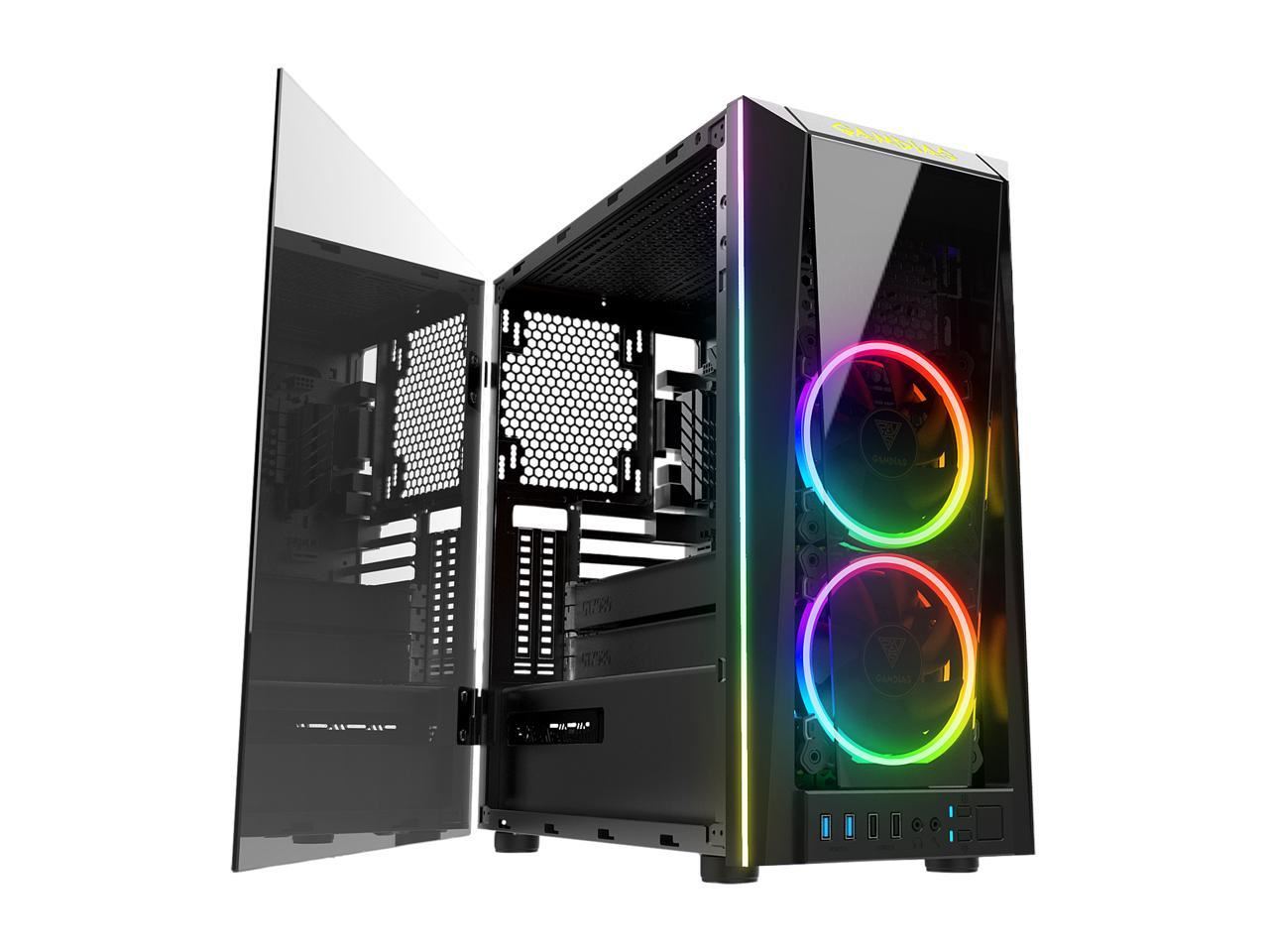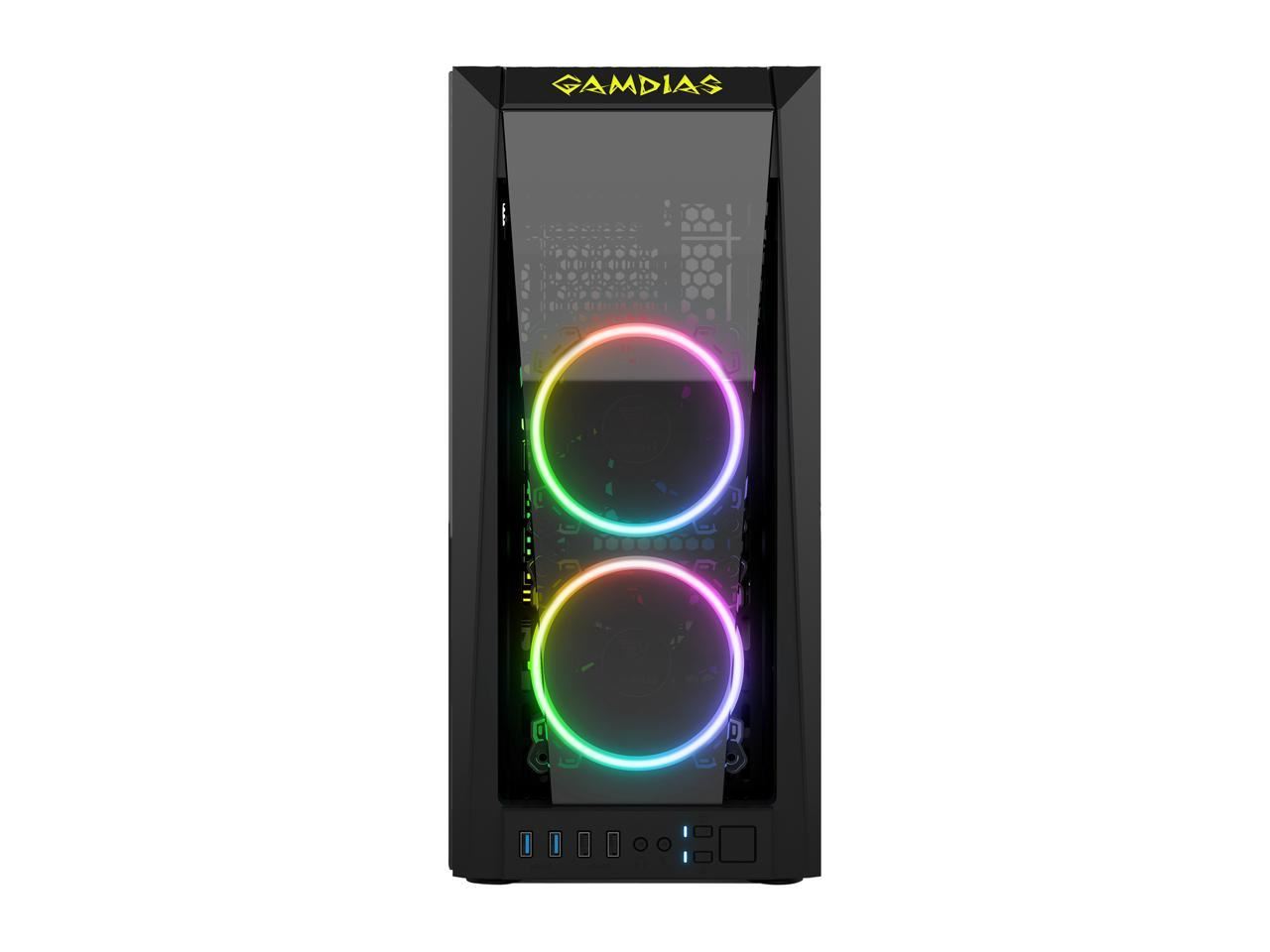 Carcasa Gamdias Talos M1A neagra, SPCC Steel and ABS, ATX Mid Tower Case, interior vopsit negru, 2x3.5” (intern), 2x2.5” (intern), fata – 2x 120mm adressable RGB LED fans (inclus) / 2x 140mm (optional), spate – 1x 120/140mm fan (optional), tavan – 2x 120/140mm fans (optional), 2x USB 3.0, 2x USB 2.0, HD Audio, 1x RGB controller (se mai pot adauga 2 ventilatoare optionale), ATX/Micro-ATX/Mini-ITX, sloturi expansiune: x7+2, inaltime maxima cooler procesor: 180mm, lungime maxima placa video: 350mm, suport radiatoare water cooling: fata – radiator 280/360mm, spate – radiator 120/140mm, dimensiuni ((LxWxH): 448x210x466mm, greutate: 7.15kg