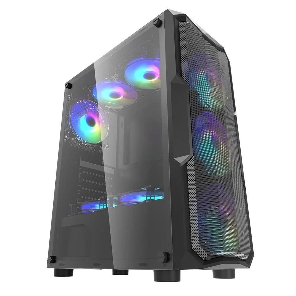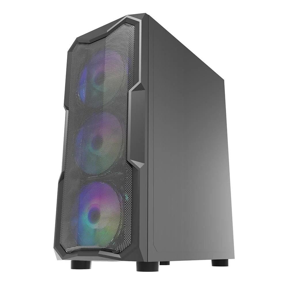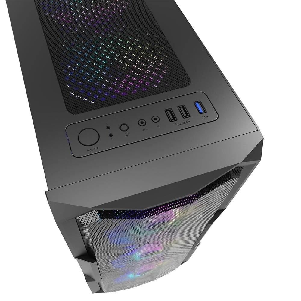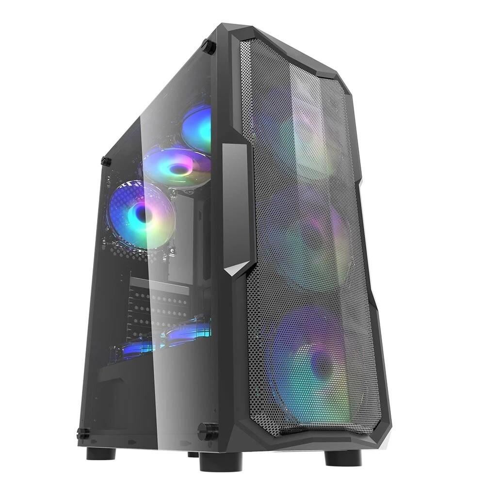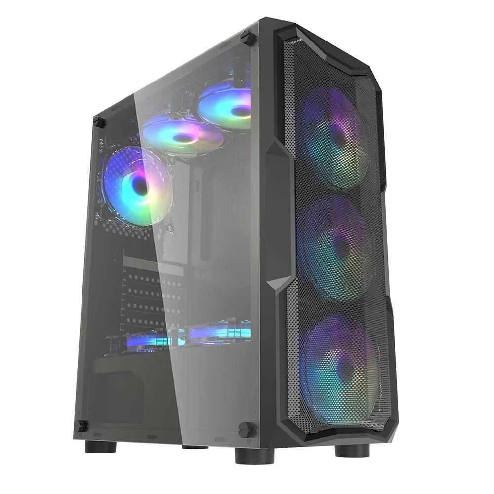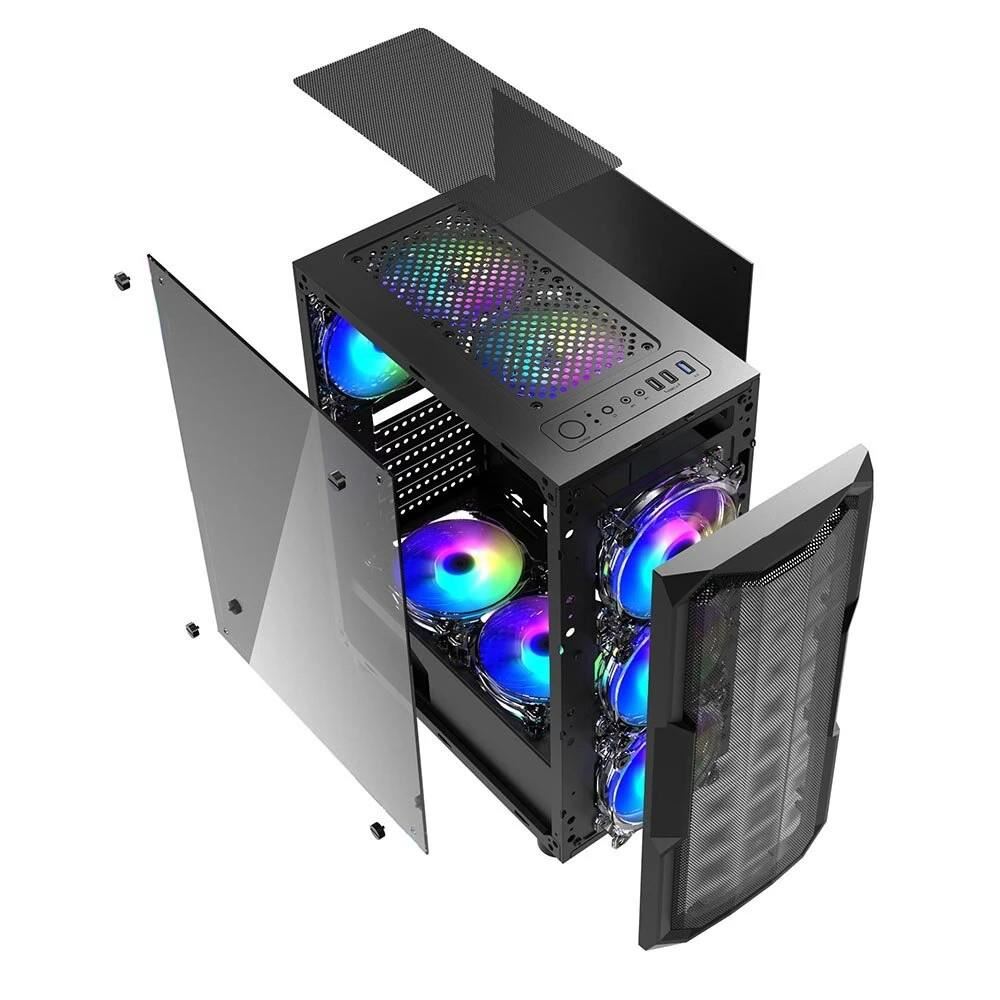 Carcasa Inaza Aquarius Mesh neagra, SPCC Steel ATX Mid Tower, fara sursa (tip ATX, montata jos), interior vopsit negru, 2x2.5” (intern), 2x 3.5” (intern), fata – 3x 120mm LED aRGB fans (inclus), spate – 1x 120mm LED aRGB fan (inclus), tavan – 2x 120mm fans (optional), podea – 2x 120mm fans(optional), design premium cu panou frontal din mesh metalic si panou lateral din sticla securizata, 1x USB 3.0, 2x USB 2.0, HD Audio, ATX / microATX / Mini-ITX, sloturi expansiune: x7, inaltime maxima cooler procesor: 165mm, lungime maxima placa video: 320mm, suport radiatoare water cooling: fata – 1x 240mm, tavan – 1x 240mm, dimensiuni (HxWxD): 450x195x370mm, greutate: 5.5kg