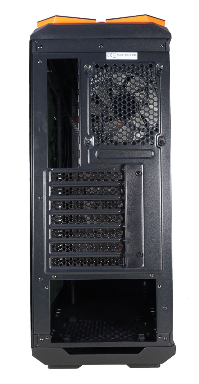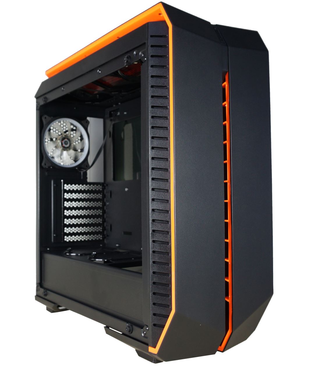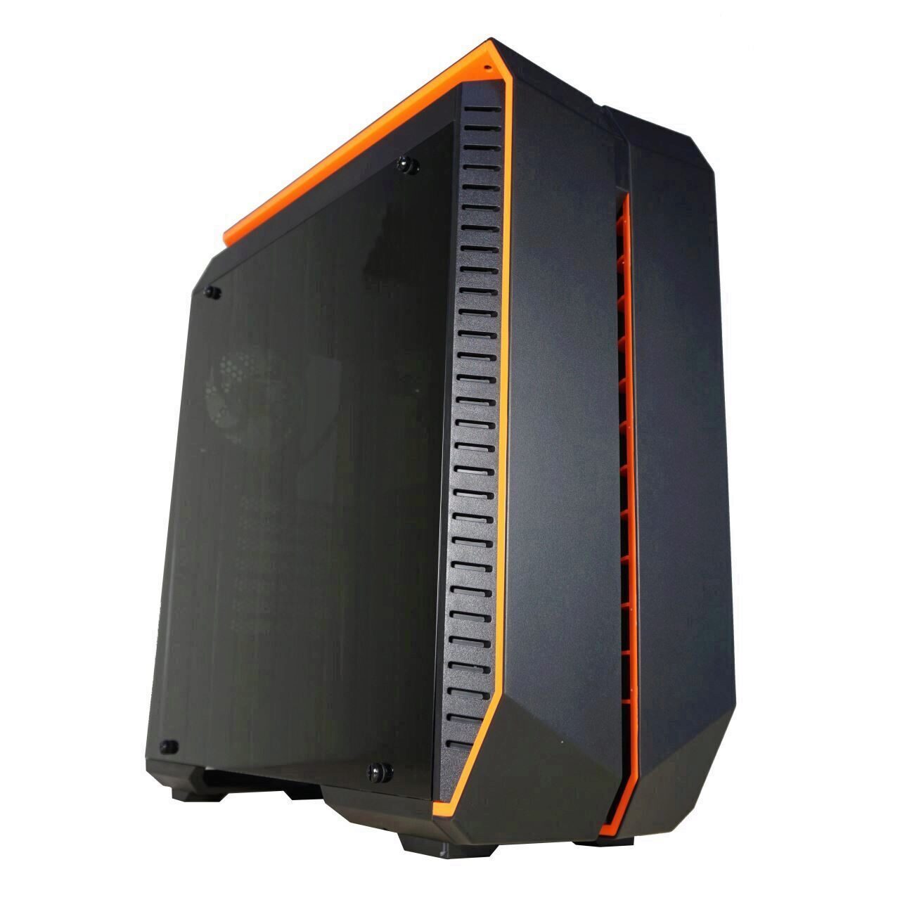 Inaza Devastator Black/Orange, SECC Steel ATX Mid Tower, fara sursa (tip ATX, montata jos), interior vopsit negru, 2x2.5” (intern), 2x3.5”/2.5” (intern), fata – 1x 120mm RGB LED fan (inclus) si 2x 120mm fan (optional) / 2x 140mm fans (optional), spate – 1x 120mm RGB LED fan (inclus), tavan – 1x 120mm fan (inclus) sau 2x 120/140mm fan (optional), design premium cu panouri laterale din sticla securizata, controller RGB cu posibilitatea montarii pana la 6 ventilatoare, permite diferite efecte de iluminare, filtre de praf incluse, 2x USB 3.0, HD Audio, ATX / micro ATX, sloturi expansiune: x7, inaltime maxima cooler procesor: 165mm, lungime maxima placa video: 400mm, lungime maxima sursa: 270mm, dimensiuni (WxHxD): 200x529x500mm