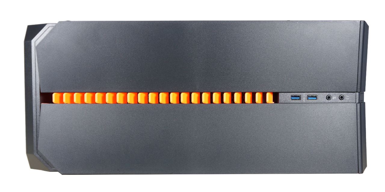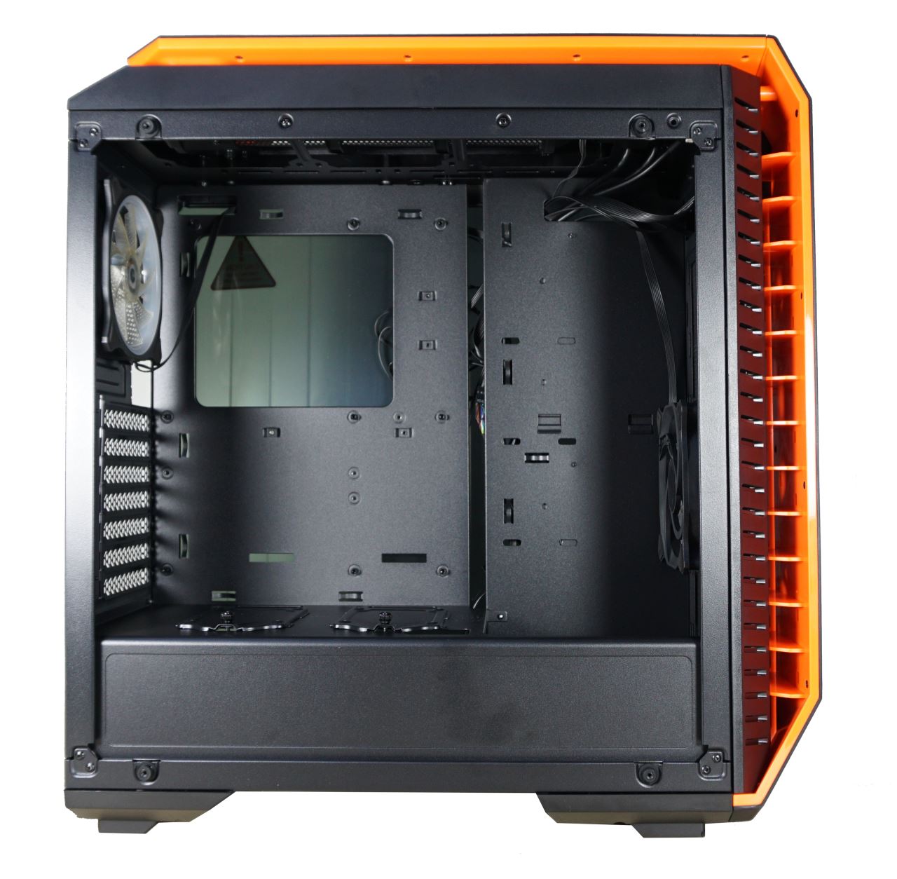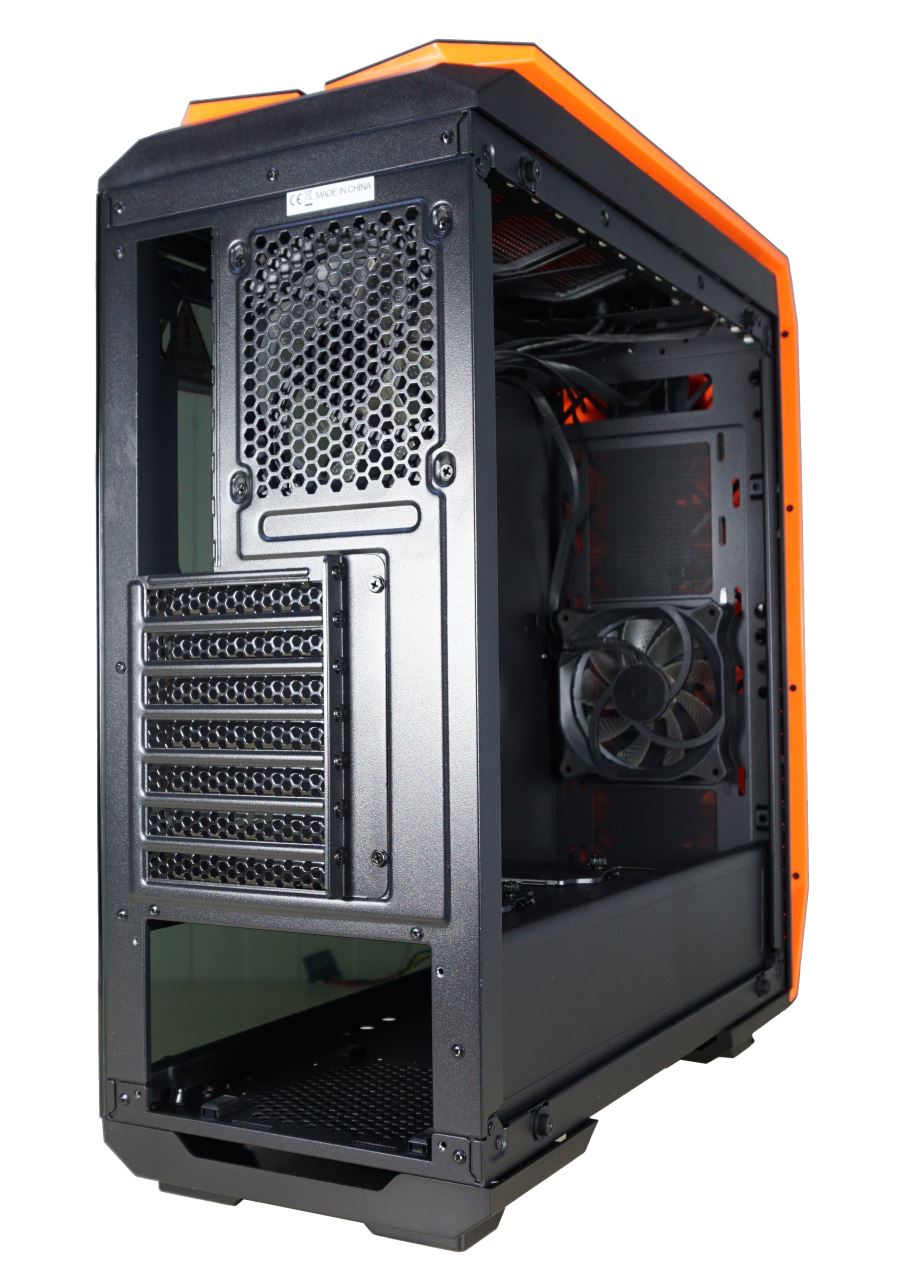 Inaza Devastator Black/Orange, SECC Steel ATX Mid Tower, fara sursa (tip ATX, montata jos), interior vopsit negru, 2x2.5” (intern), 2x3.5”/2.5” (intern), fata – 1x 120mm RGB LED fan (inclus) si 2x 120mm fan (optional) / 2x 140mm fans (optional), spate – 1x 120mm RGB LED fan (inclus), tavan – 1x 120mm fan (inclus) sau 2x 120/140mm fan (optional), design premium cu panouri laterale din sticla securizata, controller RGB cu posibilitatea montarii pana la 6 ventilatoare, permite diferite efecte de iluminare, filtre de praf incluse, 2x USB 3.0, HD Audio, ATX / micro ATX, sloturi expansiune: x7, inaltime maxima cooler procesor: 165mm, lungime maxima placa video: 400mm, lungime maxima sursa: 270mm, dimensiuni (WxHxD): 200x529x500mm