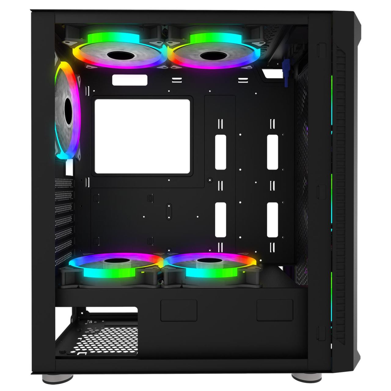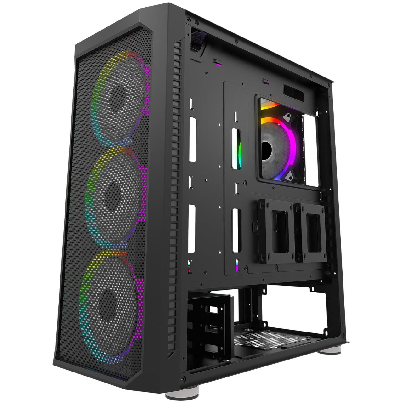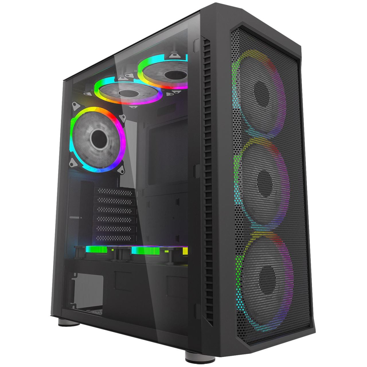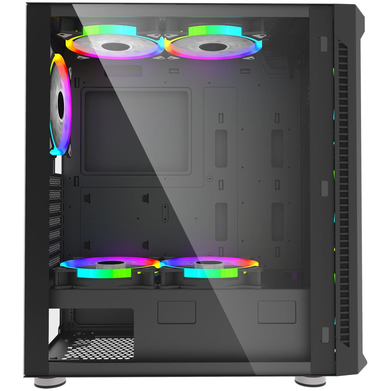 Carcasa Inaza Tanker Black neagra, SPCC Steel ATX Mid Tower, fara sursa (tip ATX, montata jos), interior vopsit negru, 4x2.5” (intern), 3x 3.5” (intern), fata – 3x 120mm LED aRGB fans (inclus) / 3x 140mm fans (optional), spate – 1x 120mm LED aRGB fan (inclus), tavan – 2x 120/140mm fans (optional), podea – 2x 120mm fan (optional), design premium cu panou frontal din mesh metalic si panou lateral din sticla securizata, 1x USB 3.0, 2x USB 2.0, HD Audio, E-ATX / ATX / microATX / Mini-ITX, sloturi expansiune: x7, inaltime maxima cooler procesor: 185mm, lungime maxima placa video: 385mm, suport radiatoare water cooling: fata – 1x 360mm, tavan – 1x 280mm, dimensiuni (HxWxD): 485x230x450mm, greutate: 8.5kg
