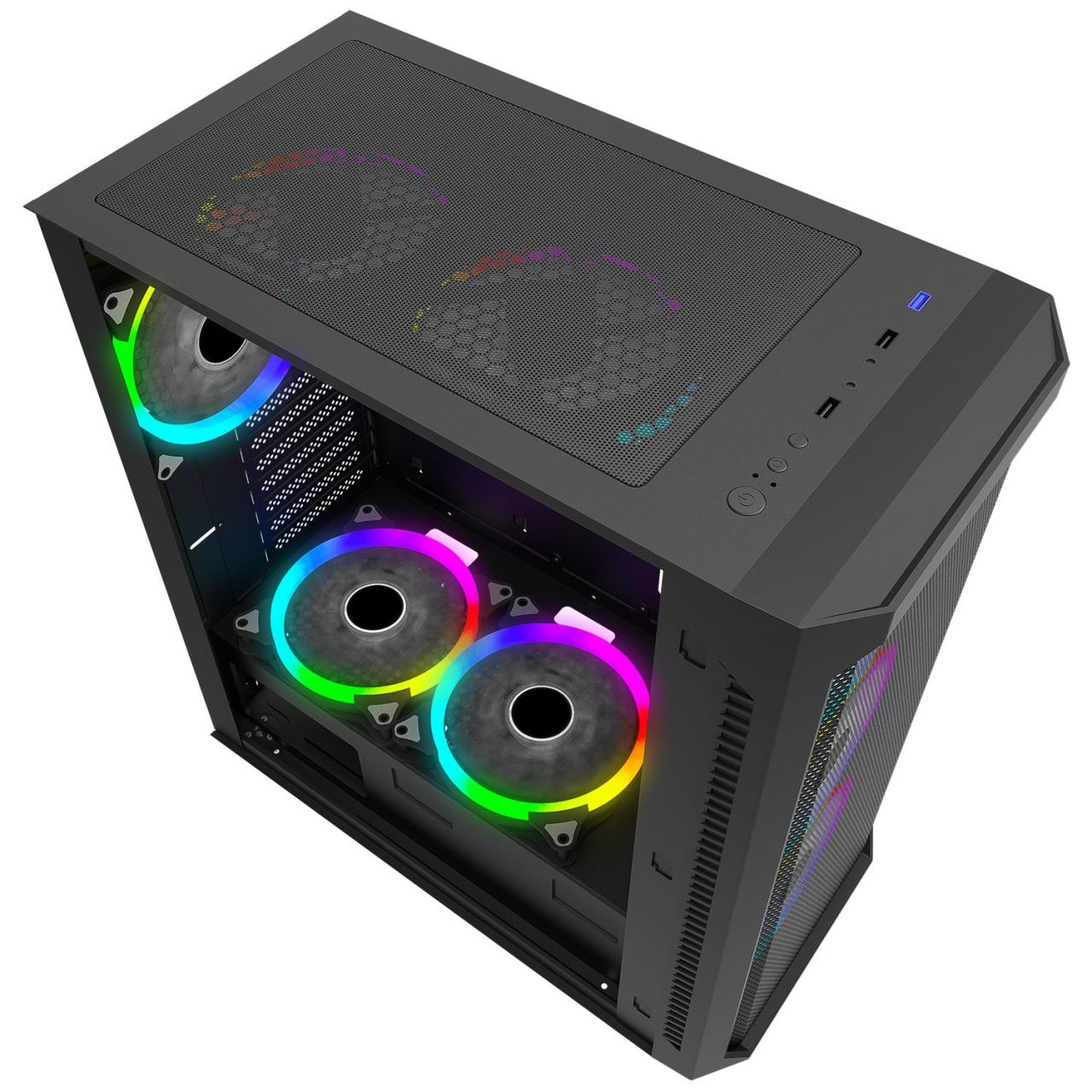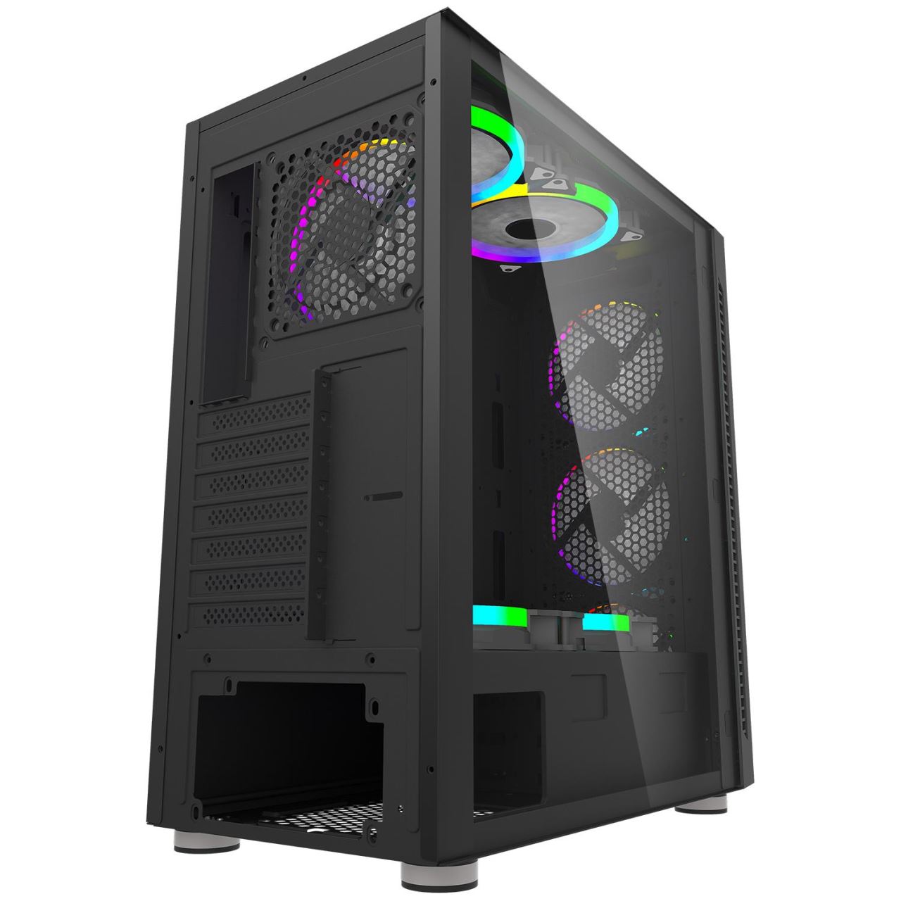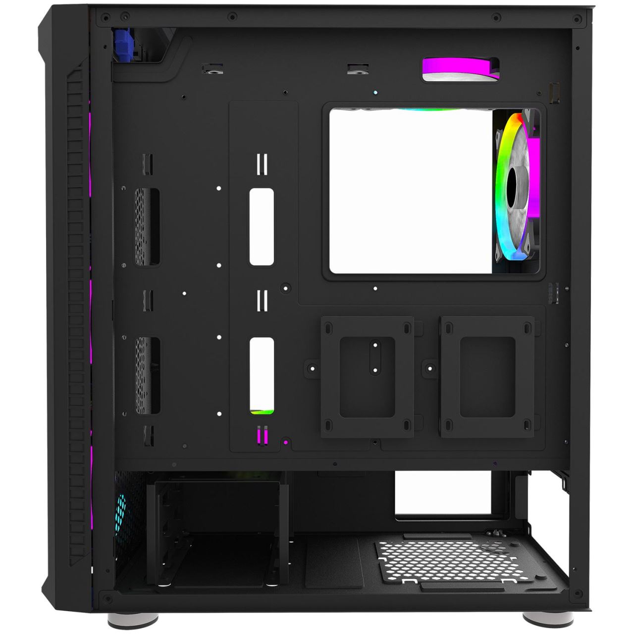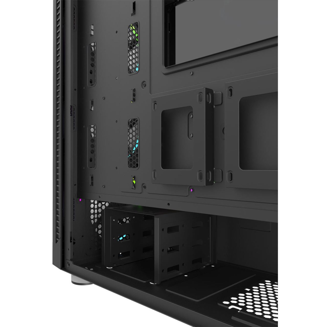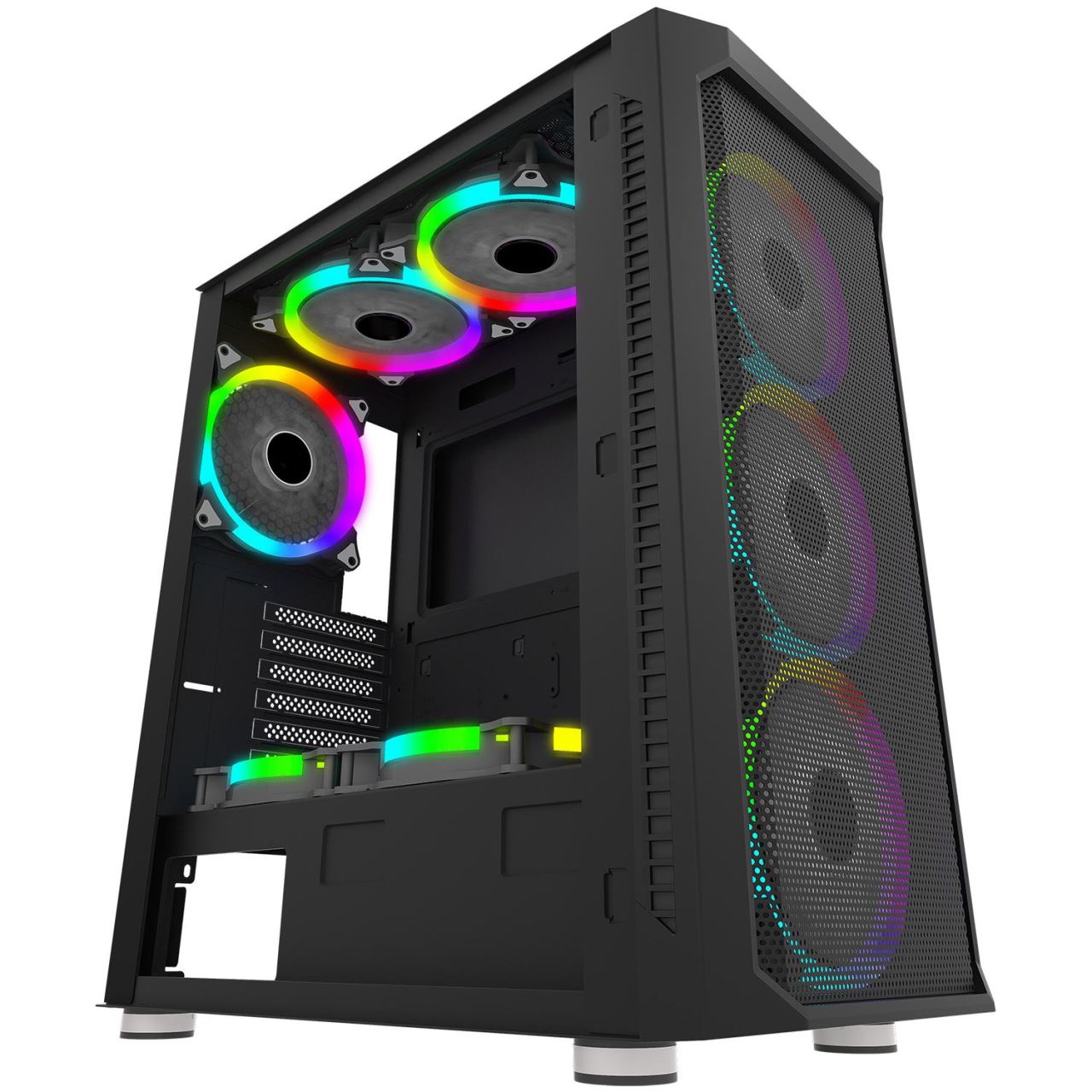 Carcasa Inaza Tanker Black neagra, SPCC Steel ATX Mid Tower, fara sursa (tip ATX, montata jos), interior vopsit negru, 4x2.5” (intern), 3x 3.5” (intern), fata – 3x 120mm LED aRGB fans (inclus) / 3x 140mm fans (optional), spate – 1x 120mm LED aRGB fan (inclus), tavan – 2x 120/140mm fans (optional), podea – 2x 120mm fan (optional), design premium cu panou frontal din mesh metalic si panou lateral din sticla securizata, 1x USB 3.0, 2x USB 2.0, HD Audio, E-ATX / ATX / microATX / Mini-ITX, sloturi expansiune: x7, inaltime maxima cooler procesor: 185mm, lungime maxima placa video: 385mm, suport radiatoare water cooling: fata – 1x 360mm, tavan – 1x 280mm, dimensiuni (HxWxD): 485x230x450mm, greutate: 8.5kg