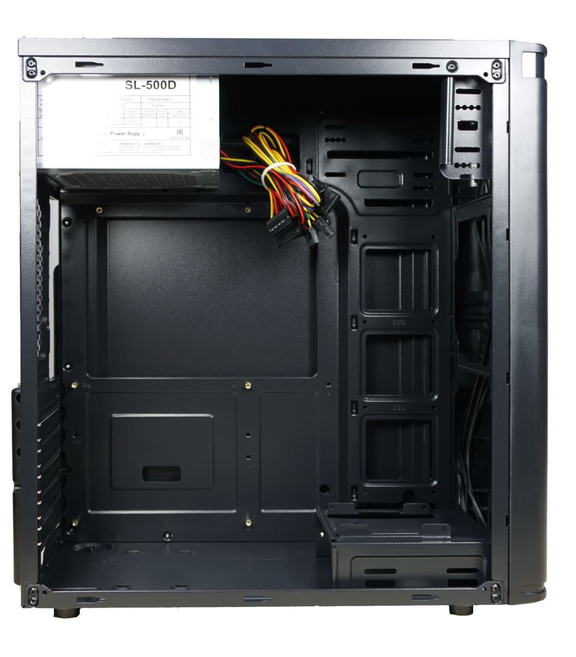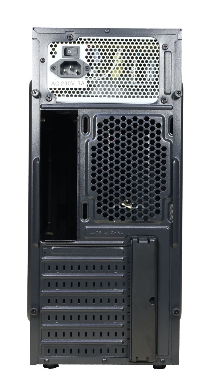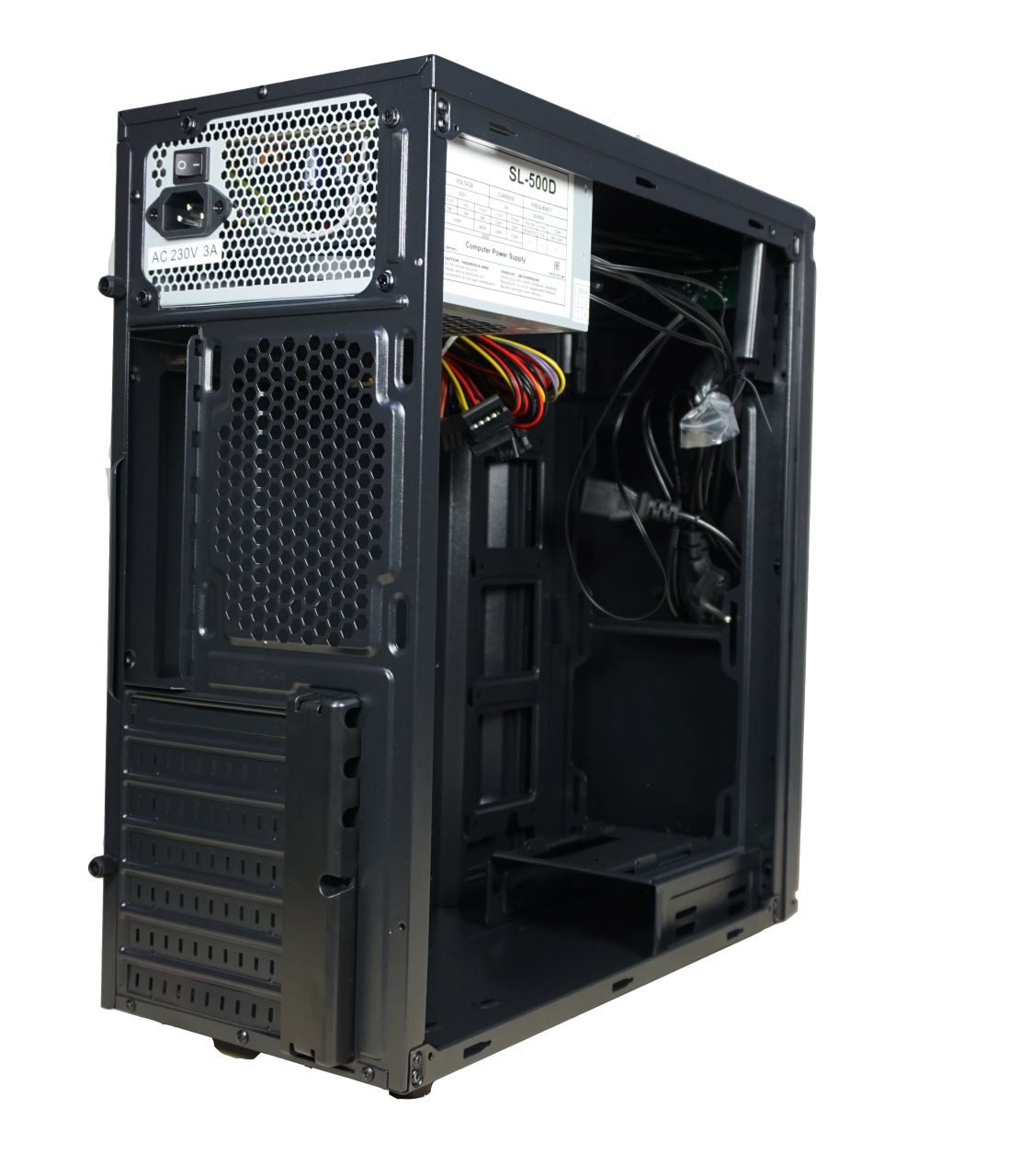 Inter-Tech K-05 Case With 500W PSU, SECC Steel ATX Mid Tower Case, cu sursa 500W (tip ATX, montata sus), interior vopsit negru, 1x5.25” (extern), 1x3.5” (intern), 3x2.5” (intern), fata – 2x 120mm (optional), spate – 1x 120mm fan (optional), lateral – 1x 120mm fans (optional), 2x USB 2.0, HD Audio, ATX / microATX, sloturi expansiune: x7, inaltime maxima cooler procesor: 150mm, lungime maxima placa video: 320mm, dimensiuni (h/w/d): 425 x 180 x 385mm
