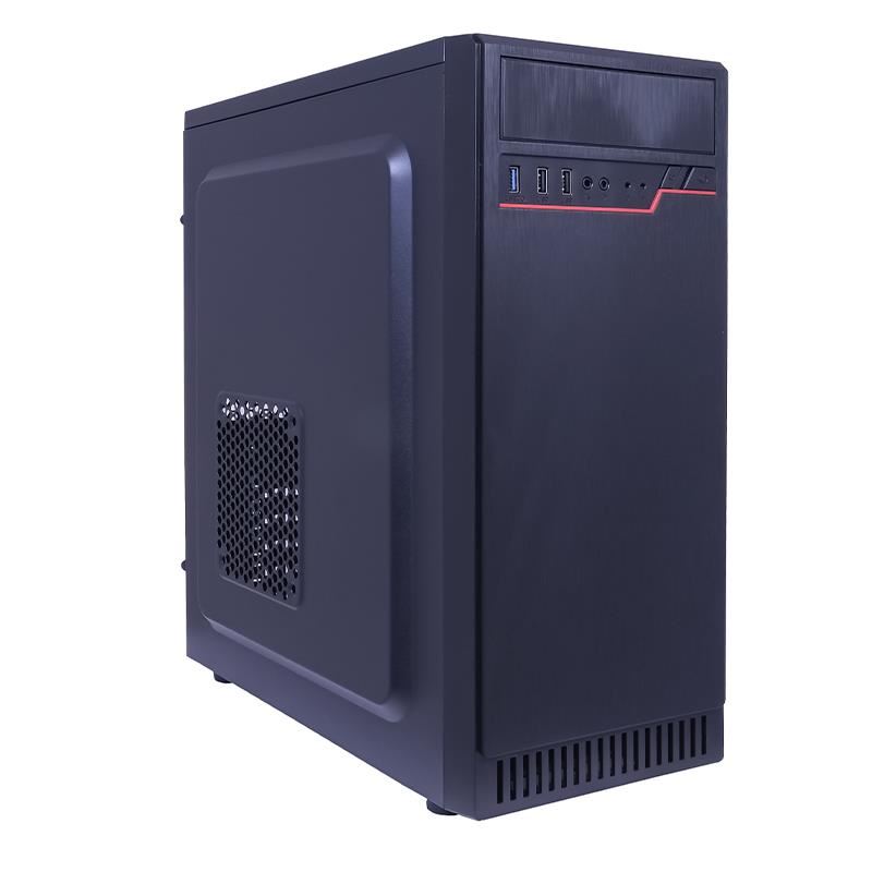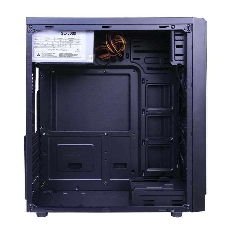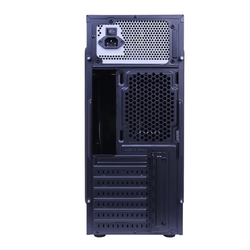 Carcasa Inter-Tech K-12 cu sursa 500W, SECC Steel ATX Mid Tower Case, cu sursa 500W (tip ATX, montata sus), interior vopsit negru, 1x5.25” (extern), 1x3.5” (intern), 3x2.5” (intern), fata – 2x 120mm (optional), spate – 1x 120mm fan (optional), lateral – 1x 120mm fans (optional), 2x USB 2.0, 1x USB 3.0, HD Audio, ATX / microATX, sloturi expansiune: x7, inaltime maxima cooler procesor: 150mm, lungime maxima placa video: 320mm, dimensiuni (h/w/d): 425 x 180 x 385mm