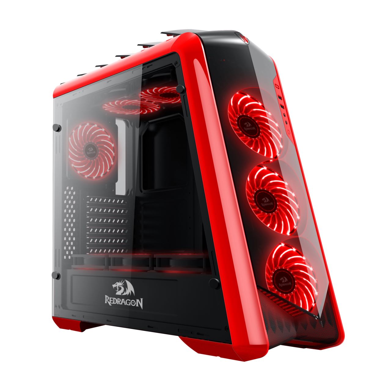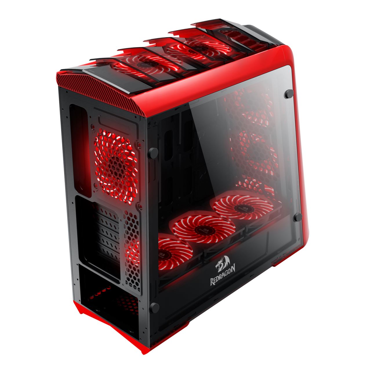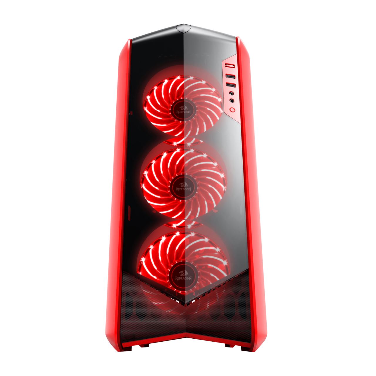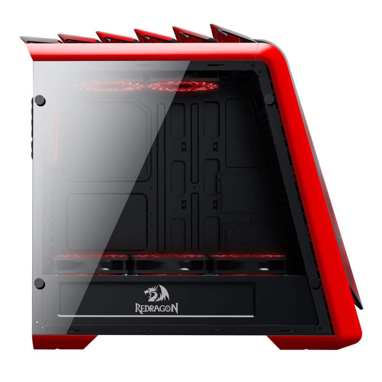 Redragon Jetfire Black/Red, SECC Steel ATX Mid Tower, fara sursa (tip ATX, montata jos), interior vopsit negru, 2x3.5” (intern), 2x2.5” (intern), design tool-less, fata – 3x 120mm RGB LED fans (inclus), spate – 1x 120mm RGB LED fan (inclus), tavan - 2x 120mm fans (optional), podea – 3x 120mm fans (optional), design premium cu panouri laterale din sticla securizata, controller RGB ce permite conectarea a maxim 8 ventilatoare si 2 benzi de LED-uri, diverse efecte de iluminare, 1x USB 3.0, 2x USB 2.0, HD Audio, ATX / microATX / Mini-ITX, sloturi expansiune: x7, inaltime maxima cooler procesor: 160mm, lungime maxima placa video: 360mm, dimensiuni (HxWxD): 510x215x510mm