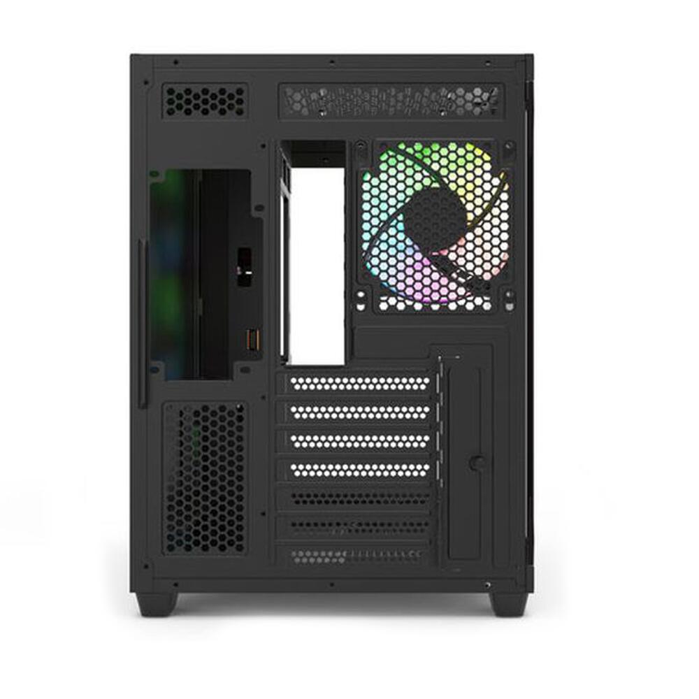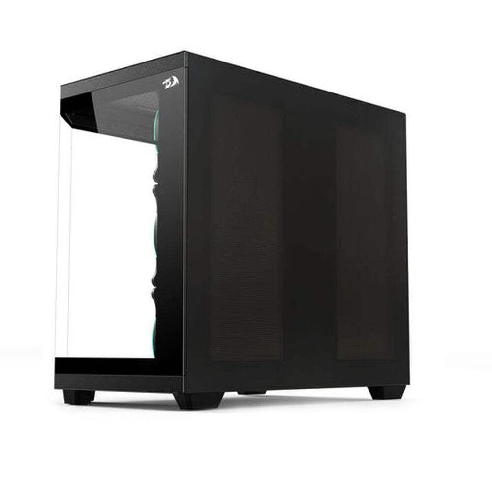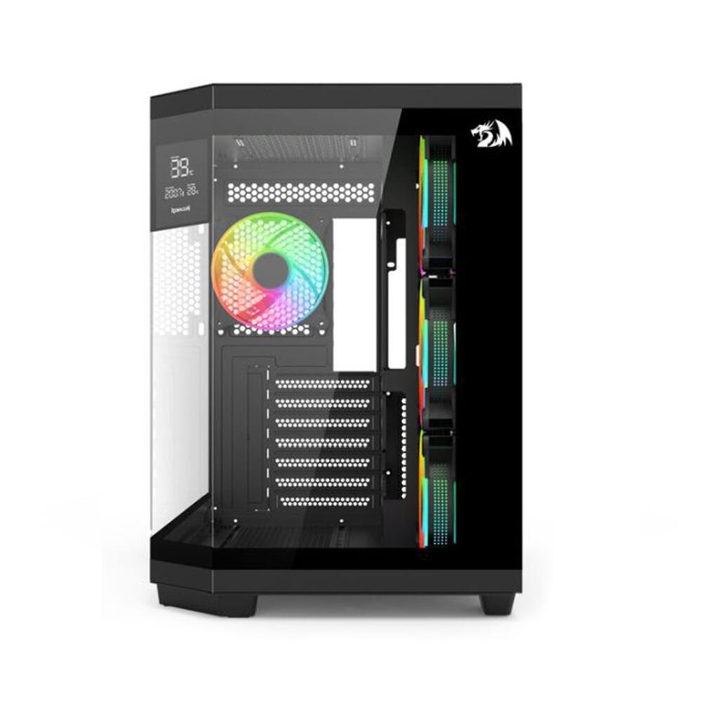 Carcasa Redragon Vision neagra, SPCC Steel (0.8mm) ATX Mid Tower, design dual chamber, fara sursa (tip ATX, montata sus), interior vopsit negru, 2x3.5” (intern), 2x2.5” (intern), design tool-less, Mainboard – 3x 120mm aRGB LED fans (inclus) / 2x 140mm fans (optional), spate – 1x 120mm aRGB LED fans (inclus), tavan – 3x 120mm fans (optional), podea – 3x 120mm fans (optional), 1x USB 3.0, 1x USB 2.0, 1x USB Type-C, HD Audio, ATX / microATX / ITX, design premium tip panorama cu panou lateral si frontal din sticla securizata, include display pentru afisarea diferitelor informatii, sloturi expansiune: x7, inaltime maxima cooler procesor: 163mm, lungime maxima placa video: 410mm (260mm daca este montat sistem de racire pe lichi in parta frontala), supoert radiatoare water cooling: Mainboard – 1x 240/280mm, tavan – 1x 360mm, podea – 1x 240mm, spate – 1x 120mm, dimensiuni (HxWxD): 400x350x426mm, greutate: 7.1kg