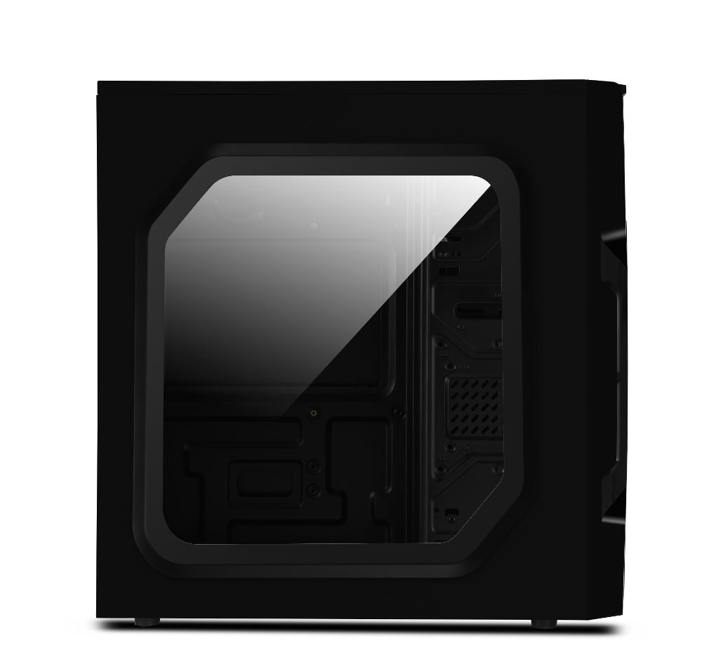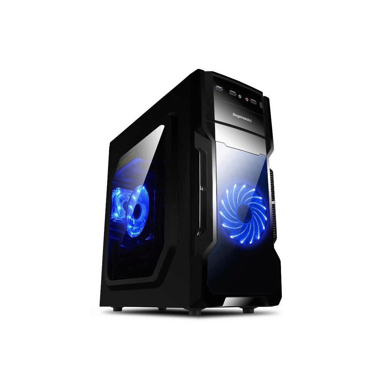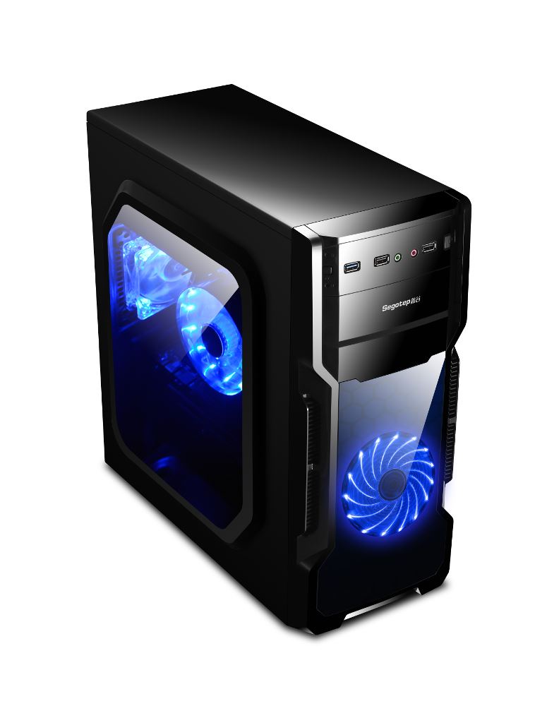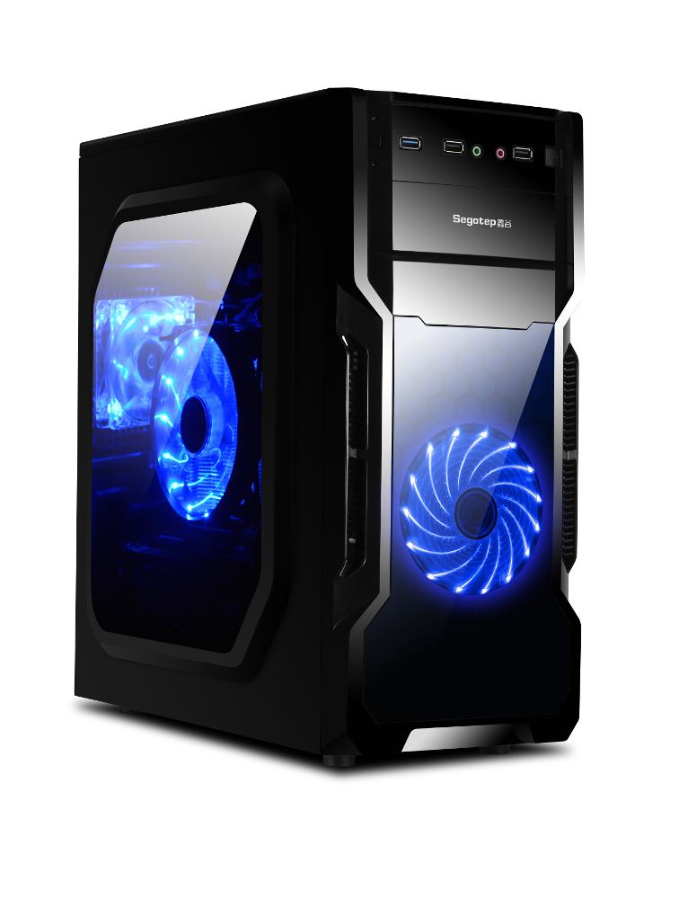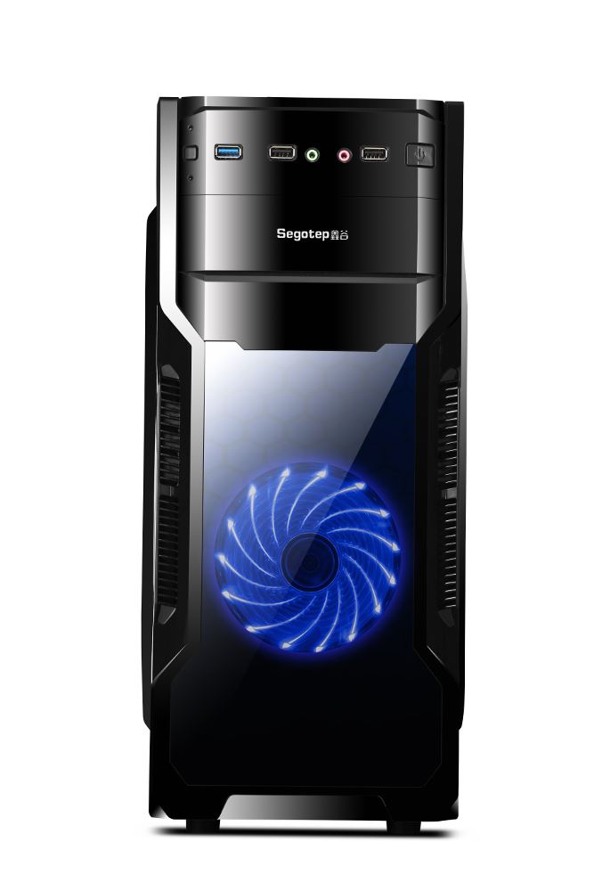 Segotep And 5 Black Case, SPCC Steel ATX Mid Tower, fara sursa (montata sus), interior vopsit negru, 1x 5.25”(extern), 2x 2.5”(intern), 2x 3.5” (intern), spate – 1x 120mm (optional), fata – 1x 120mm Blue LED Fan (inclus), 1x USB3.0, 2x USB 2.0, HD Audio, ATX / Micro ATX, panou lateral din tabla si plexiglas si fata din plexiglas, sloturi expansiune: x7, inaltime maxima cooler procesor: 145mm, lungima maxima placa video: 230mm, dimensiuni (WxHxD): 178x422x411mm