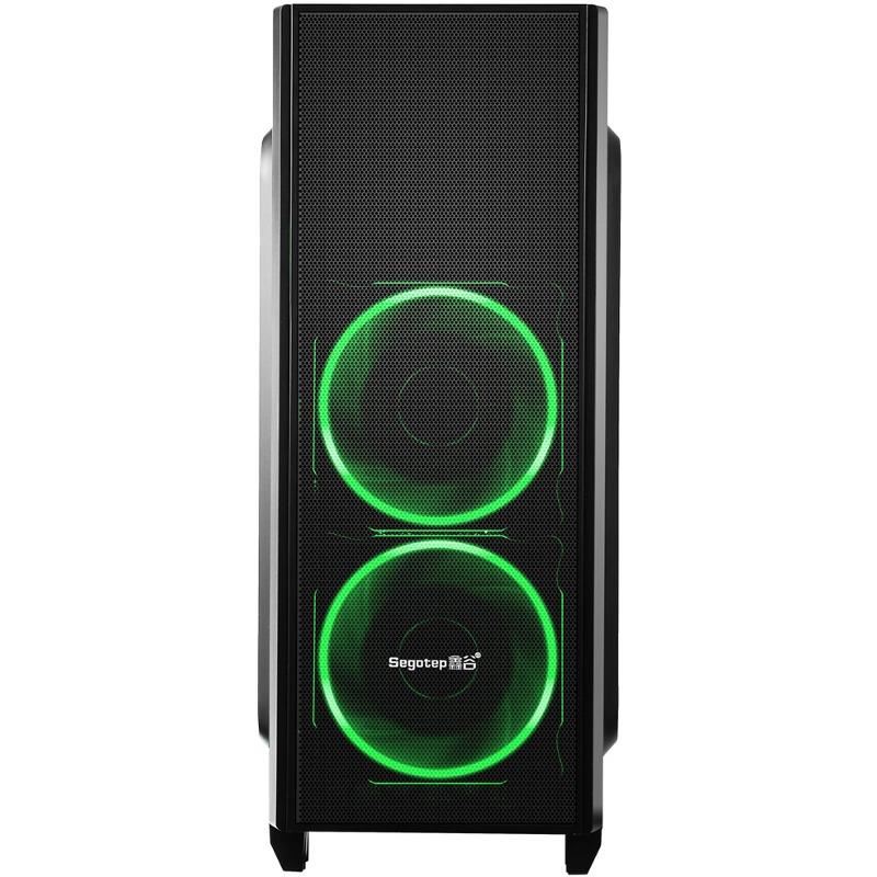 Segotep Halo 5 Black, SPCC Steel ATX Mid Tower, fara sursa, (tip ATX, montata jos), interior vopsit negru, 2x 5.25" (intern), 3x 3.5" (intern), fata - 2x 120/140mm fans (optional), spate - 1x 120mm fan (optional), tavan - 2x 120mm fans (optional), podea - 2x 120mm fans (optional), filtre de praf pentru tavan si podea incluse, panou lateral transparent, 1x USB 3.0, 2x USB 2.0, HD Audio, ATX / microATX / miniITX, sloturi expansiune: x7, inaltime maxima cooler procesor: 165mm, lungime maxima placa video: 350mm, dimensiuni (HxWxD): 485x200x410mm