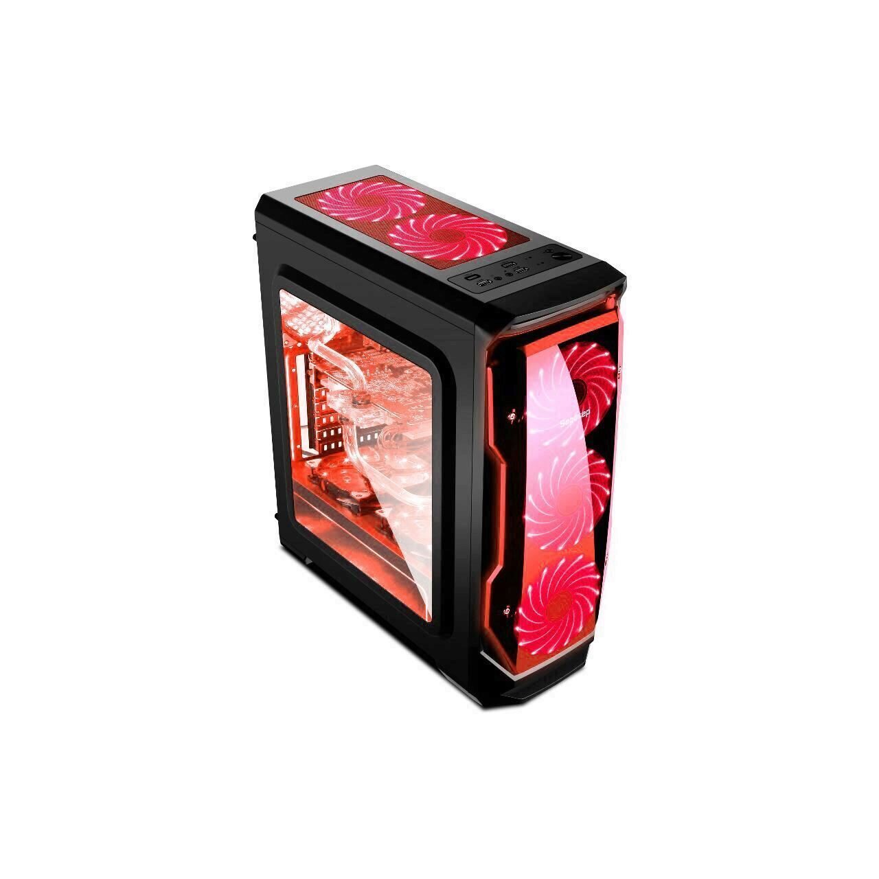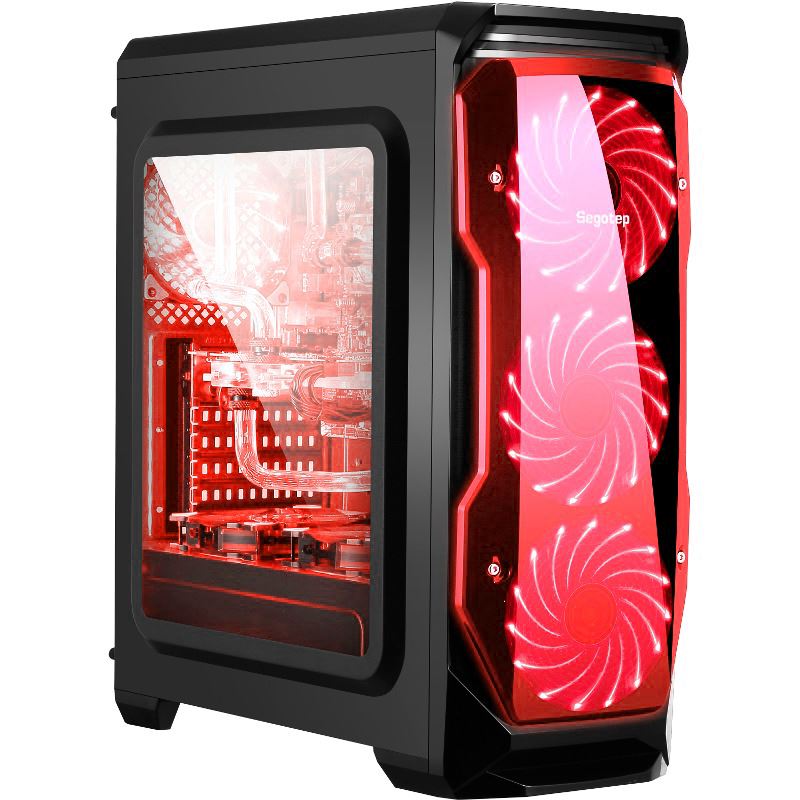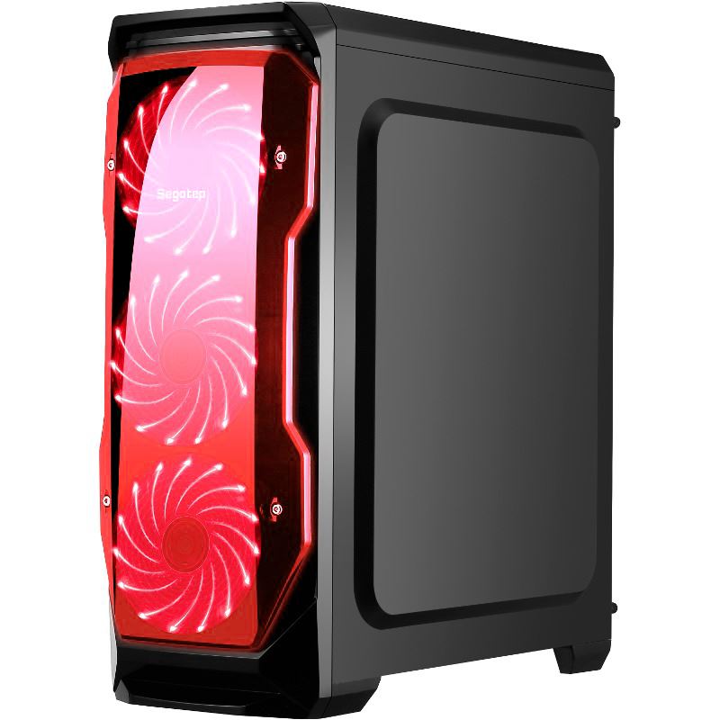 Segotep Halo Black Red Fan, SGCC Steel ATX Mid Tower, fara sursa (tip ATX, montata jos), interior vopsit negru, 3x3.5” (intern), 3x2.5” (intern), design tool-less, fata – 2x 120mm Polar Wind Red LED fans (inclus) si 1x 120mm fan (optional), spate – 1x 120mm fan (optional), tavan – 2x 120mm fans (optional), intern – 2x 120mm fans (optional), 1x USB 3.0, 2x USB 2.0, HD Audio, ATX / microATX, sloturi expansiune: x7, inaltime maxima cooler procesor: 155mm, lungime maxima placa video: 350mm, dimensiuni (HxWxD): 485x200x420mm