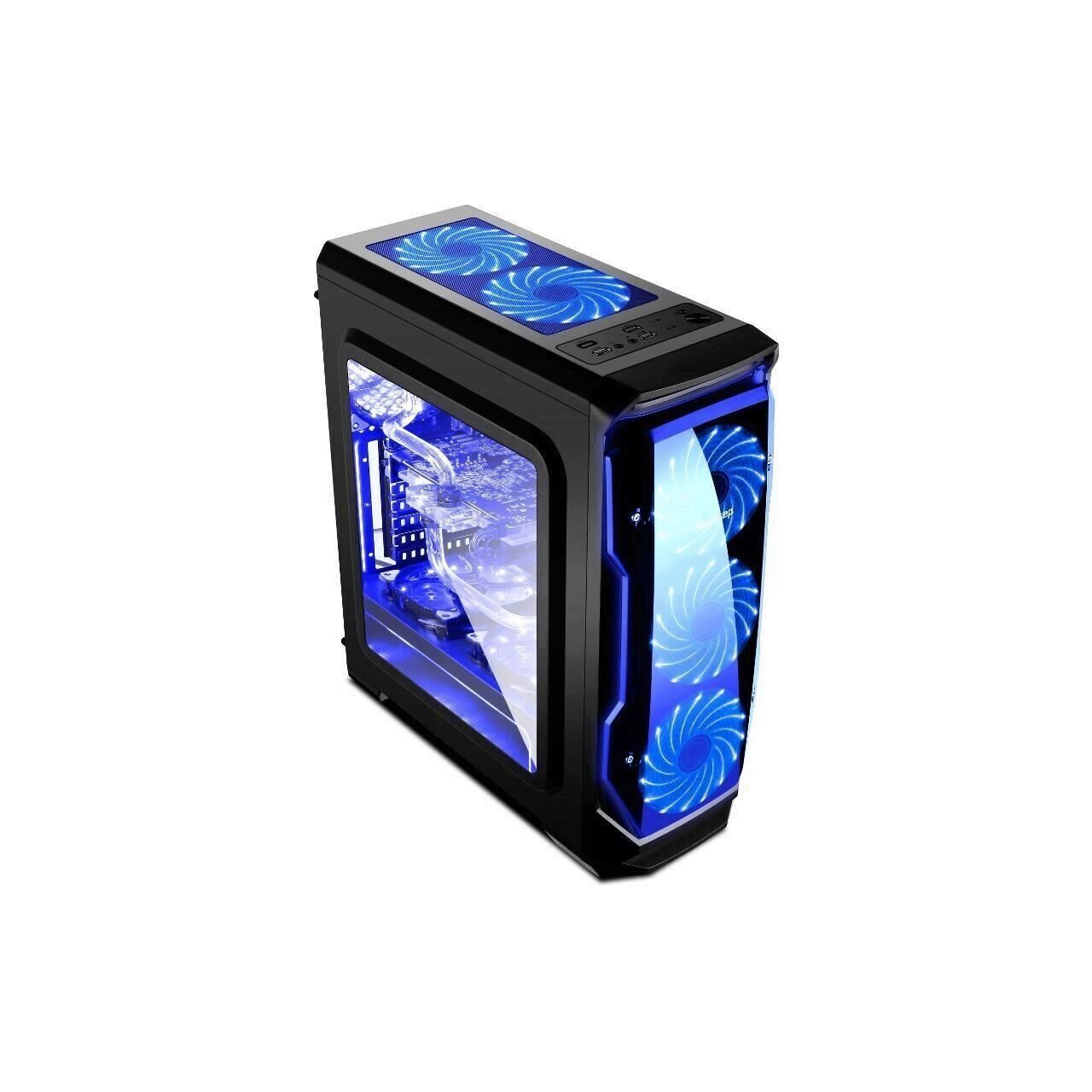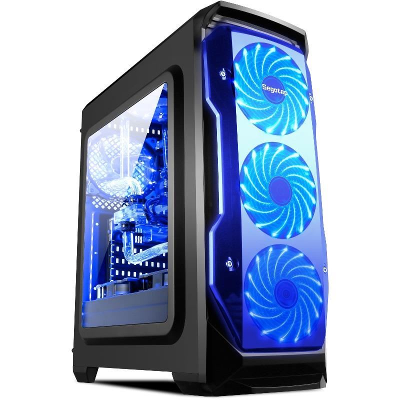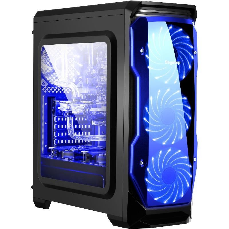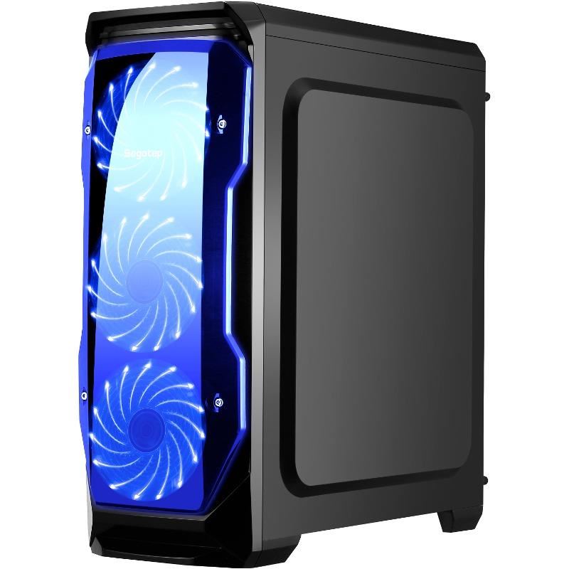Segotep Halo Black, SGCC Steel ATX Mid Tower, fara sursa (tip ATX, montata jos), interior vopsit negru, 3x3.5” (intern), 3x2.5” (intern), design tool-less, fata – 2x 120mm Polar Wind Blue LED fans (inclus) si 1x 120mm fan (optional), spate – 1x 120mm fan (optional), tavan – 2x 120mm fans (optional), intern – 2x 120mm fans (optional), 1x USB 3.0, 2x USB 2.0, HD Audio, ATX / microATX, sloturi expansiune: x7, inaltime maxima cooler procesor: 155mm, lungime maxima placa video: 350mm, dimensiuni (HxWxD): 485x200x420mm
