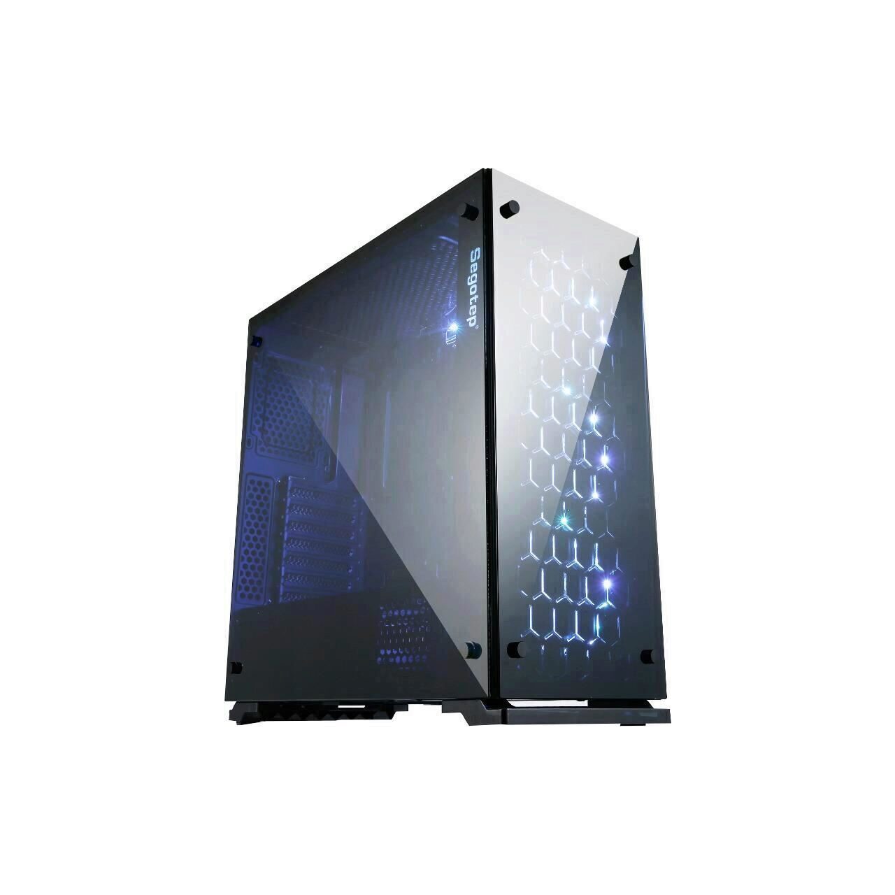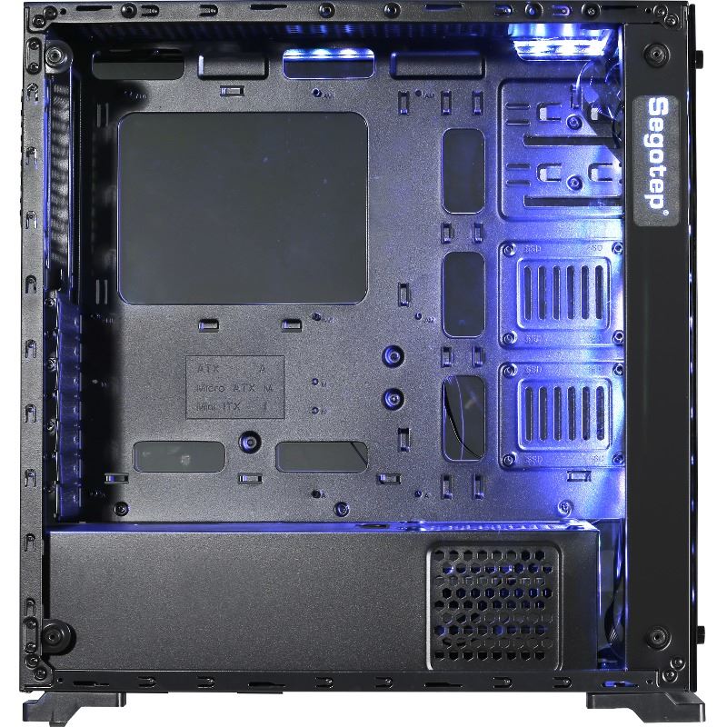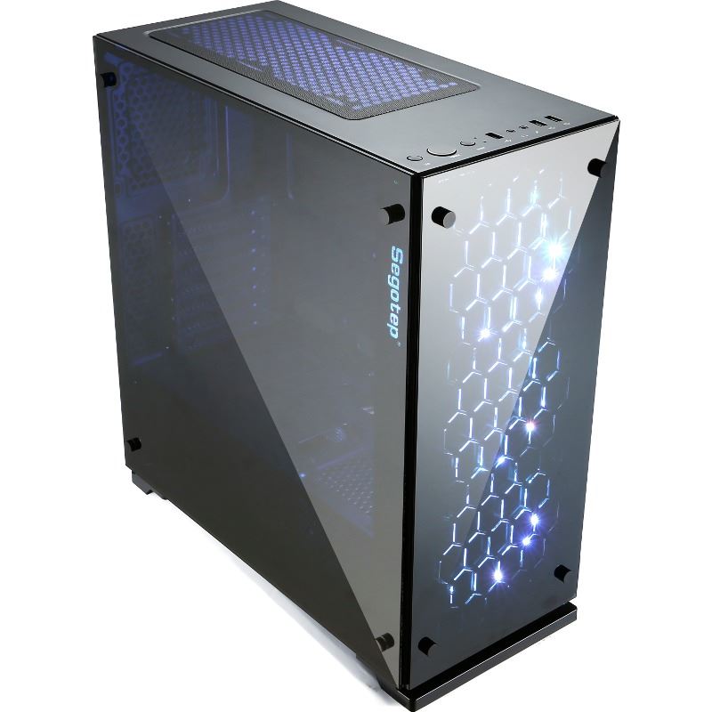 Segotep SG-K7 Black, SECC Steel ATX Mid Tower, fara sursa (tip ATX, montata jos), interior vopsit negru, 2x3.5” (intern), 2x2.5” (intern), design tool-less, fata – 3x 120mm RGB LED fans (inclus), spate – 1x 120/mm fan (inclus), tavan – 2x 120mm fans (optional), design premium cu panouri laterale si frontal din sticla securizata, controller RGB care permite conectarea pana la 8 ventilatoare si 2 benzi de LED-uri, diverse efecte de iluminare, 1x USB 3.0, 2x USB 2.0, HD Audio, ATX / microATX / Mini-ITX, sloturi expansiune: x7, inaltime maxima cooler procesor: 160mm, lungime maxima placa video: 240mm, dimensiuni (HxWxD): 467x215x440mm