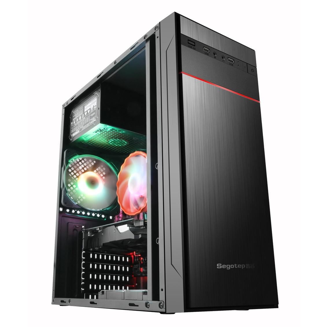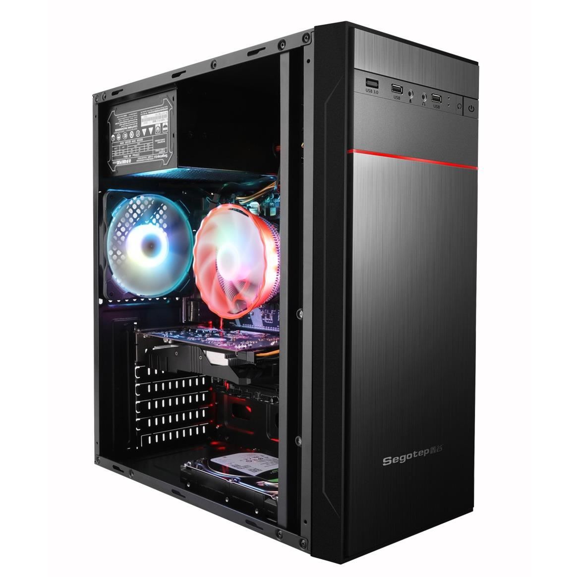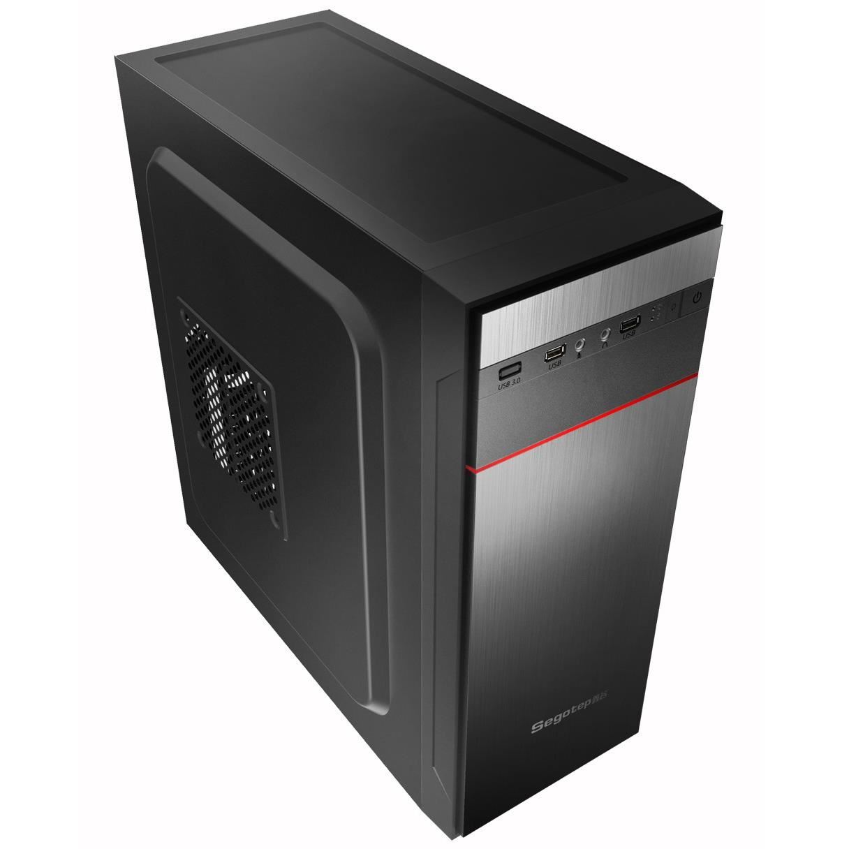 Carcasa Segotep Knight 01 neagra cu sursa de 500W, SECC Steel ATX Mid Tower, cu sursa de 500W (tip ATX, montata sus), interior vopsit negru, 1x 3.5" (intern), 2x 2.5 (intern), fata - 2x 120mm (optional), spate - 1x 120mm cu pozitie ajustabila (optional), 2x USB 2.0, HD Audio, ATX / microATX / Mini-ITX, sloturi expansiune: x7, inaltime maxima cooler procesor: 155mm, lungime maxima placa video: 240mm, dimensiuni: 412x200x376mm