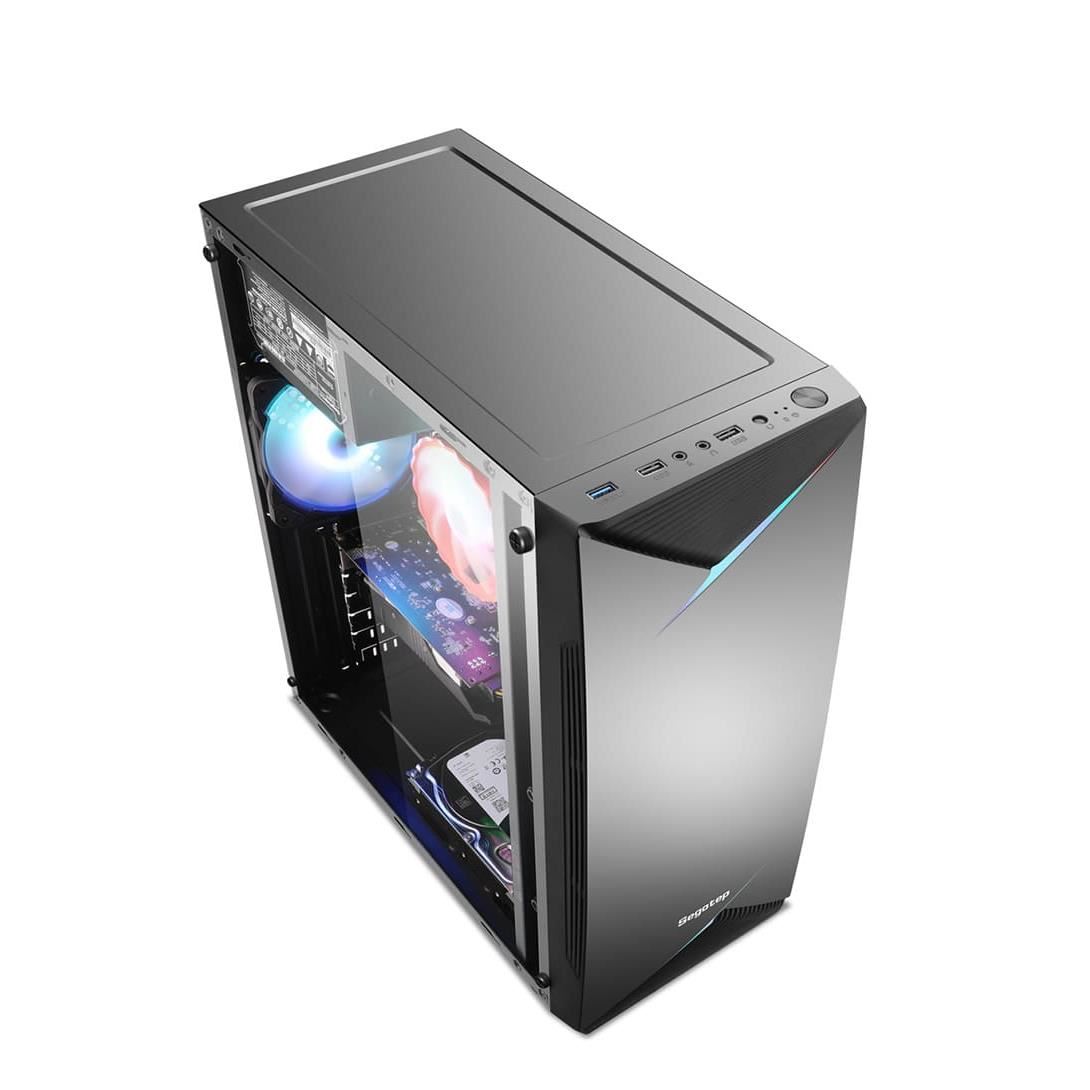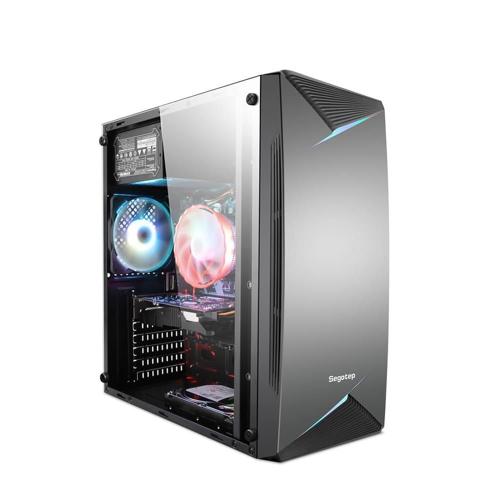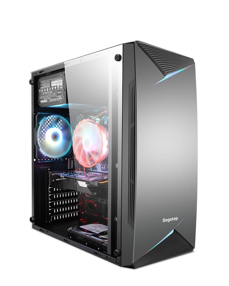 Carcasa Segotep Knight 03 neagra, SECC Steel ATX Mid Tower, fara sursa (tip ATX, montata sus), interior vopsit negru, 2x 3.5" (intern), 2x 2.5 (intern), fata - 2x 120mm (optional), spate - 1x 120mm cu pozitie ajustabila (optional), 2x USB 2.0, 1x USB 3.0, HD Audio, ATX / microATX / Mini-ITX, sloturi expansiune: x7, inaltime maxima cooler procesor: 155mm, lungime maxima placa video: 300mm, dimensiuni: 395x200x412mm