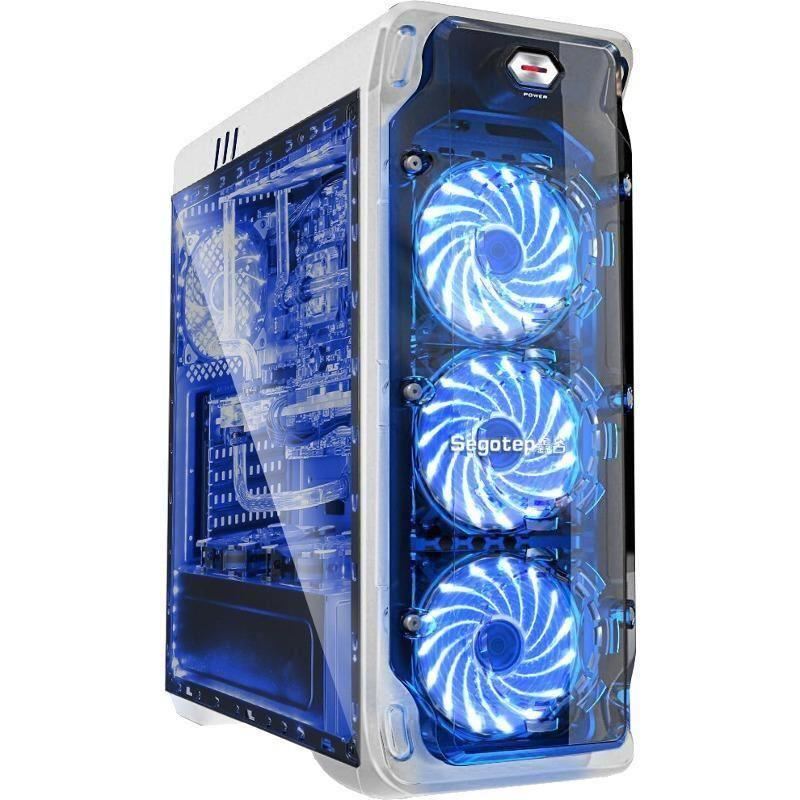 Carcasa Segotep LUX II V2 alba, SECC Steel ATX Mid Tower, fara sursa (tip ATX, montata jos), power cover, filtre de praf pentru tavan si sursa, interior vopsit negru, 2x3.5” (intern), 2x2.5” (intern), fata – 3x 120mm Blue LED fans (incluse), spate – 1x 120mm Blue LED fan (inclus), tavan – 2x 120/140mm fans (optional, pozitie ajustabila), power cover – 2x 120mm fans (optional), design premium cu panou lateral transparent in totalitate, 1x USB 3.0, 2x USB 2.0, HD Audio, ATX / microATX / Mini-ITX, sloturi expansiune: x7, inaltime maxima cooler procesor: 155mm, lungime maxima placa video: 380mm, suport radiatoare water cooling: tavan – 120/240mm, fata – 120/240mm, dimensiuni (h/w/d): 505 x 200 x 445mm