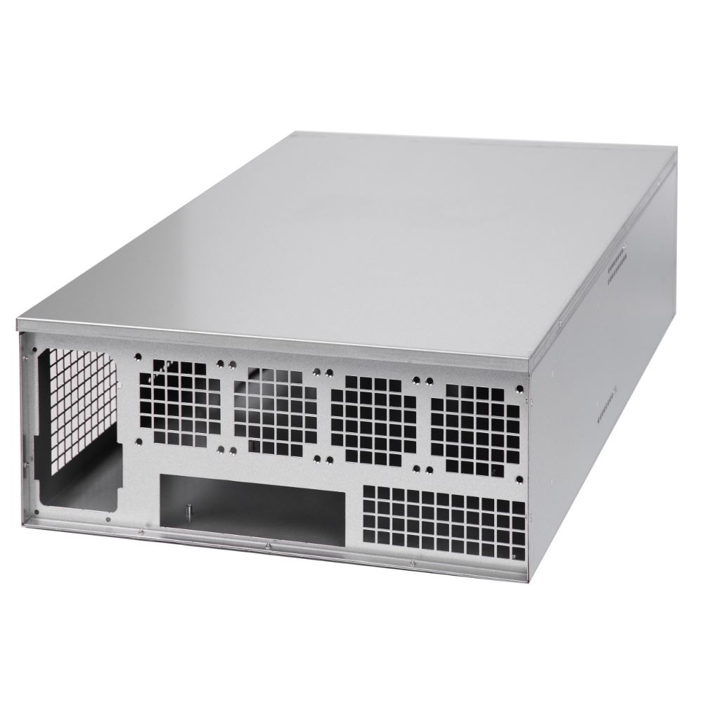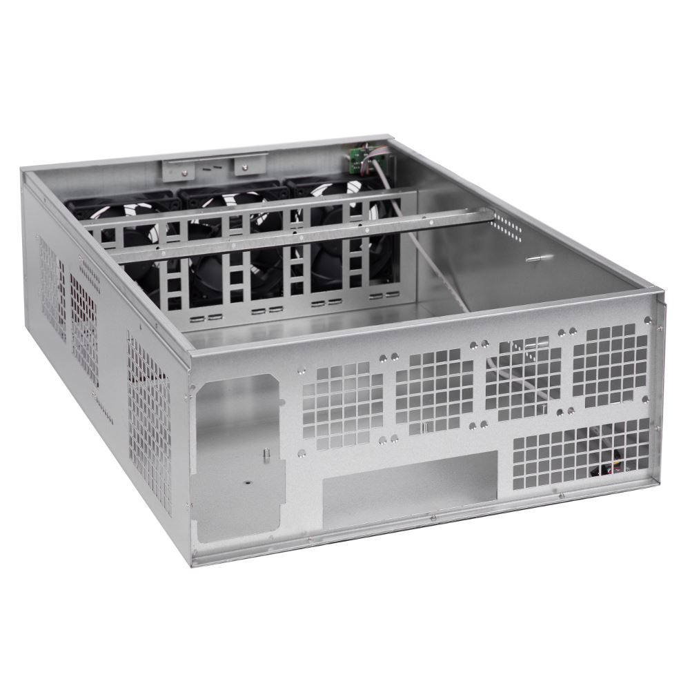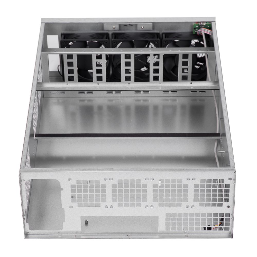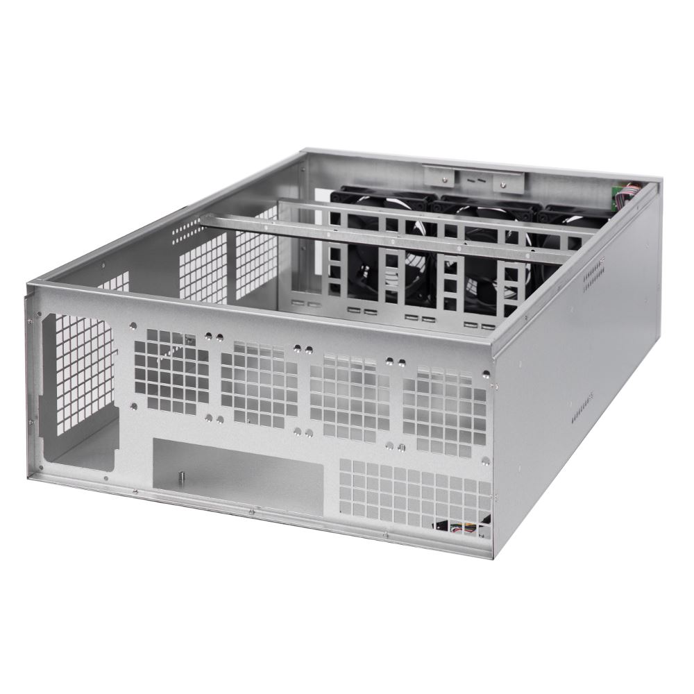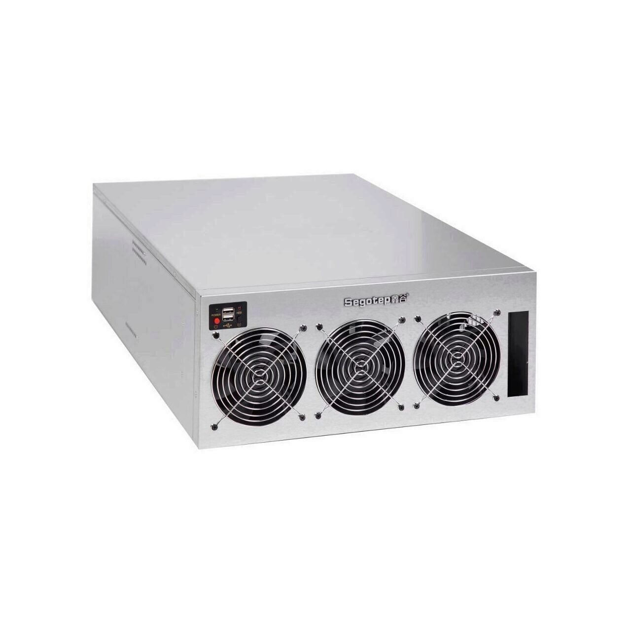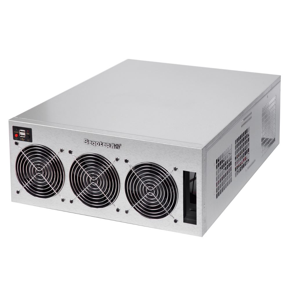 Segotep Miner Case, SECC Steel, fara sursa (tip ATX), fata – 3x 120mm fan (conector: Molex), 2x USB 2.0, suporta sina de montare pentru maxim 6 placi video, format placa de baza: ATX/microATX, dimensiuni (WxHxD): 424x178x610mm