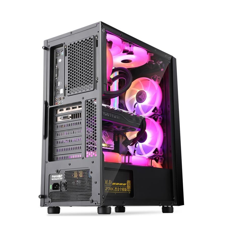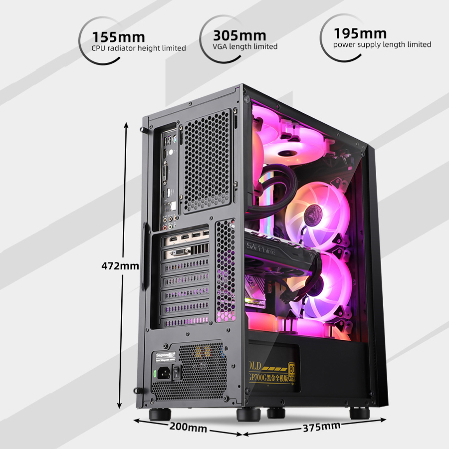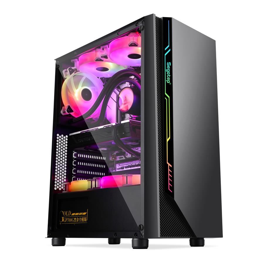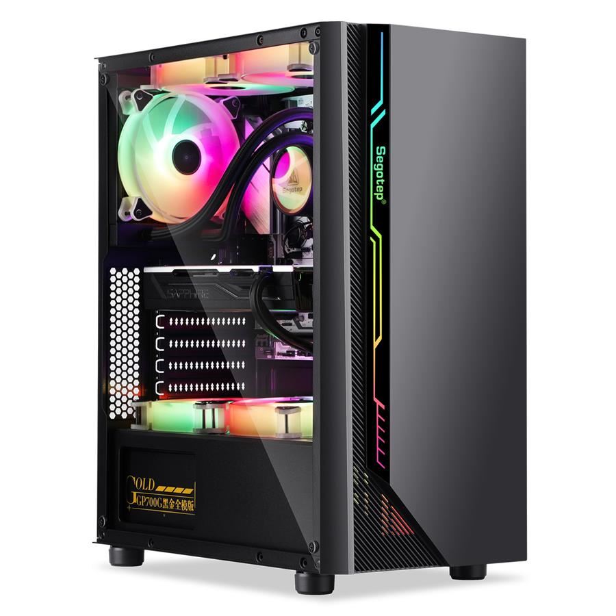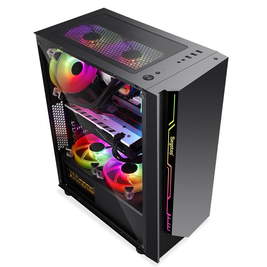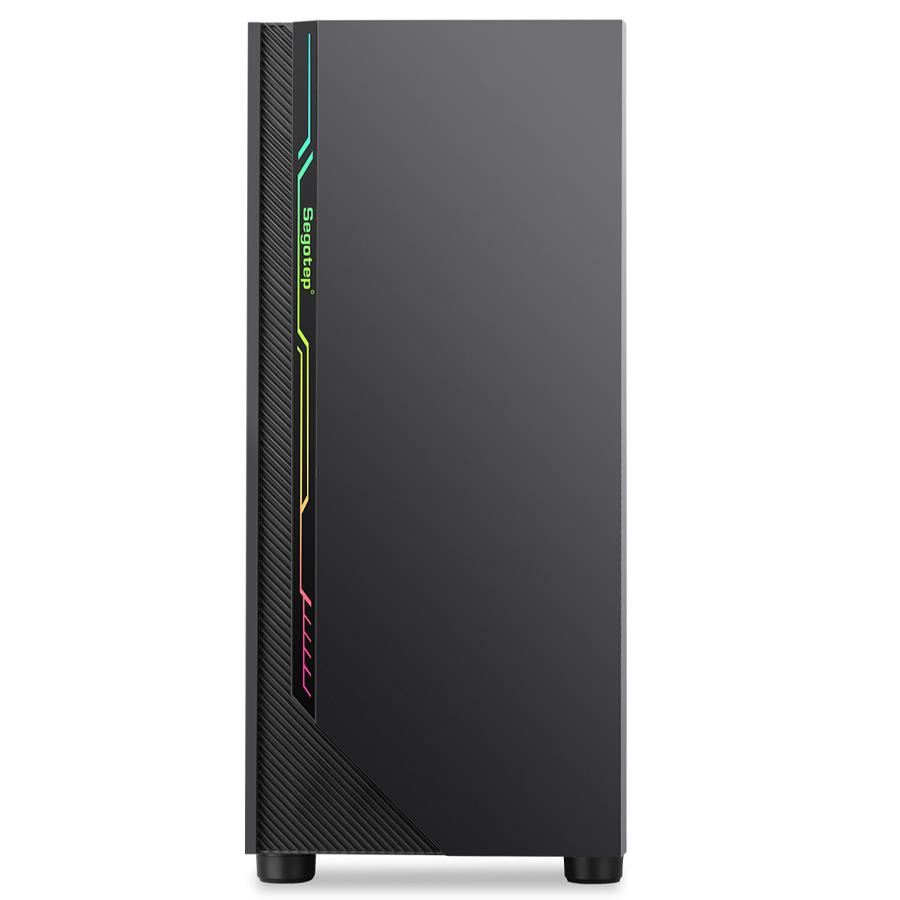 Carcasa Segotep Nova S6 neagra, SPCC Steel ATX Mid Tower, fara sursa (tip ATX, montata jos), interior vopsit negru, 1x 3.5" (intern), 1x 2.5”/3.5" (intern), 1x 2.5" (intern), fata – 3x 120mm fans (optional), spate - 1x 120mm RGB fan (inclus), tavan – 2x 120mm (optional), design premium cu panou lateral din sticla securizata, panou frontal iluminat RGB, 1x USB 3.0, 2x USB 2.0, HD Audio, ATX / microATX / Mini-ITX, sloturi expansiune: x7, design premium cu geam lateral din sticla securizata si panou frontal iluminat RGB, power cover, include filtre de praf, inaltime maxima cooler procesor: 155mm, lungime maxima placa video: 305mm, dimensiuni: 472x200x375mm