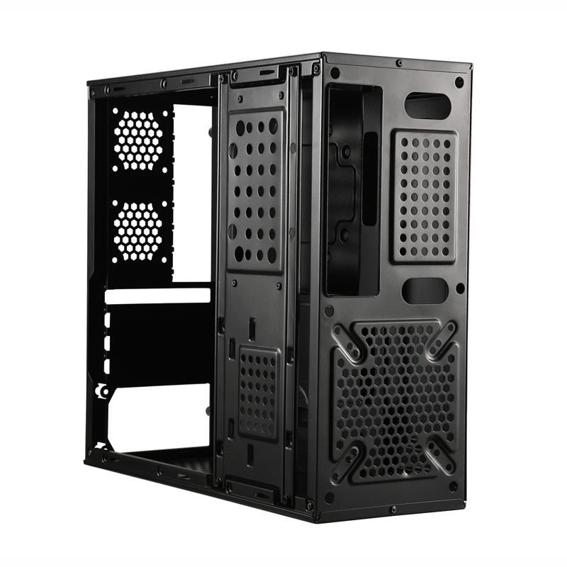 Segotep Raynor Tower Mini K Black/Silver 350W PSU, SGCC Steel mATX Mini Tower, cu sursa de 350W (tip SFX, montata jos, conectori: 1x 6pin PCIE, 3x SATA, 1x Molex), interior vopsit negru, 1x5.25” (extern), 2x3.5”/2.5” (intern), fata – 1x 120mm fan (inclus), spate – 2x 60mm fans (optional), lateral – 1x 120/92/80mm fan (optional), 1x USB 3.0, 1x USB 2.0, HD Audio, microATX / Mini-ITX, sloturi expansiune: x4, inaltime maxima cooler procesor: 110mm, lungime maxima placa video: 300mm, filtre de praf incluse, dimensiuni (h/w/d): 377x150x392mm