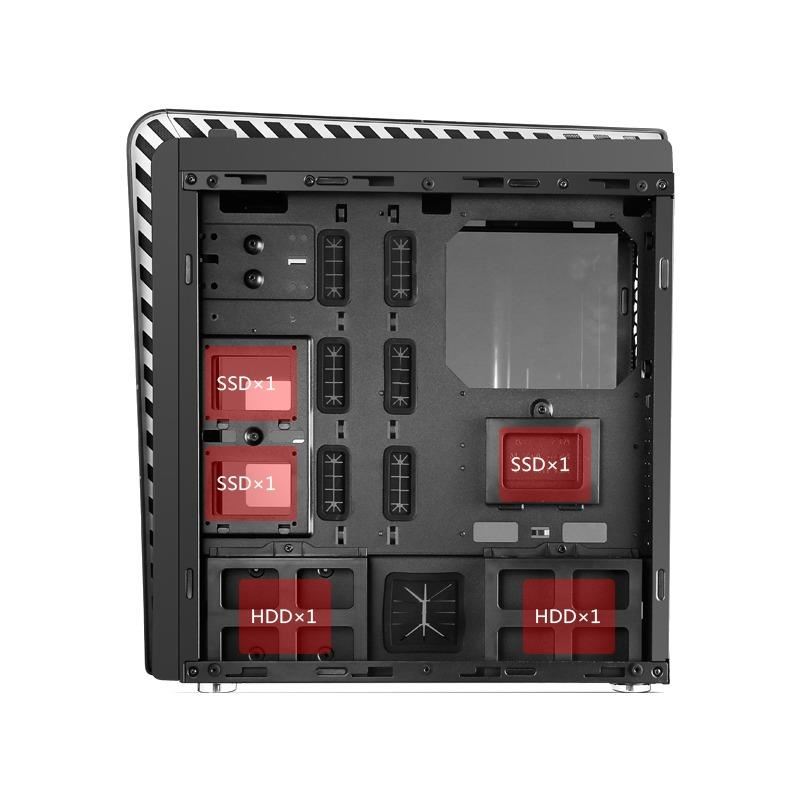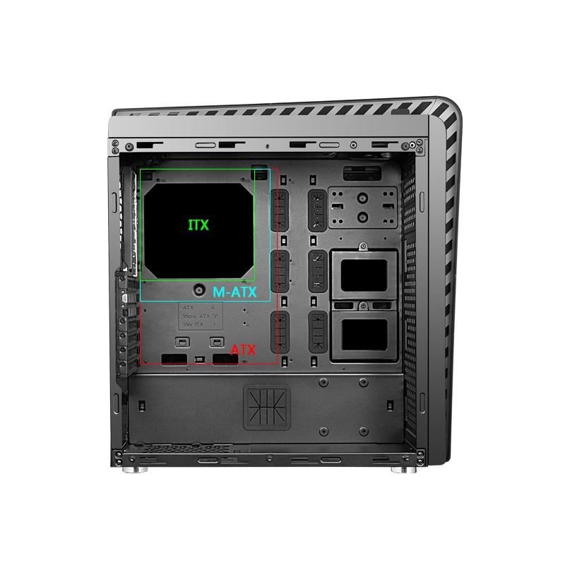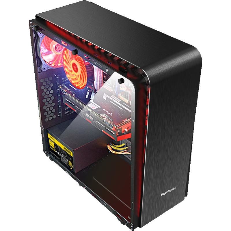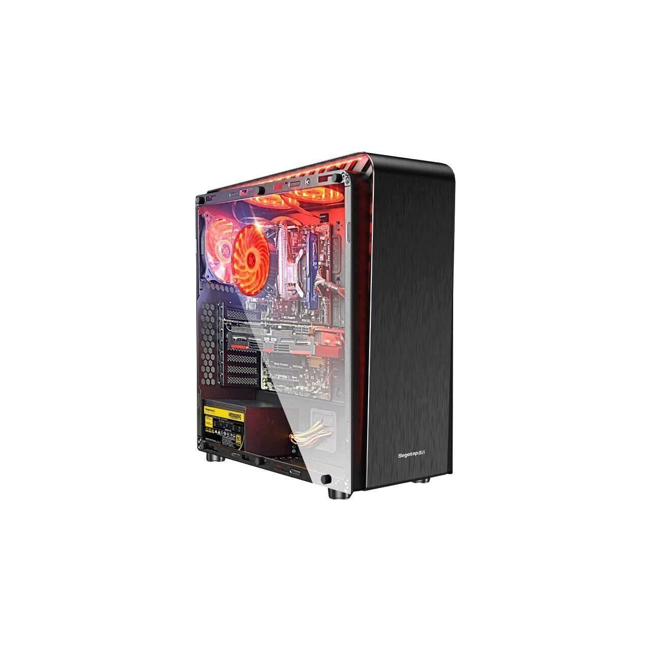 Segotep Raynor Tower T3 Black, SPCC Steel (grosime 0.7mm si 1.0mm) ATX Mid Tower, fara sursa (tip ATX, montata jos), interior vopsit negru, 2x3.5” (intern), 3x2.5” (intern), fata – 3x 120mm / 2x 140mm fans (optional), spate – 1x 120/mm fan (optional), tavan – 2x 120mm fans (optional), design premium cu panouri laterale din sticla securizata si panou lateral si superior din aluminiu, 3x USB 3.0, 2x USB 2.0, HD Audio, sistem de iluminare a carcasei RGB S-link (7 culori disponibile), ATX / microATX / Mini-ITX, sloturi expansiune: x7, inaltime maxima cooler procesor: 160mm, lungime maxima placa video: 400mm, suport radiatoare water cooling: 1x 120mm sau 1x 240mm sau 1x 360mm, dimensiuni (HxWxD): 518x218x478mm, greutate: 11.1kg