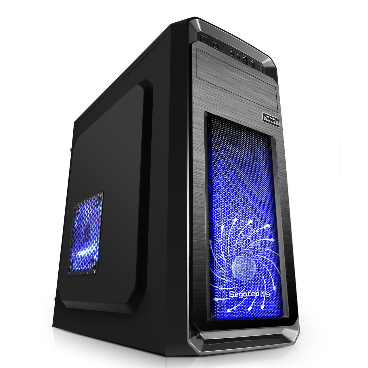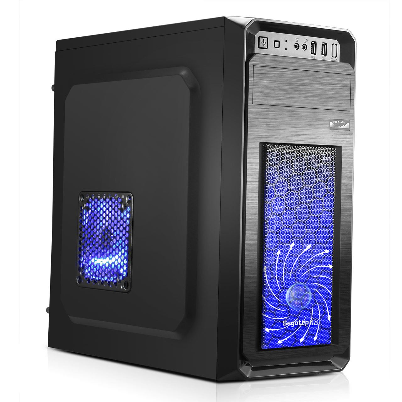 Segotep S1 Black, SECC Steel ATX Mid Tower Case, fara sursa (tip ATX, montata sus), interior vopsit negru, 1x5.25” (extern), 1x5.25 (intern), 1x3.5”/2.5” (intern), 1x2.5” (intern), spate – 1x 120/92/80mm fan (optional), fata – 1x 120mm fan (inclus) sau 1x 140mm fan (optional), lateral – 1x 120mm fan (optional), 2x USB 2.0, HD Audio, ATX / microATX, sloturi expansiune: x6, inaltime maxima cooler procesor: 165mm, lungime maxima placa video: 330mm, dimensiuni (h/w/d): 420x195x400mm