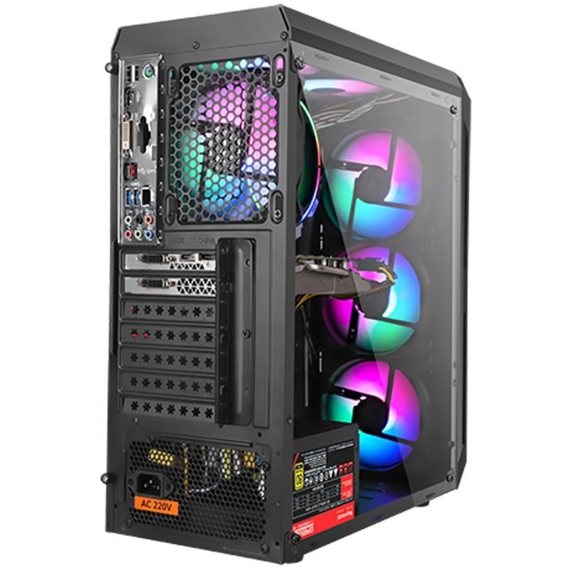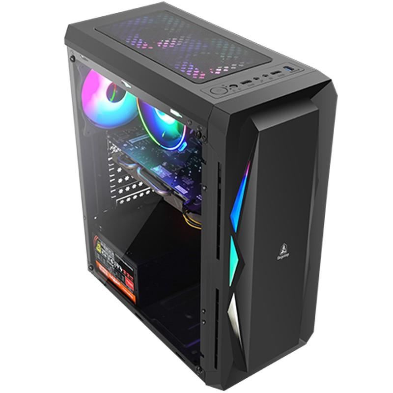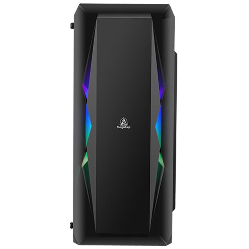 Carcasa Segotep Snake neagra, SPCC Steel ATX Mid Tower, fara sursa (tip ATX, montata jos), interior vopsit negru, 1x 3.5" (intern), 2x 2.5" (intern), spate - 1x 120mm aRGB fan (inclus), tavan – 2x 120mm fans (optional), design premium cu panou lateral transparent si panou frontal iluminat RGB, 1x USB 3.0, 2x USB 2.0, HD Audio, ATX / microATX / Mini-ITX, sloturi expansiune: x7, inaltime maxima cooler procesor: 160mm, lungime maxima placa video: 290mm, dimensiuni: 383x200x440mm, greutate: 5kg