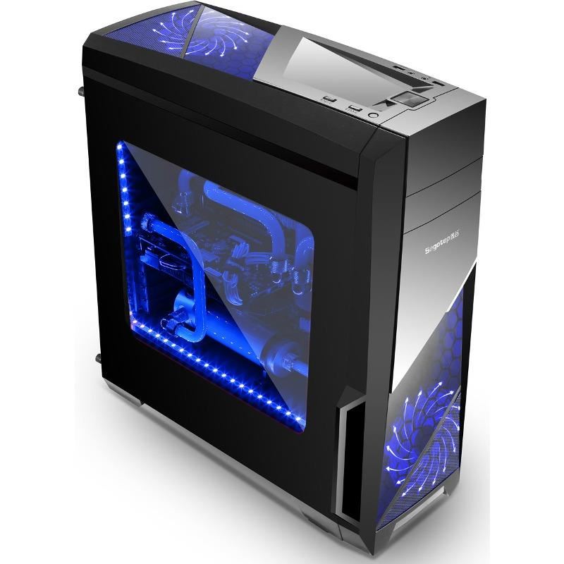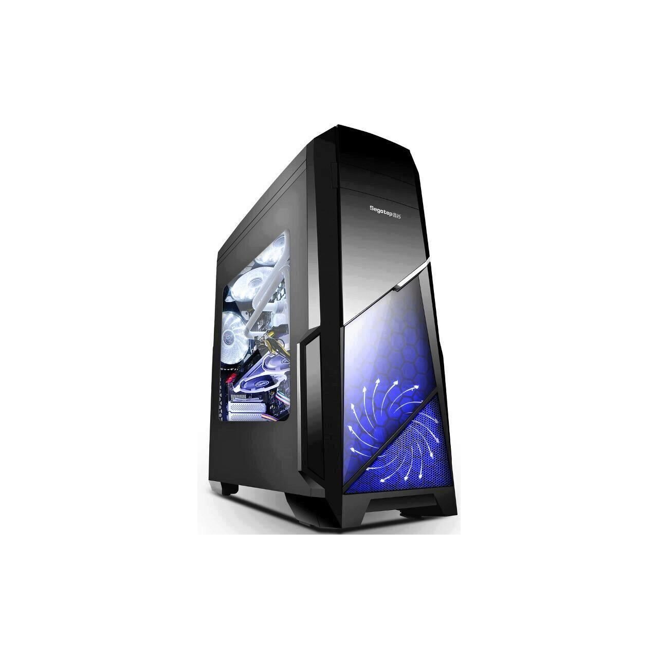 Segotep Sprint Black, SPCC Steel ATX Mid Tower, fara sursa (tip ATX, montata jos), interior vopsit negru, 1x5.25” (extern), 1x5.25” (intern), 3x3.5” (intern), 3x2.5” (intern), design tool-less, fata – 1x 120mm Blue LED fan (inclus), spate – 1x 120mm fan (inclus), tavan – 1x 120mm fan (inclus) si 1x 120mm fan (optional), 1x USB 3.0, 2x USB 2.0, HD Audio, ATX / microATX / Mini-ITX, sloturi expansiune: x7, inaltime maxima cooler procesor: 159mm, lungime maxima placa video: 400mm, dimensiuni (h/w/d): 505 x 210 x 445mm