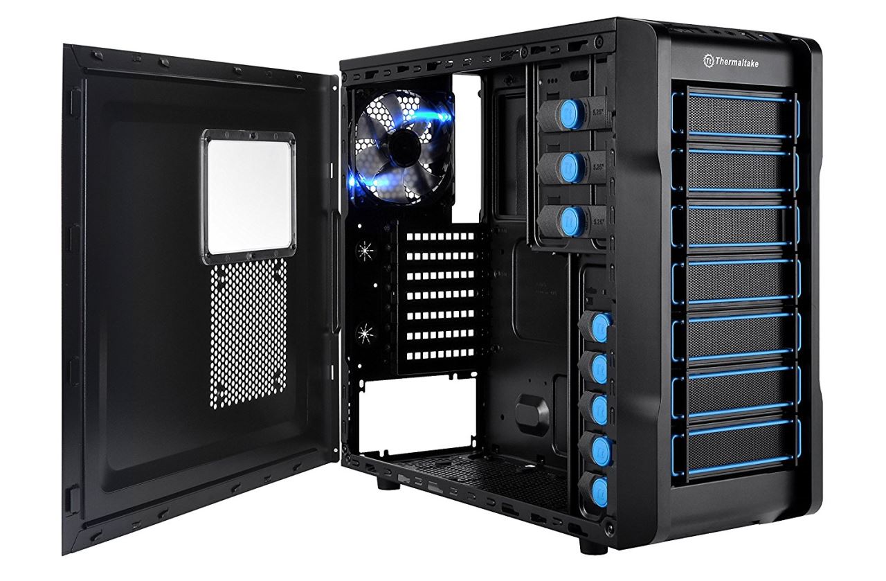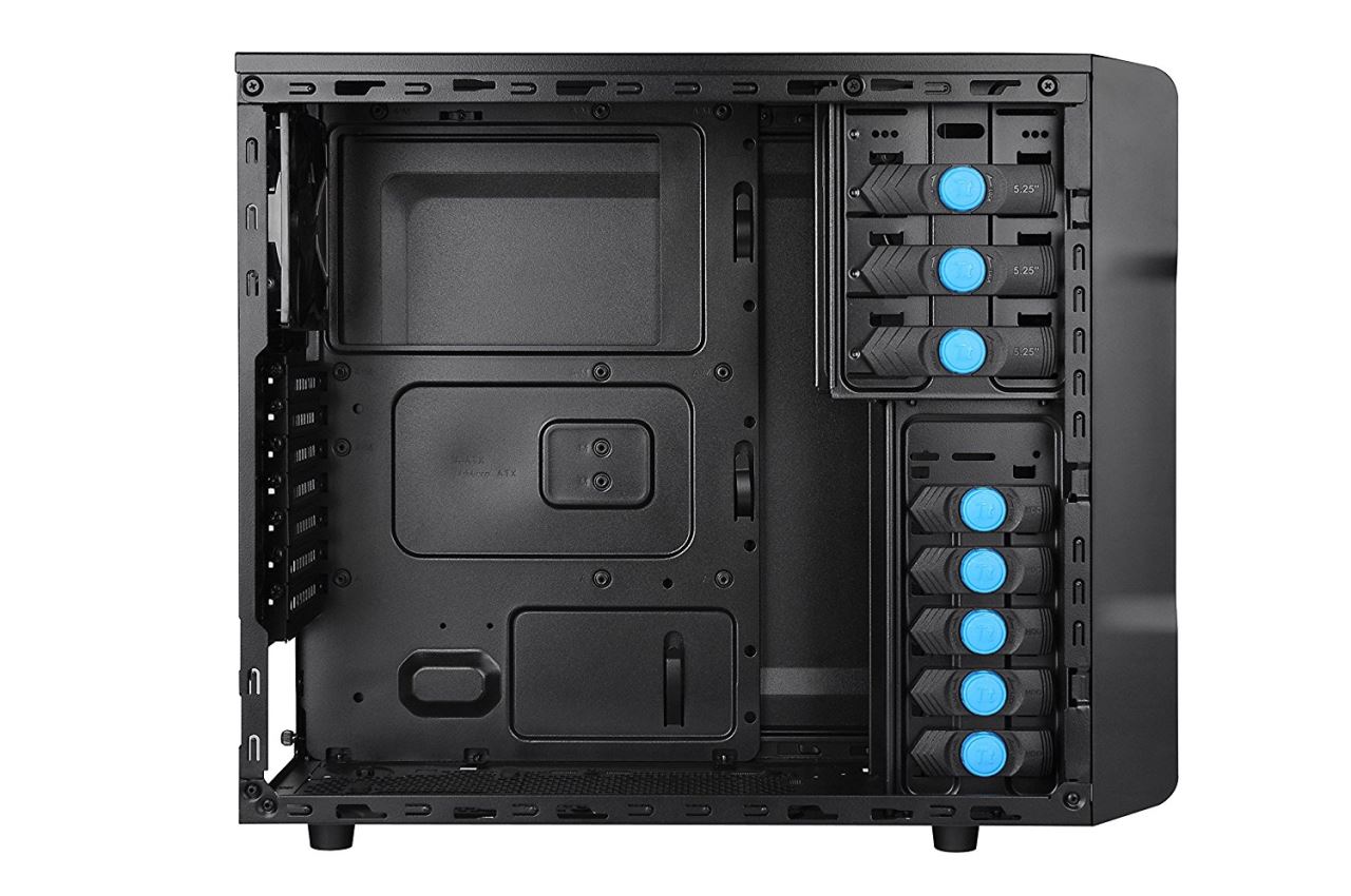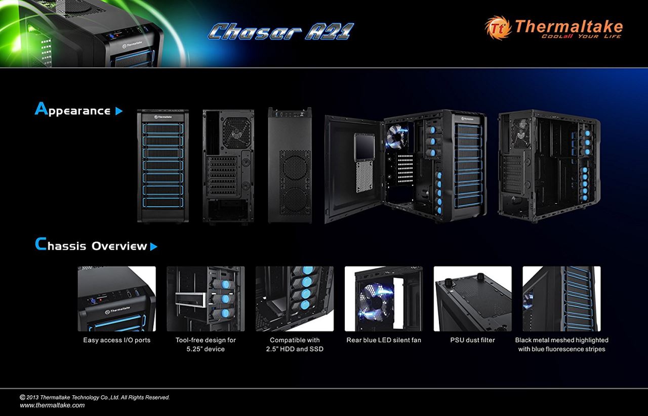 Thermaltake Chaser A21, SECC Steel ATX Mid Tower, fara sursa, interior vopsit in negru, 3x5.25” (extern), 1x3.5” (extern, convertibil dintr-un bay de 5.25”), 6x3.5” (intern), 1x2.5” (intern), design tool-less, fata – 1x 120mm fan (optional), spate – 1x 120mm Blue LED fan (1000 RPM, 16 dBA, inclus), podea – 1x 120mm fan (optional), tavan – 2x 120mm fans (optional), lateral – 1x 120mm fan (optional), 1x USB 3.0, 1x USB 2.0, HD Audio, ATX / microATX, filtre de praf incluse, dimensiuni: 427 x 195 x 497 mm, greutate: 5.2 kg