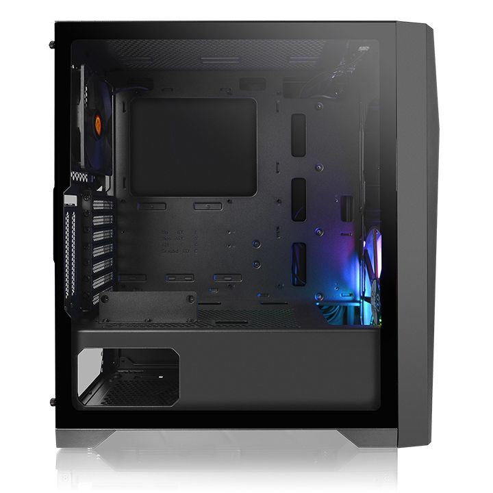 Carcasa Thermaltake Commander G32 Tempered Glass neagra iluminare aRGB, SPCC Steel ATX Mid Tower, fara sursa (tip ATX, montata jos), interior vopsit negru, design premium cu panou lateral din sticla securizata cu grosimea de 4mm, 2x3.5”/2.5” (intern), 2x2.5” (intern), design tool-less, fata – 1x 200mm aRGB fan (inclus) sau 3x 120 mm / 2x 140mm / 2x 200mm fan (optional), spate – 1x 120mm fan (1000 RPM, 16dBA, inclus), tavan – 2x 140/120mm fan (optional), 1x USB 3.0, 2x USB 2.0, HD Audio, sloturi expansiune: x7+2, ATX / microATX / Mini-ITX, inaltime maxima cooler procesor: 165mm, lungime maxima placa video: 300mm, lungime maxima sursa alimentare: 160mm (cu cusca HDD) sau 200mm (fara cusca HDD), suport radiatoare water cooling: fata – 1 x 360mm sau 1 x 280mm, spate – 1 x 120mm, tavan – 1x 240mm, dimensiuni (HxWxD): 462 x 225 x 472mm, greutate: 7.7kg