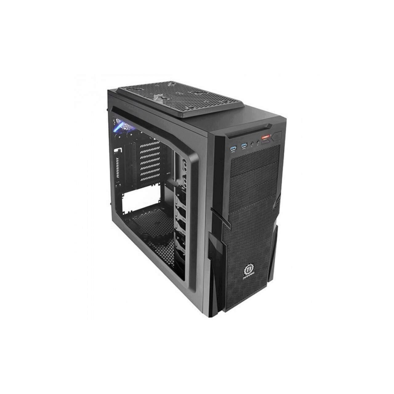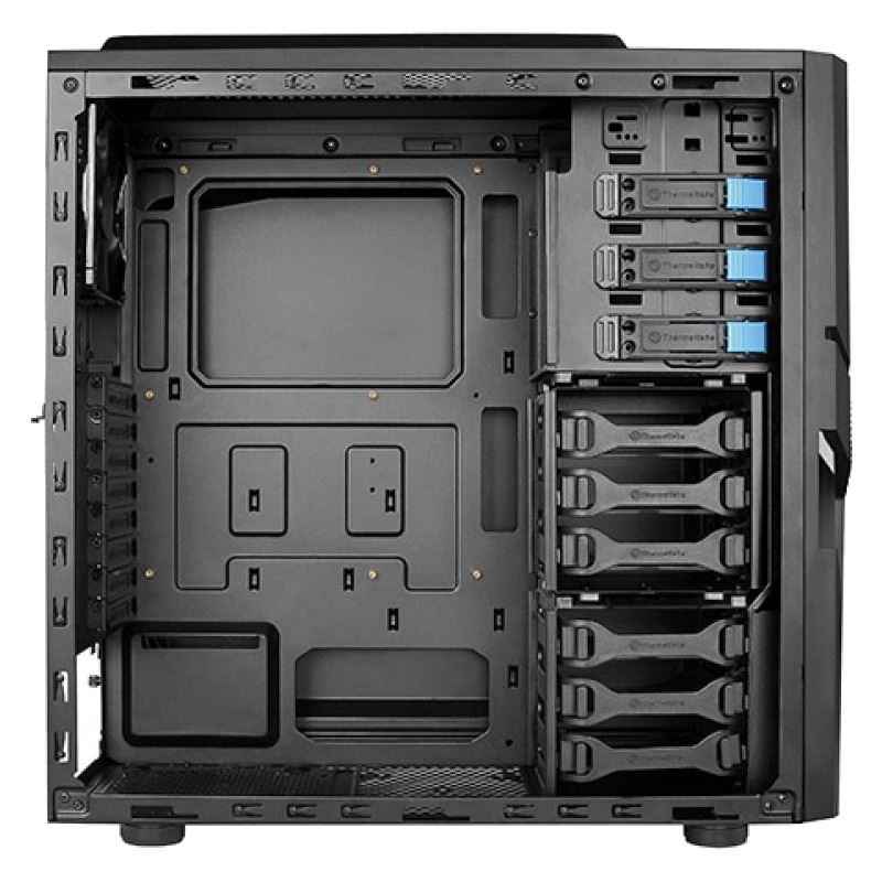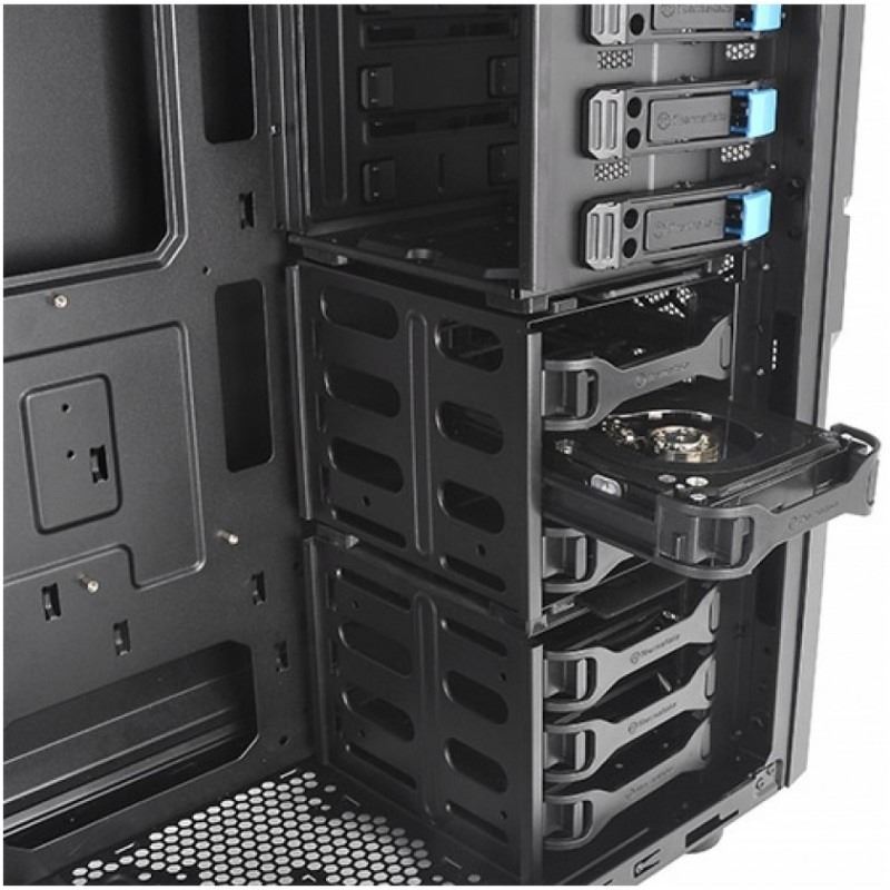 Thermaltake Commander G41 Window, SPCC Steel ATX Mid Tower, fara sursa, interior vopsit in negru, 3x5.25” (extern), 1x3.5” (extern, convertibil dintr-un bay de 5.25”), 6x3.5”/2.5” (intern), design tool-less, fata – 1x 120mm Turbo fan (1000 RPM, 16 dBA, inclus), spate – 1x 120mm Blue LED Turbo fan (1000 RPM, 16 dBA, inclus), podea – 1x 120mm fan (optional), tavan – 1x 200mm sau 1x 140mm sau 2x 120mm fans (optional), 2x USB 3.0, HD Audio, sloturi expansiune: x8+1, ATX / microATX, inaltime maxima cooler procesor: 185mm, lungime maxima placa video: 270mm (cu cusca HDD) sau 410mm (fara cusca HDD), suport radiatoare water cooling: tavan – 1 x 120mm sau 1 x 240mm, spate – 1 x 120mm, filtre de praf incluse, dimensiuni: 487 x 244 x 481 mm, greutate: 7.1 kg