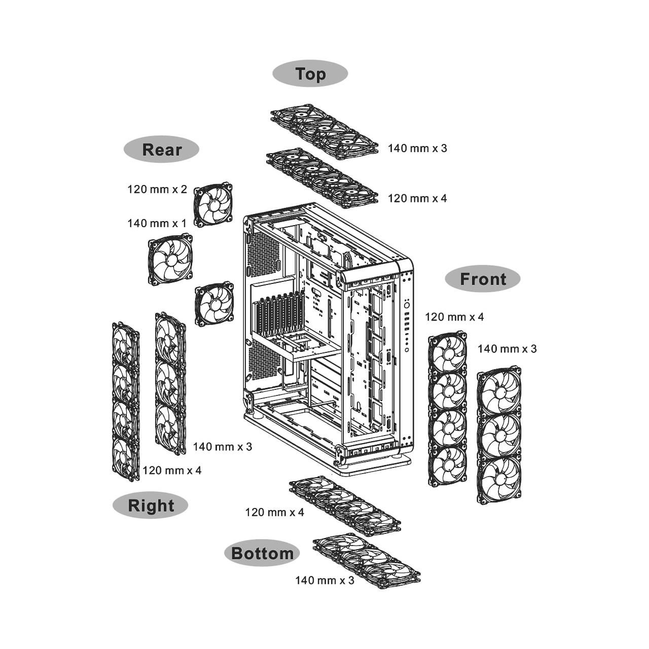 Aceasta carcasa ofera numeroase optiuni pentru montarea ventilatoarelor si a radiatoarelor de racire cu lichid, asigurand un flux de aer optim si o racire eficienta a componentelor. Cu suport pentru pana la 12 ventilatoare de 120mm sau 7 ventilatoare de 140mm, utilizatorii pot personaliza configuratia de racire pentru a satisface nevoile specifice ale sistemului lor. Carcasa suporta, de asemenea, multiple dimensiuni de radiatoare, oferind flexibilitate pentru diverse solutii de racire cu lichid.