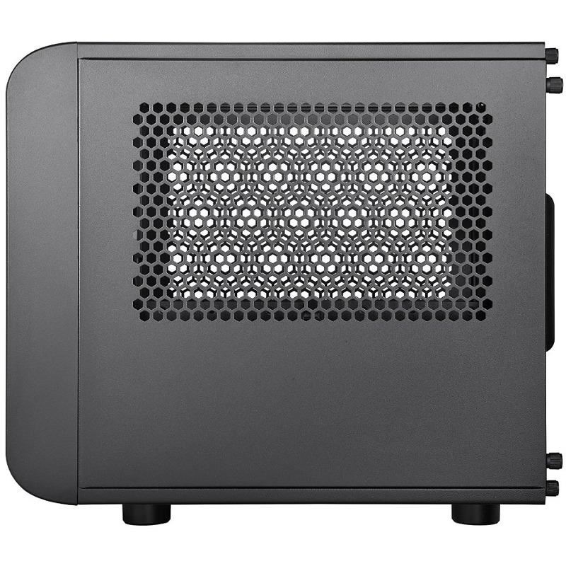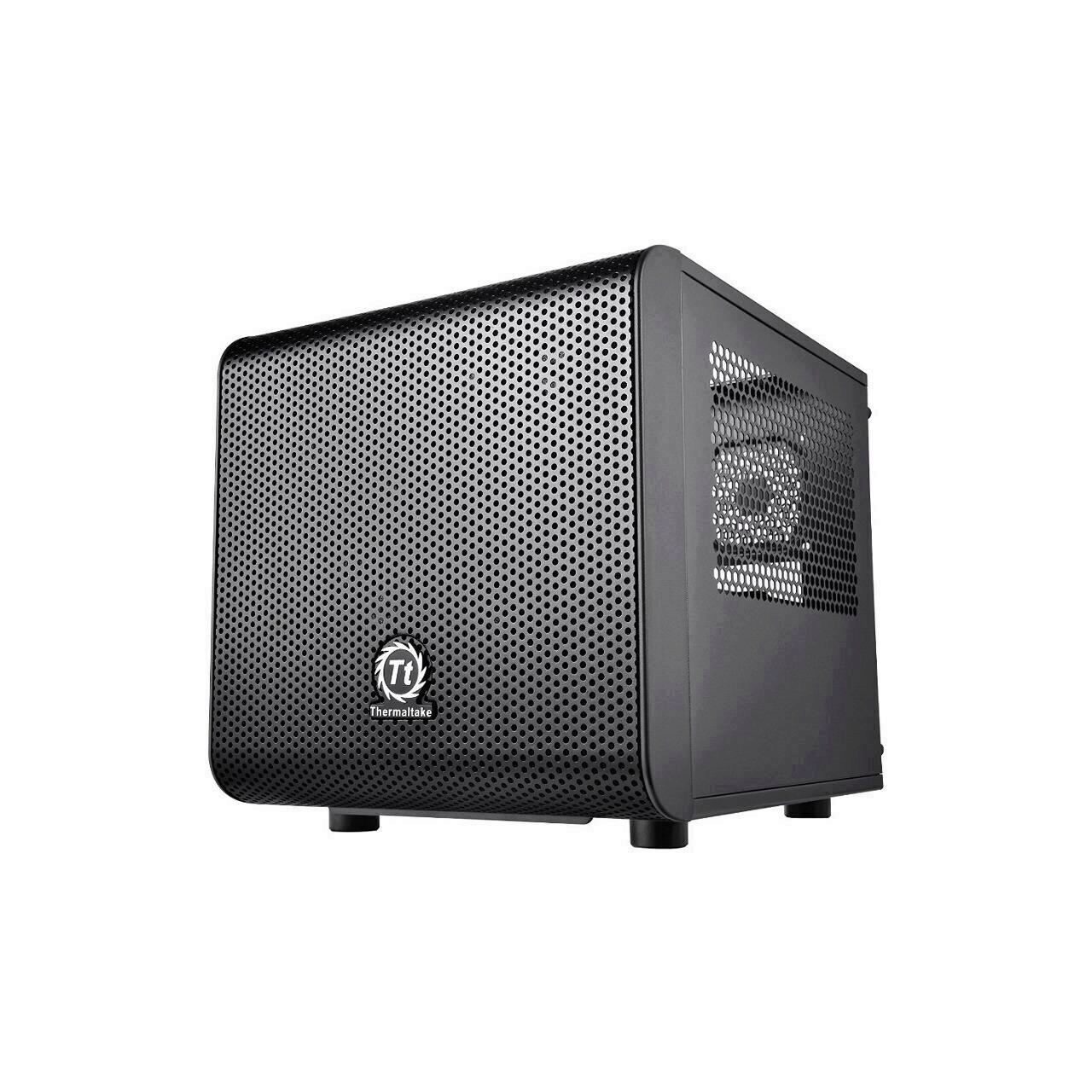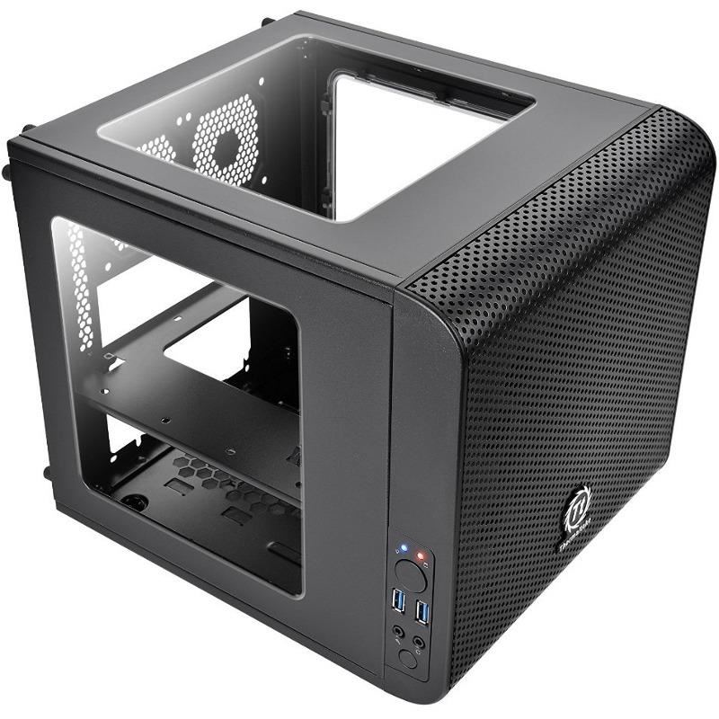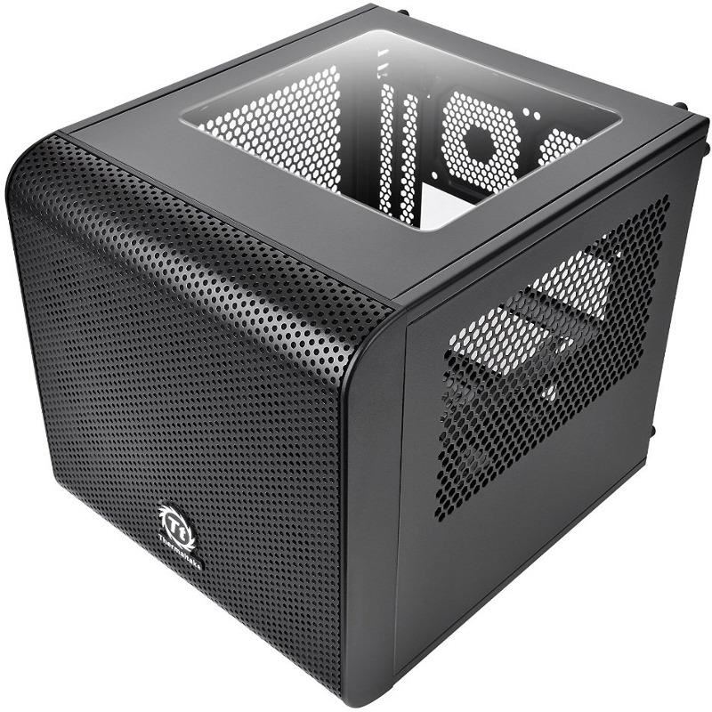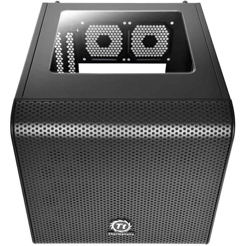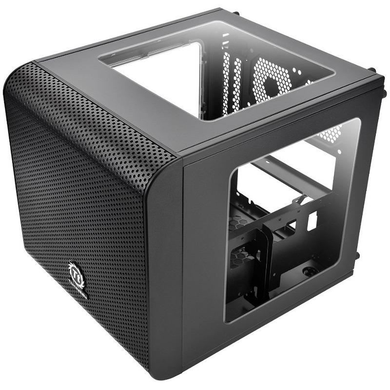 Thermaltake Core V1, SPCC Steel Mini-ITX Cube, fara sursa, interior vopsit negru, 2x3.5” (intern), 2x2.5” (intern), design tool-less, panouri laterale interschimbabile ce permit personalizarea carcasei in functie de preferinte, fata – 1x 200mm fan (800 RPM, 13 dBA, inclus) sau 1x 140/120mm fan (optional), spate – 2x 80mm fans (optional), 2x USB 3.0, HD Audio, sloturi expansiune: x2, ini-ITX, inaltime maxima cooler procesor: 140mm, lungime maxima placa video: 285mm, suport radiatoare water cooling: fata – 1 x 120mm sau 1 x 140mm, filtre de praf incluse, dimensiuni: 276 x 260 x 316 mm