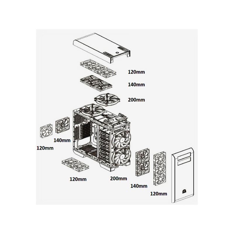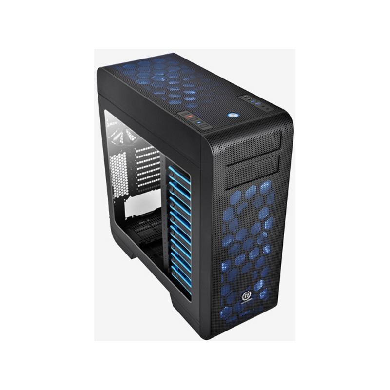Thermaltake Core V71, SPCC Steel EATX Full Tower, fara sursa, interior vopsit negru, 2x5.25” (extern), 8x3.5”/2.5” (intern), design tool-less, fata – 2x 200mm Blue LED fan (600-800 RPM, 13-15 dBA, inclus) sau 3x 120mm / 2x 140mm fan (optional), spate – 1x 140mm Turbo fan (1000 RPM, 16 dBA, inclus), podea – 2x 120mm fan (optional), tavan – 1x 200mm Blue LED fan (600-800 RPM, 13-15 dBA, inclus) si 1x 200mm fan (optional) / sau 5x 120mm / 2x 140mm fan (optional), 2x USB 3.0, 2x USB 2.0, HD Audio, sloturi expansiune: x8, EATX / ATX / microATX, inaltime maxima cooler procesor: 180mm, lungime maxima placa video: 310mm (cu rack HDD) sau 400mm (fara rack HDD), suport radiatoare water cooling: fata – 1 x 120mm sau 1 x 240mm sau 1 x 360mm sau 1 x 140mm sau 1 x 280mm sau 1 x 420mm, tavan – 1 x 120mm sau 1 x 240mm sau 1 x 360mm sau 1 x 140mm sau 1 x 280mm sau 1 x 420mm, spate – 1 x 120mm, podea – 1 x 120mm sau 1 x 240mm sau 1 x 140mm, filtre de praf incluse, dimensiuni: 583 x 230 x 560mm, greutate: 13.2kg