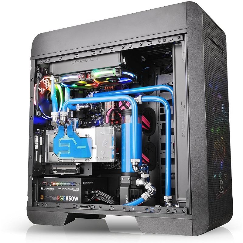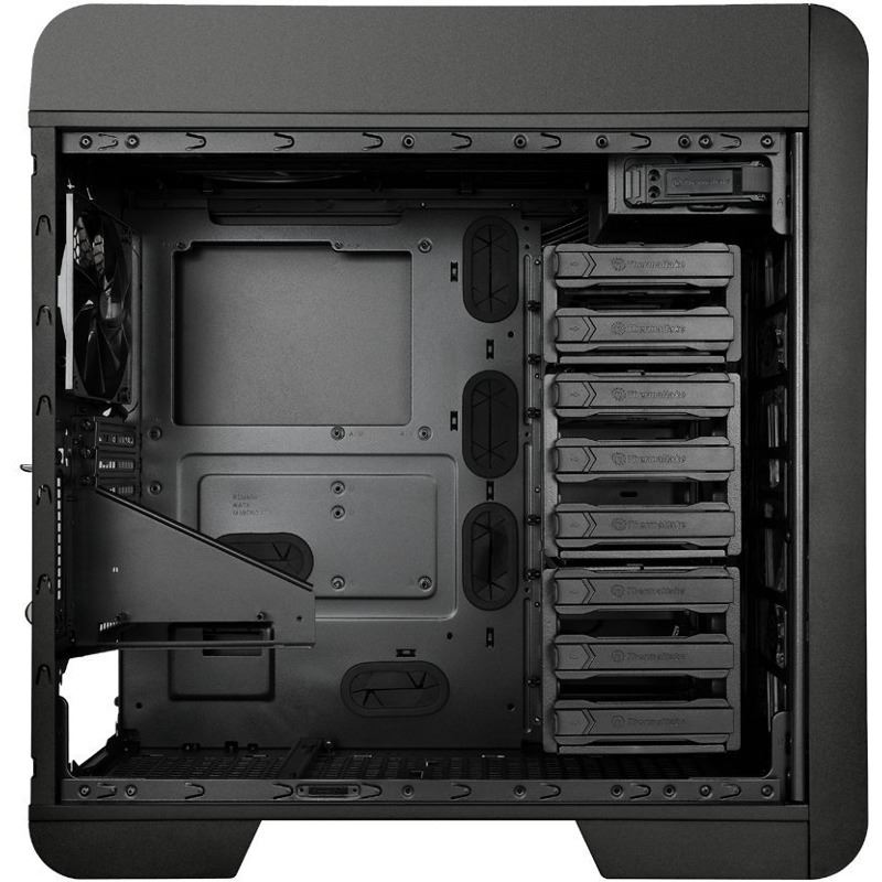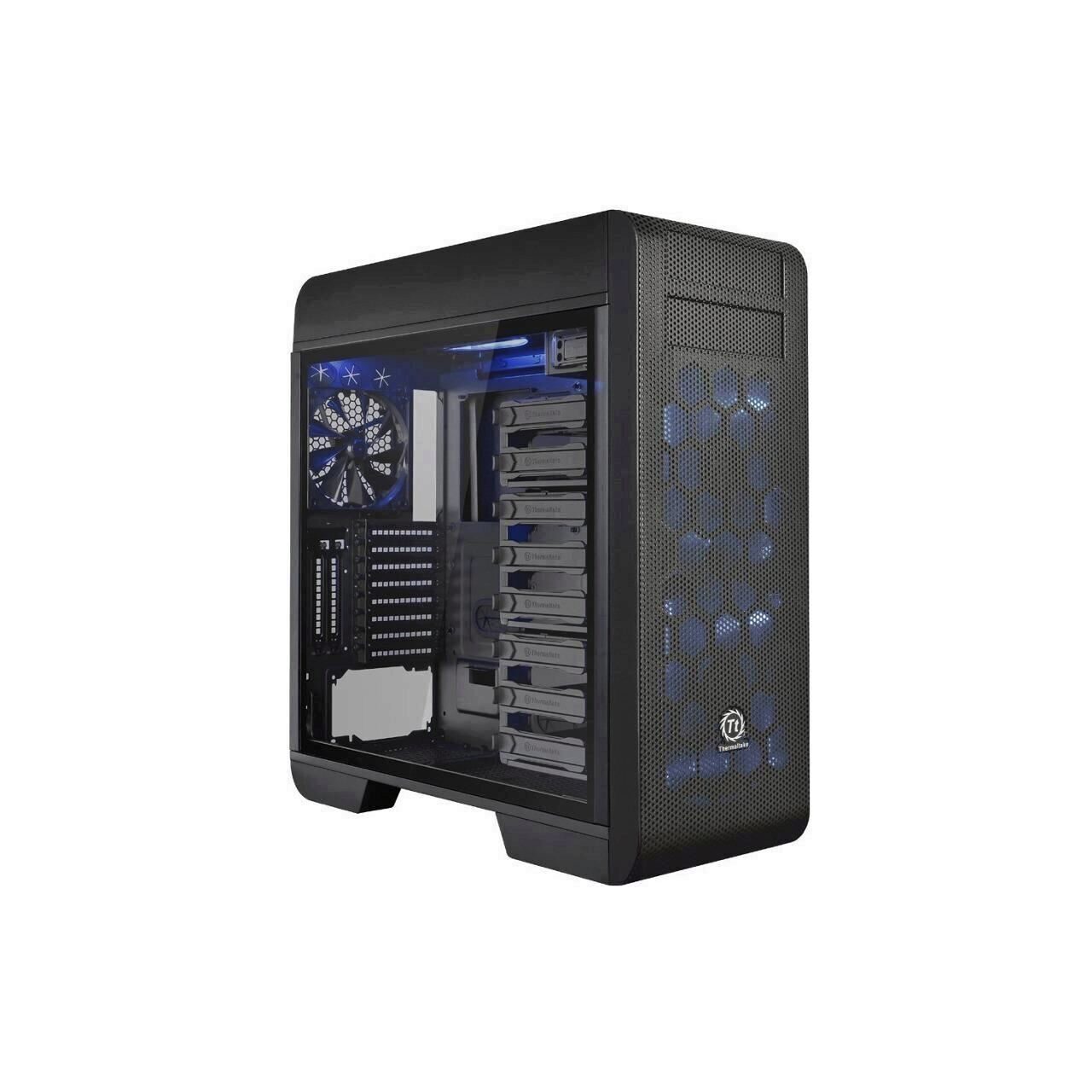 Thermaltake Core V71 Black Tempered Glass, SPCC Steel EATX Full Tower, fara sursa, interior vopsit negru, 2x5.25” (extern), 8x3.5”/2.5” (intern), design tool-less, fata – 2x 200mm Blue LED fan (600-800 RPM, 13-15 dBA, inclus) sau 3x 120mm / 2x 140mm fan (optional), spate – 1x 140mm Turbo fan (1000 RPM, 16 dBA, inclus), podea – 2x 120mm fan (optional), tavan – 1x 200mm Blue LED fan (600-800 RPM, 13-15 dBA, inclus) si 1x 200mm fan (optional) / sau 3x 120mm / 2x 140mm fan (optional), design premium cu panouri laterale din sticla securizata, 2x USB 3.0, 2x USB 2.0, HD Audio, sloturi expansiune: x8, EATX / ATX / microATX, inaltime maxima cooler procesor: 180mm, lungime maxima placa video: 310mm (cu rack HDD) sau 400mm (fara rack HDD), suport radiatoare water cooling: fata – 1 x 120mm sau 1 x 240mm sau 1 x 360mm sau 1 x 140mm sau 1 x 280mm sau 1 x 420mm, tavan – 1 x 120mm sau 1 x 240mm sau 1 x 360mm sau 1 x 140mm sau 1 x 280mm sau 1 x 420mm, spate – 1 x 120mm, podea – 1 x 120mm sau 1 x 240mm sau 1 x 140mm, filtre de praf incluse, dimensiuni: 583 x 230 x 560mm, greutate: 14.7kg