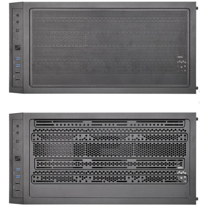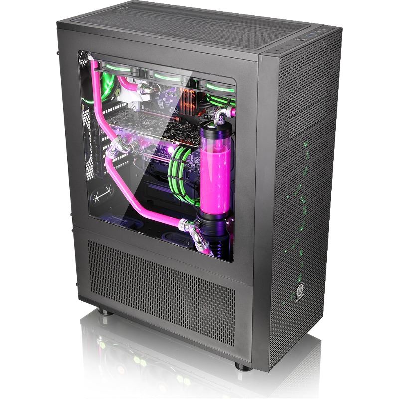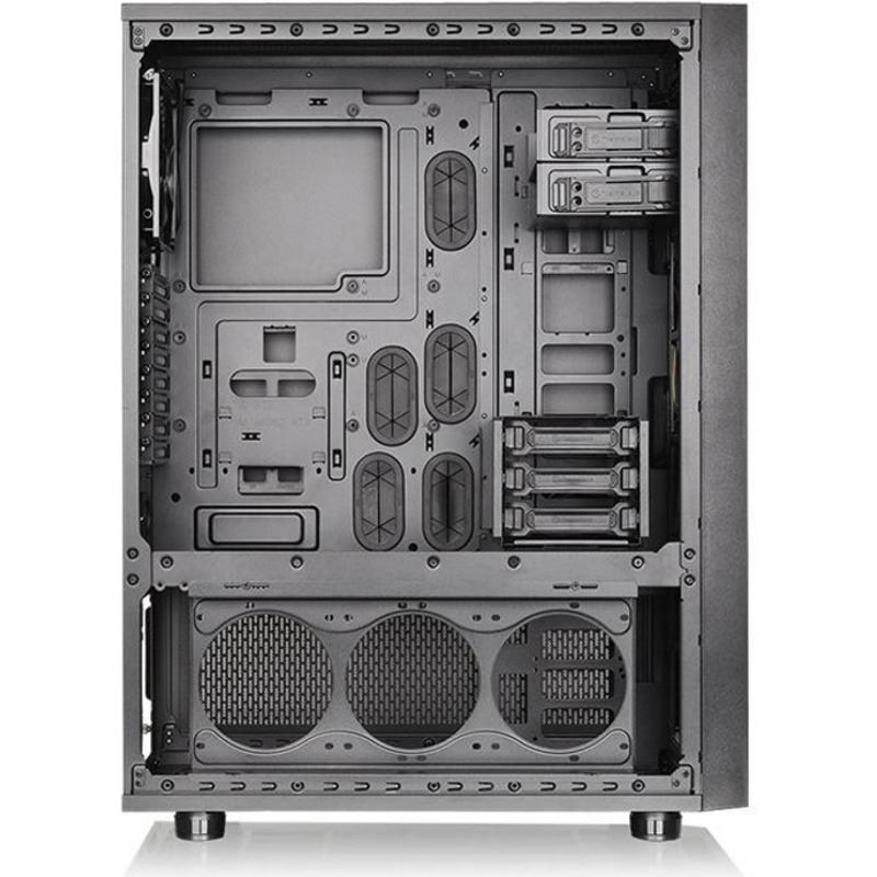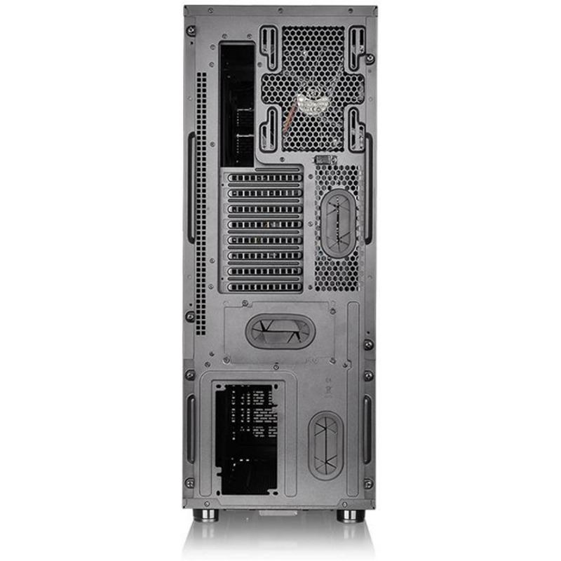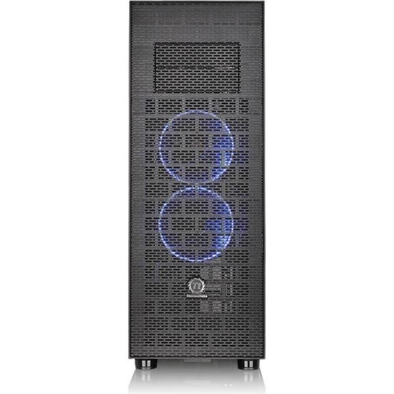 Thermaltake Core X71, SPCC Steel ATX Tower, fara sursa (tip ATX, montata jos), compartimentare in doua camere a spatiului pentru o mai mare flexibilitate si o racire mai buna, interior vopsit negru, 2x5.25” (extern), 3x3.5”/2.5” (intern), 2x3.5”/2.5” (intern), design tool-less, fata – 2x 140mm Riing LED Blue fans (1400rpm, 28dBA / 1000rpm, 22dBA cu LNC) si 1x 140mm fan (optional) / 3x 140mm fans (optional) / 2x 200mm fans (optional), spate – 1x 140mm Turbo fan (1000rpm, 16dBA, inclus) sau 1x 120mm fan (optional), podea – 2x 140/120mm fans (optional), tavan – 3x 140/120mm fans (optional) sau 2x 200mm fans (optional), lateral – 3x 120mm fans (optional) sau 2x 140mm fans (optional), 2x USB 3.0, 2x USB 2.0, HD Audio, sloturi expansiune: x8, ATX / microATX / Mini-ITX, inaltime maxima cooler procesor: 180mm, lungime maxima placa video: 278mm (cu rack HDD) sau 420mm (fara rack HDD), lungime maxima sursa: 180mm (cu ventilator montat in podea) sau 220mm (fara ventilator montat in podea), suport radiatoare water cooling: fata – 1 x 480mm sau 1 x 420mm, tavan – 1 x 360mm sau 1 x 280mm, spate – 1 x 120mm sau 1 x 140mm, podea – 1 x 140mm sau 1 x 120mm, lateral: 1 x 360mm sau 1 x 280mm, dimensiuni (h/w/d): 677 x 250 x 511mm, greutate: 12kg