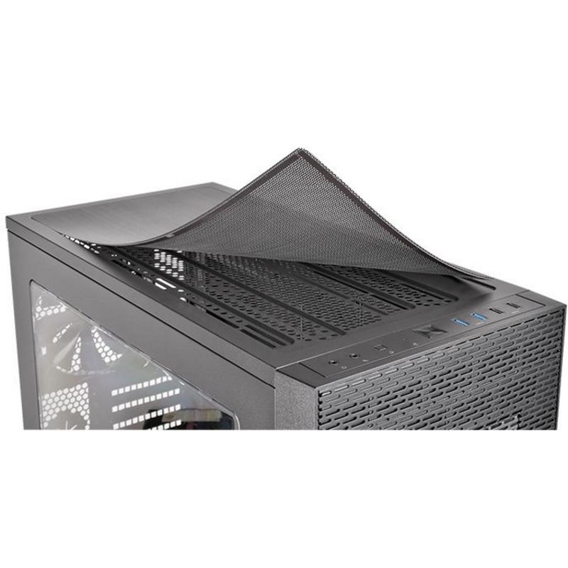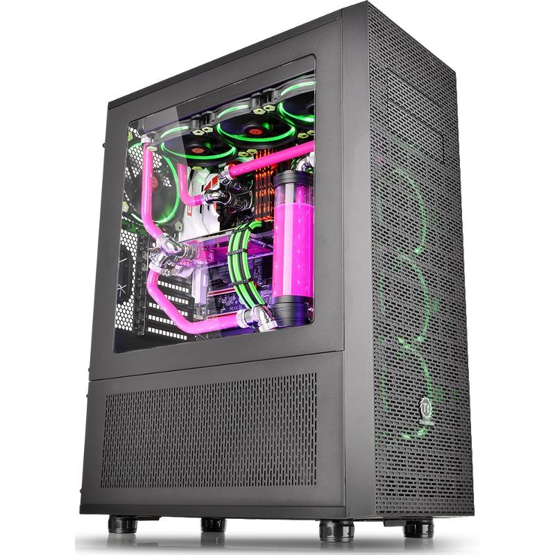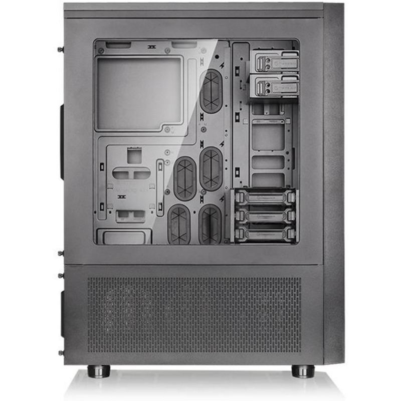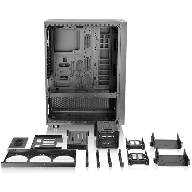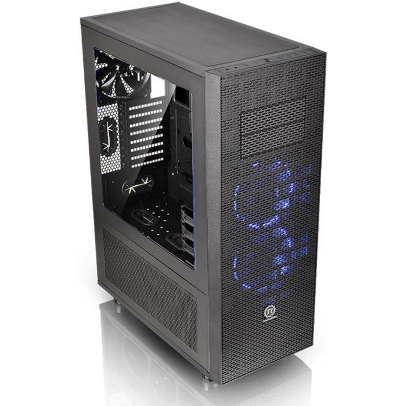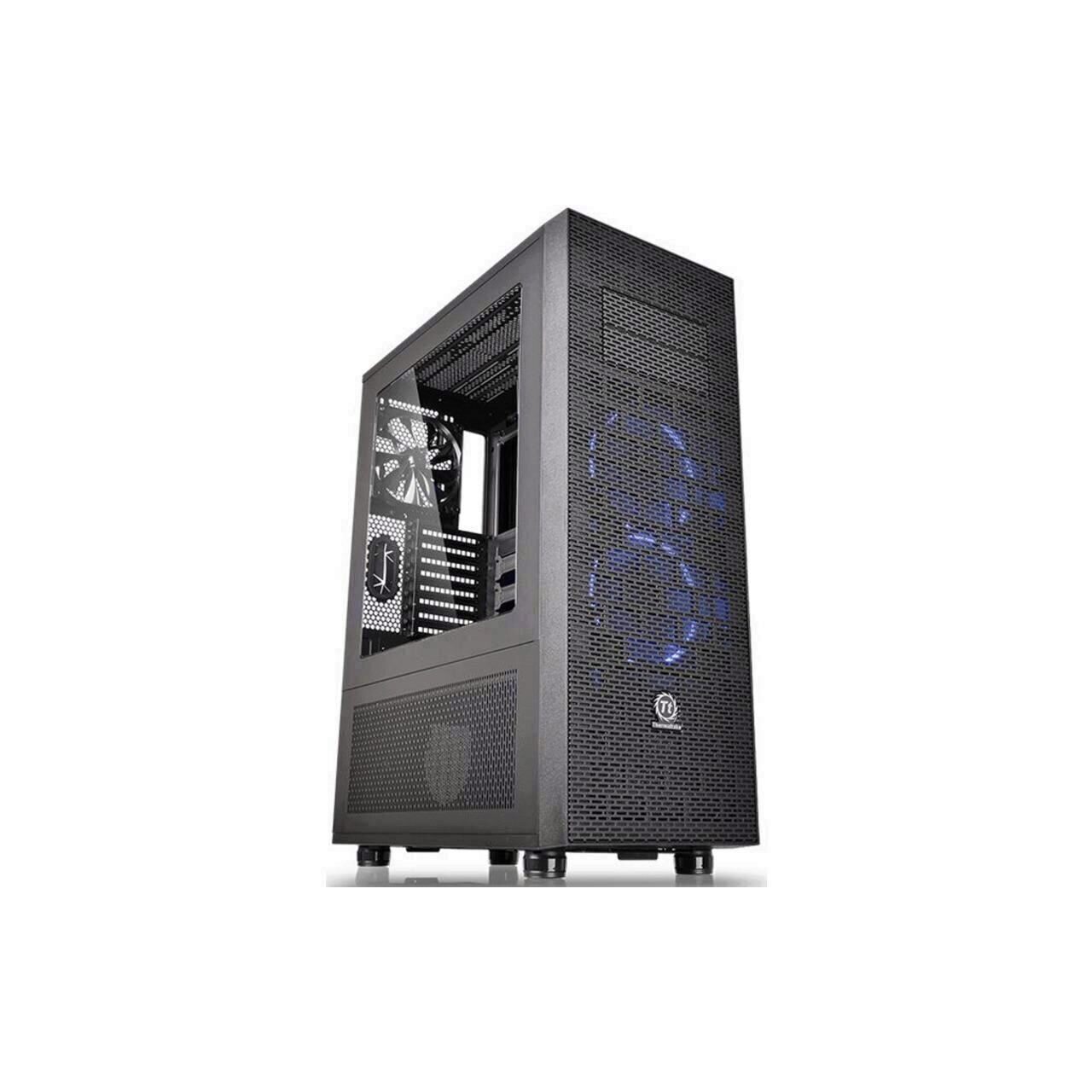 Thermaltake Core X71, SPCC Steel ATX Tower, fara sursa (tip ATX, montata jos), compartimentare in doua camere a spatiului pentru o mai mare flexibilitate si o racire mai buna, interior vopsit negru, 2x5.25” (extern), 3x3.5”/2.5” (intern), 2x3.5”/2.5” (intern), design tool-less, fata – 2x 140mm Riing LED Blue fans (1400rpm, 28dBA / 1000rpm, 22dBA cu LNC) si 1x 140mm fan (optional) / 3x 140mm fans (optional) / 2x 200mm fans (optional), spate – 1x 140mm Turbo fan (1000rpm, 16dBA, inclus) sau 1x 120mm fan (optional), podea – 2x 140/120mm fans (optional), tavan – 3x 140/120mm fans (optional) sau 2x 200mm fans (optional), lateral – 3x 120mm fans (optional) sau 2x 140mm fans (optional), 2x USB 3.0, 2x USB 2.0, HD Audio, sloturi expansiune: x8, ATX / microATX / Mini-ITX, inaltime maxima cooler procesor: 180mm, lungime maxima placa video: 278mm (cu rack HDD) sau 420mm (fara rack HDD), lungime maxima sursa: 180mm (cu ventilator montat in podea) sau 220mm (fara ventilator montat in podea), suport radiatoare water cooling: fata – 1 x 480mm sau 1 x 420mm, tavan – 1 x 360mm sau 1 x 280mm, spate – 1 x 120mm sau 1 x 140mm, podea – 1 x 140mm sau 1 x 120mm, lateral: 1 x 360mm sau 1 x 280mm, dimensiuni (h/w/d): 677 x 250 x 511mm, greutate: 12kg