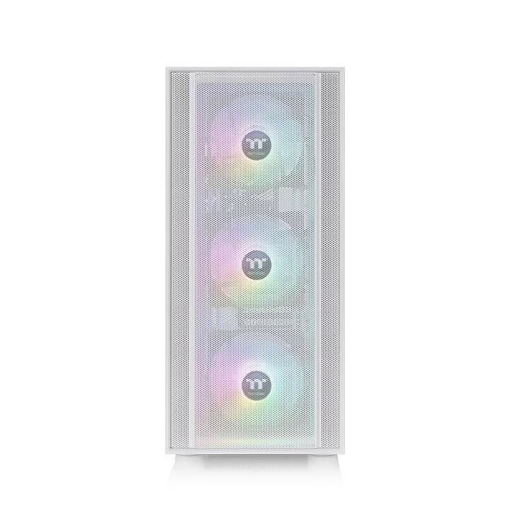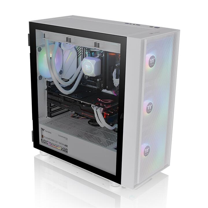 Carcasa Thermaltake H570 Tempered Glass aRGB Snow alba, SPCC Steel ATX Mid Tower, fara sursa (tip ATX, montata jos), interior vopsit alb, 2x3.5”/2.5” (intern), 2x 2.5” (intern), design tool-less, fata – 3x 120mm LED aRGB fans (1000rpm, 22.3 dBA, inclus) sau 3x 140mm / 2x 200mm fans (optional), spate – 1x 120mm fan (optional), tavan – 3x 120mm / 2x 140mm fan (optional), , design premium cu panou lateral cu balamale din sticla securizata cu grosimea de 4mm si panou frontal din mesh metalic, 2x USB 3.0, HD Audio, sloturi expansiune: x7, E-ATX / ATX / microATX / Mini-ITX, inaltime maxima cooler procesor: 160mm, lungime maxima placa video: 375mm, lungime maxim sursa de alimentare: 180mm, suport radiatoare water cooling: fata – 1 x 120/140/240/280/360mm, tavan – 1 x 120/140/240/280/360mm, spate – 1x 120mm, dimensiuni (HxWxD): 487 x 216 x 467 mm, greutate: 7.5kg