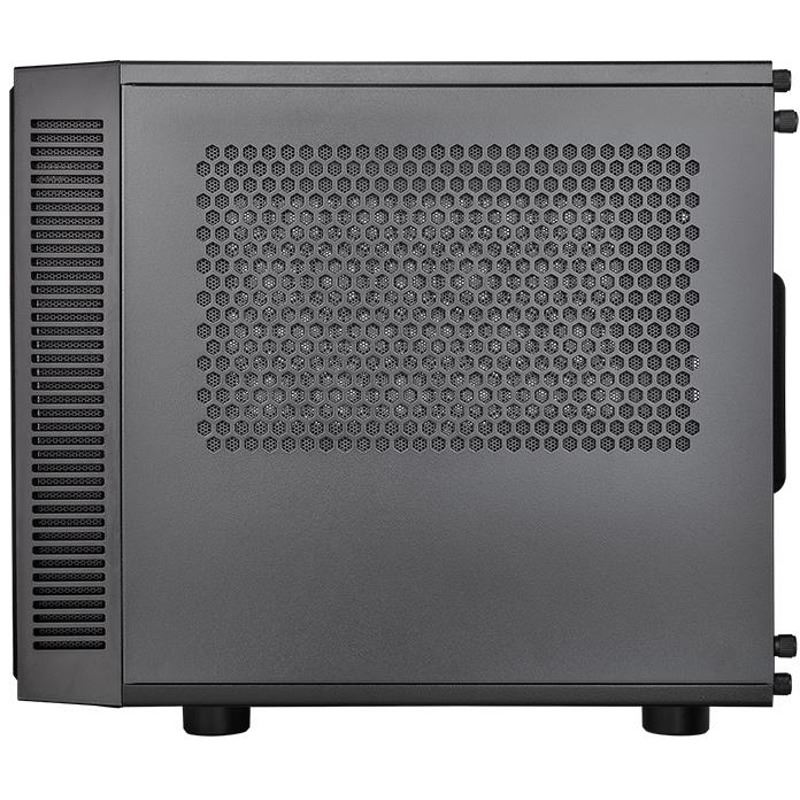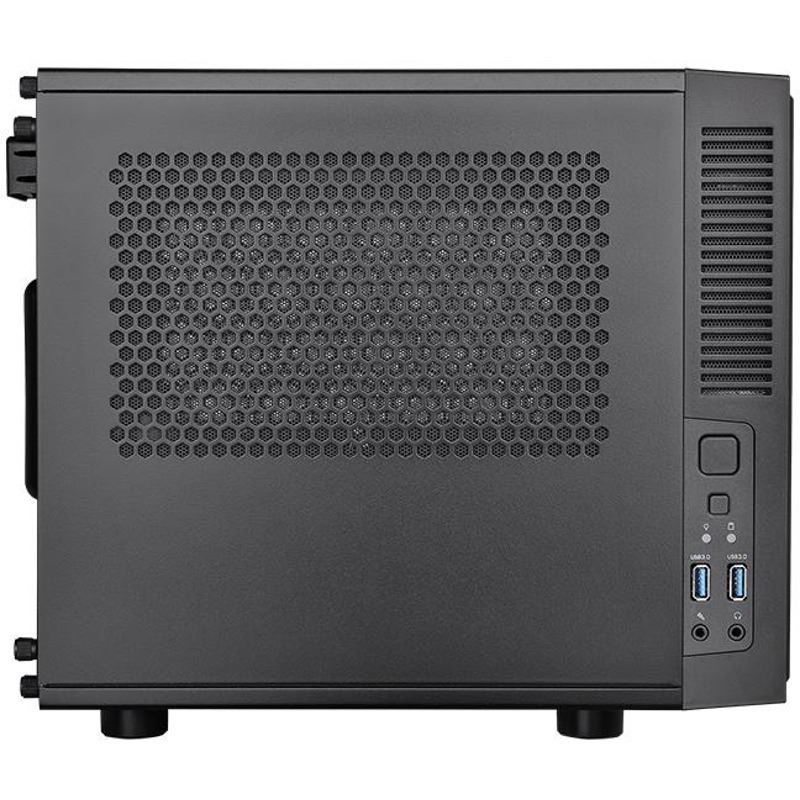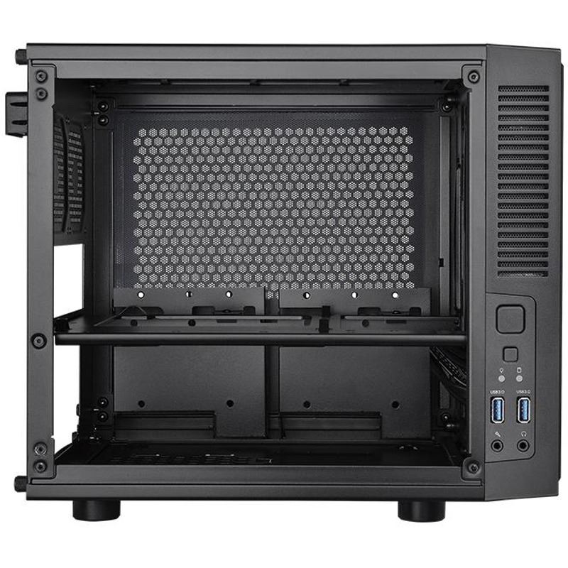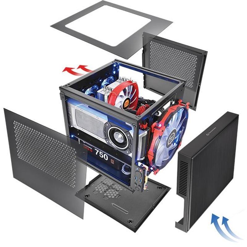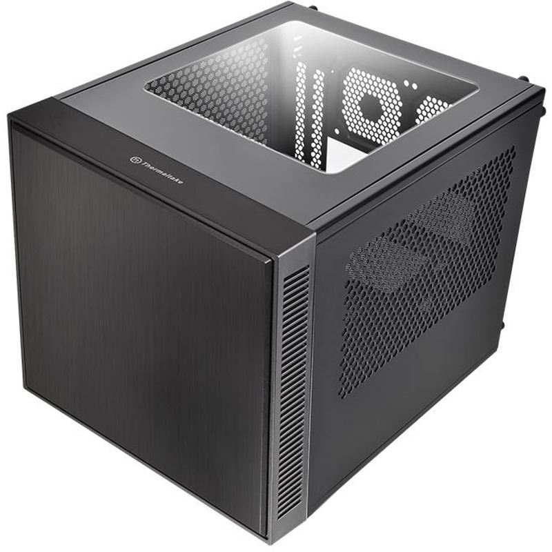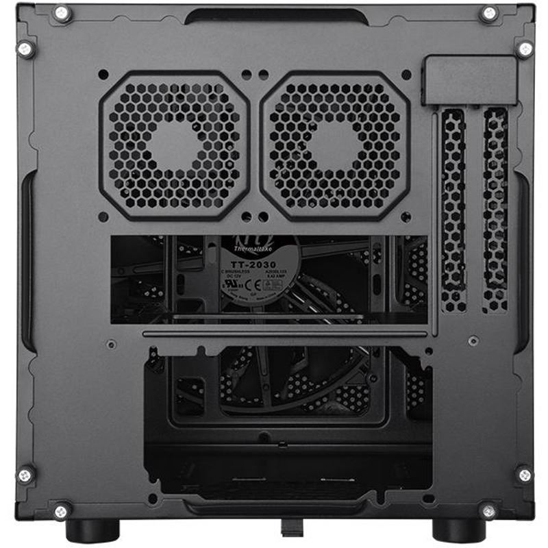 Thermaltake Suppressor F1, SPCC Steel Mini-ITX Cube, fara sursa (tip ATX, montata jos), interior vopsit negru, 2x3.5” (intern), 2x2.5” (intern), design tool-less, panouri laterale interschimbabile ce permit personalizarea carcasei in functie de preferinte, fata – 1x 200mm fan (800 RPM, 13 dBA, inclus) sau 1x 140/120mm fan (optional), spate – 2x 80mm fans (optional), 2x USB 3.0, HD Audio, sloturi expansiune: x2, Mini-ITX, inaltime maxima cooler procesor: 140mm, lungime maxima placa video: 285mm, lungime maxima sursa alimentare: 200mm, suport radiatoare water cooling: fata – 1 x 120mm sau 1 x 140mm, filtre de praf incluse, dimensiuni (HxWxD): 276 x 260 x 319 mm, greutate: 3.2kg