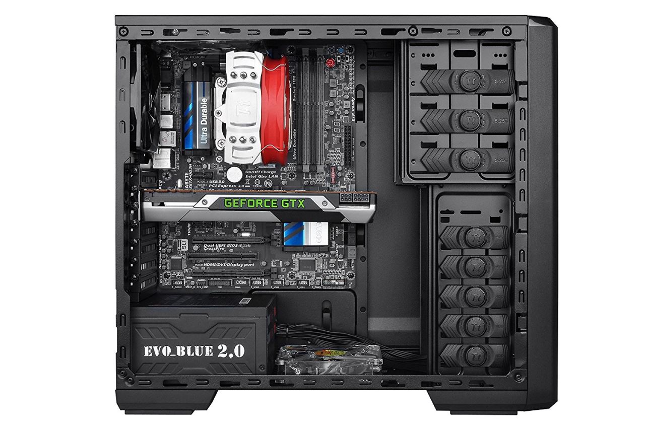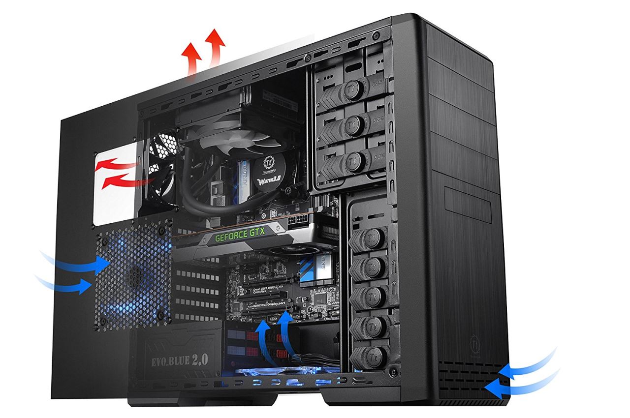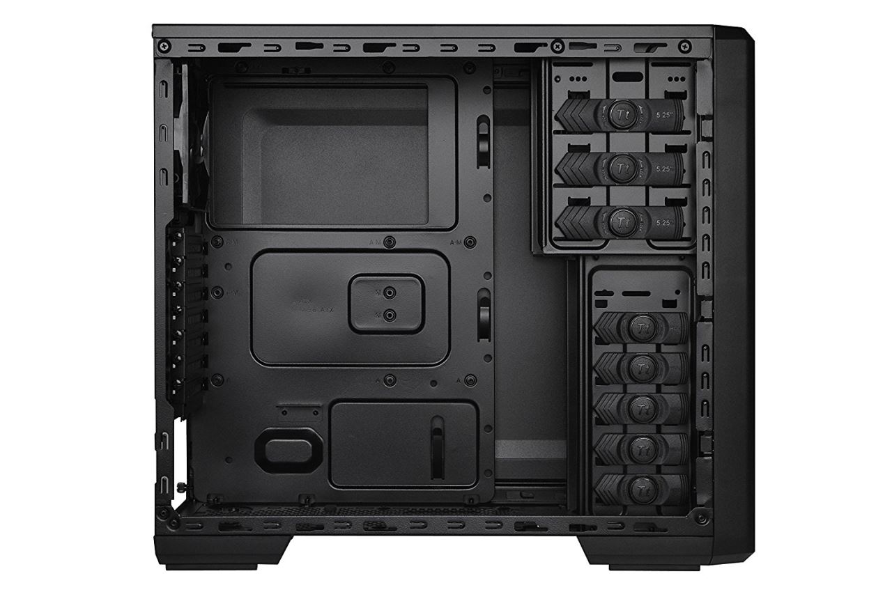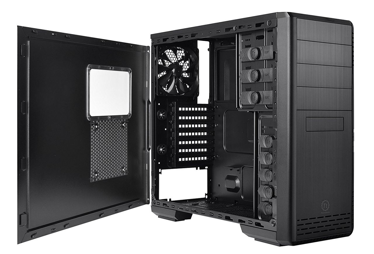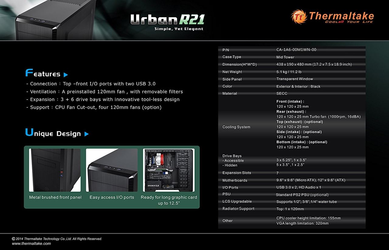 Thermaltake Urban R21, SECC Steel ATX Mid Tower, fara sursa, interior vopsit in negru, 3x5.25” (extern), 1x3.5” (extern), 5x3.5” (intern), 1x2.5” (intern), design tool-less, fata – 1x 120mm fan (optional), spate – 1x 120mm Turbo fan (1000 RPM, 16 dBA, inclus), podea – 1x 120mm fan (optional), tavan – 1x 120mm fan (optional), lateral – 1x 120mm fan (optional), 2x USB 3.0, HD Audio, sloturi expansiune: x7, ATX / microATX, inaltime maxima cooler procesor: 155mm, lungime maxima placa video: 320mm, suport radiatoare water cooling: tavan - 1 x 120mm, filtre de praf incluse, dimensiuni: 438 x 190 x 480 mm, greutate: 5.1 kg