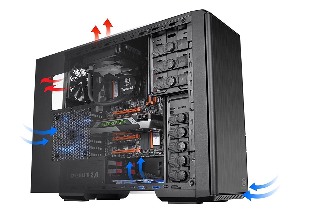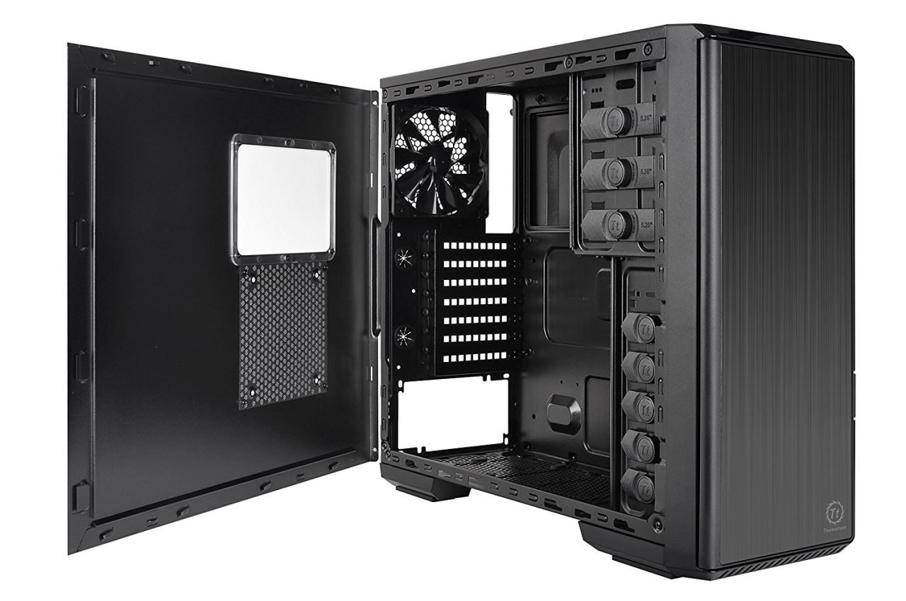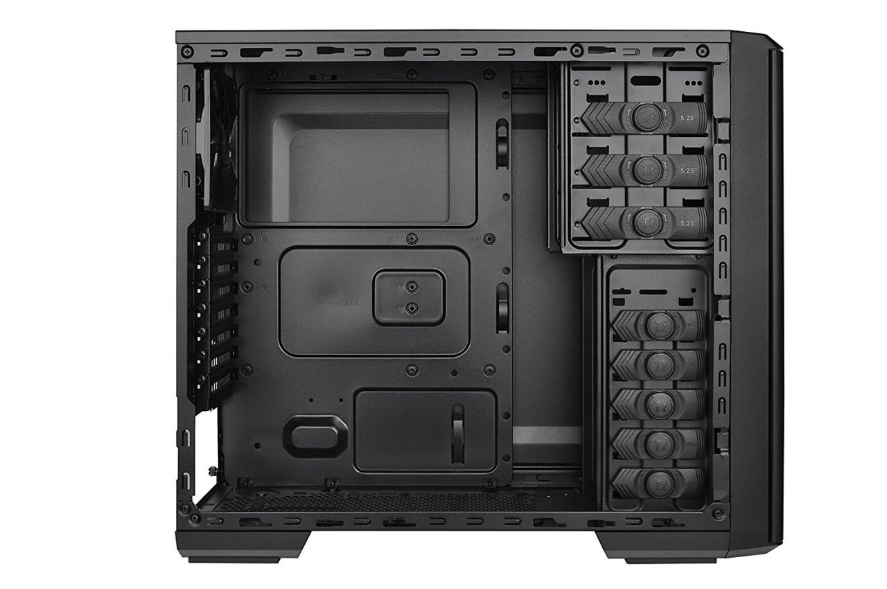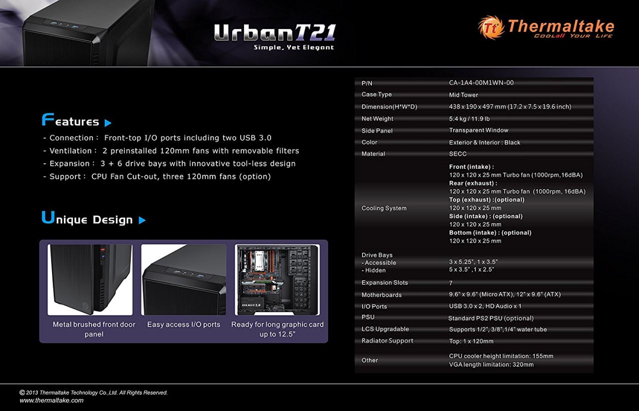 Thermaltake Urban T21, SECC Steel ATX Mid Tower, fara sursa, interior vopsit in negru, 3x5.25” (extern), 1x3.5” (extern), 5x3.5” (intern), 1x 2.5” (intern), design tool-less, fata – 1x 120mm Turbo fan (1000 RPM, 16 dBA, inclus), spate – 1x 120mm Turbo fan (1000 RPM, 16 dBA, inclus), podea – 1x 120mm fan (optional), tavan – 1x 120mm fan (optional), lateral – 1x 120mm fan (optional), 2x USB 3.0, HD Audio, sloturi expansiune: x7, ATX / microATX, inaltime maxima cooler procesor: 155mm, lungime maxima placa video: 320mm, suport radiatoare water cooling: tavan - 1 x 120mm, filtre de praf incluse, dimensiuni: 438 x 190 x 497 mm