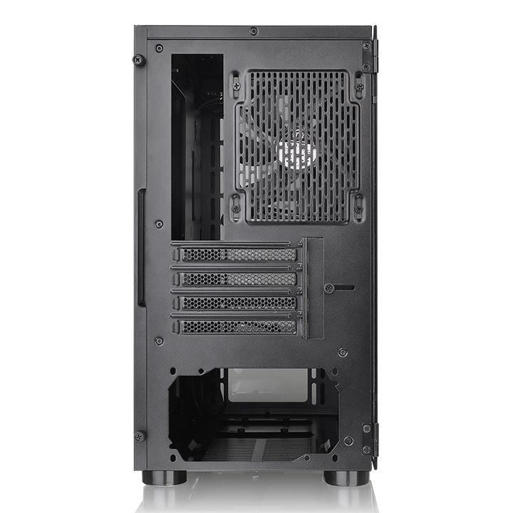 Carcasa Thermaltake V150 Tempered Glass neagra, SPCC Steel ATX Mid Tower, fara sursa (tip ATX, montata jos), interior vopsit negru, design premium cu panou lateral din sticla securizata cu grosimea de 4mm, 2x3.5” (intern), 2x2.5” (intern), design tool-less, fata – 2x 140/120mm fans (optional), spate – 1x 120mm fan (inclus), tavan – 1x 140/120mm fan (optional), 1x USB 3.0, 2x USB 2.0, HD Audio, sloturi expansiune: x4, microATX / Mini-ITX, inaltime maxima cooler procesor: 155mm, lungime maxima placa video: 350mm (fara ventilatoare montate), lungime maxima sursa alimentare: 220mm, suport radiatoare water cooling: fata – 1 x 280/240/140/120mm, spate – 1 x 120mm, dimensiuni (HxWxD): 440 x 208 x 398 mm, greutate: 5.45kg