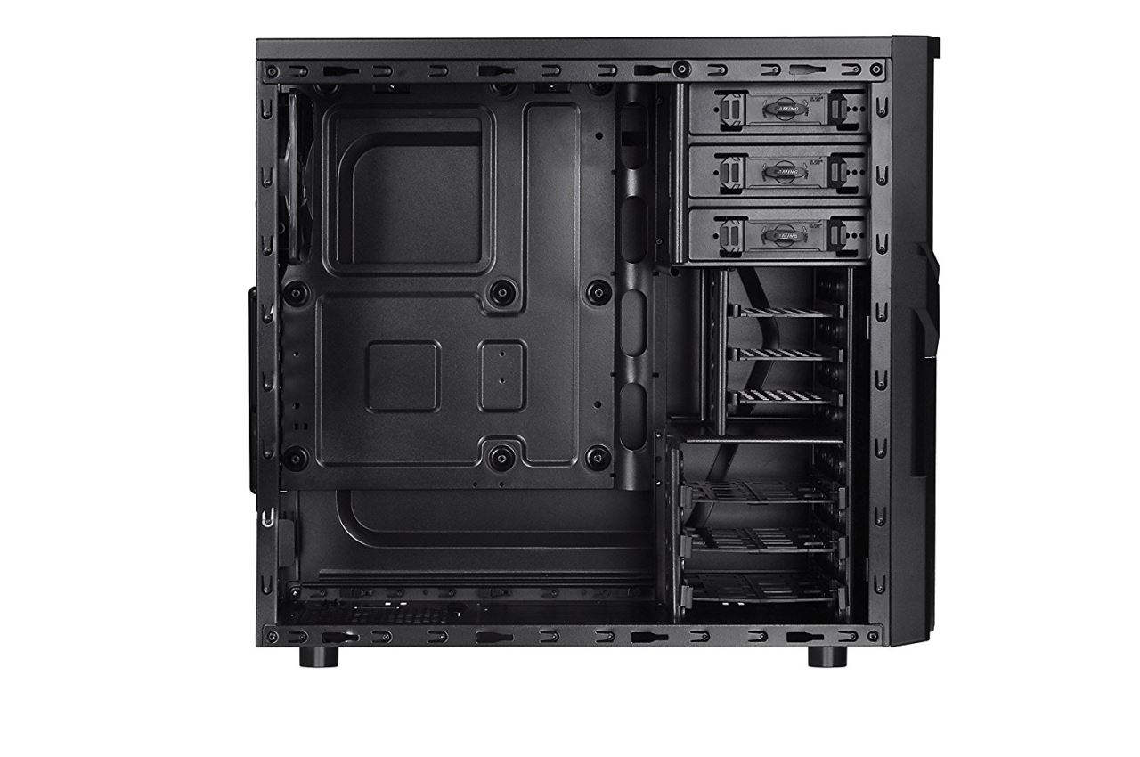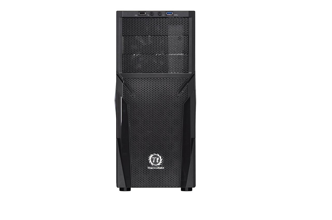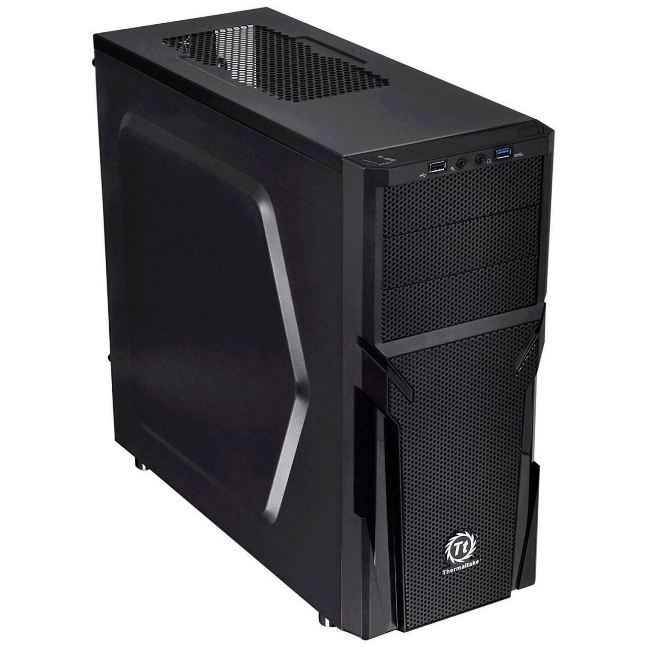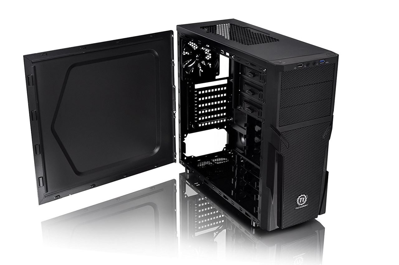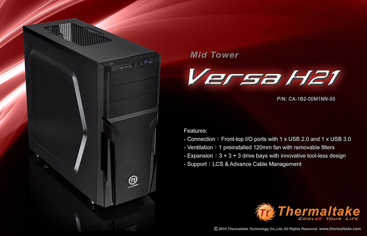 Thermaltake Versa H21, SPCC Steel ATX Mid Tower, fara sursa, interior vopsit negru, 3x5.25” (extern), 3x3.5”/2.5” (intern), 3x2.5” (intern), design tool-less, fata – 2x 120mm fans (optional), spate – 1x 120mm Turbo fan (1000 RPM, 16 dBA, inclus), 1x USB 3.0, 1x USB 2.0, HD Audio, ATX / microATX, sloturi expansiune: x7, inaltime maxima cooler procesor: 155mm, lungime maxima placa video: 315mm, suport radiatoare water cooling: spate – 1 x 120mm, filtre de praf incluse, dimensiuni: 429 x 209 x 480mm, greutate: 4.2kg