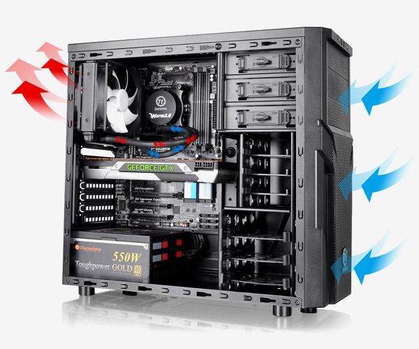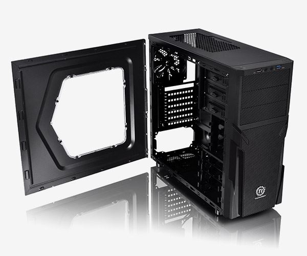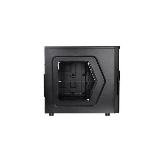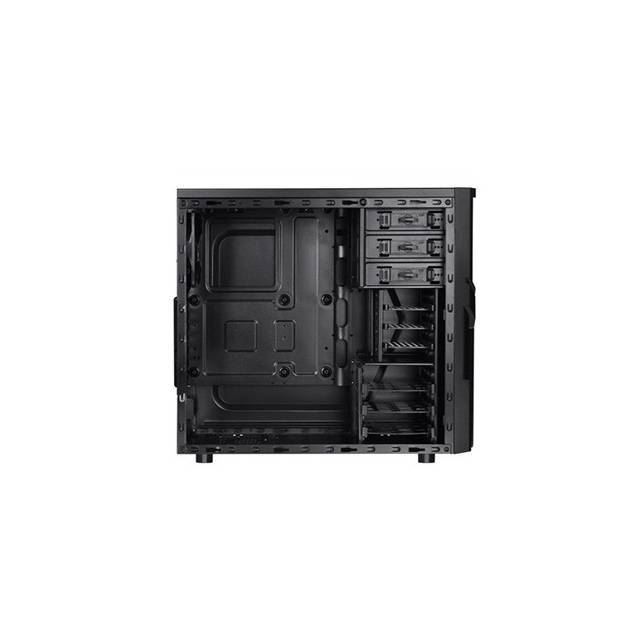 Thermaltake Versa H21 Window, SPCC Steel ATX Mid Tower, fara sursa, interior vopsit in negru, 3x5.25” (extern), 3x3.5”/2.5” (intern), 3x2.5” (intern), design tool-less, front – 2x 120mm fans (optional), rear – 1x 120mm fan (1000 RPM, 16 dBA, inclus), bottom – 1x 120mm fan (optional), top – 2x 120mm fan (optional), side – 2x 120mm fan (optional), 1x USB 3.0, 1x USB 2.0, HD Audio, ATX / microATX, sloturi expansiune: x7, inaltime maxima cooler procesor: 155mm, lungime maxima placa video: 315mm, dimensiuni: 429 x 209 x 480mm, greutate: 4.2kg