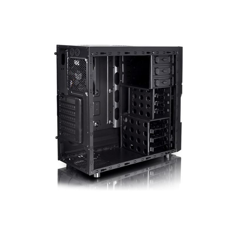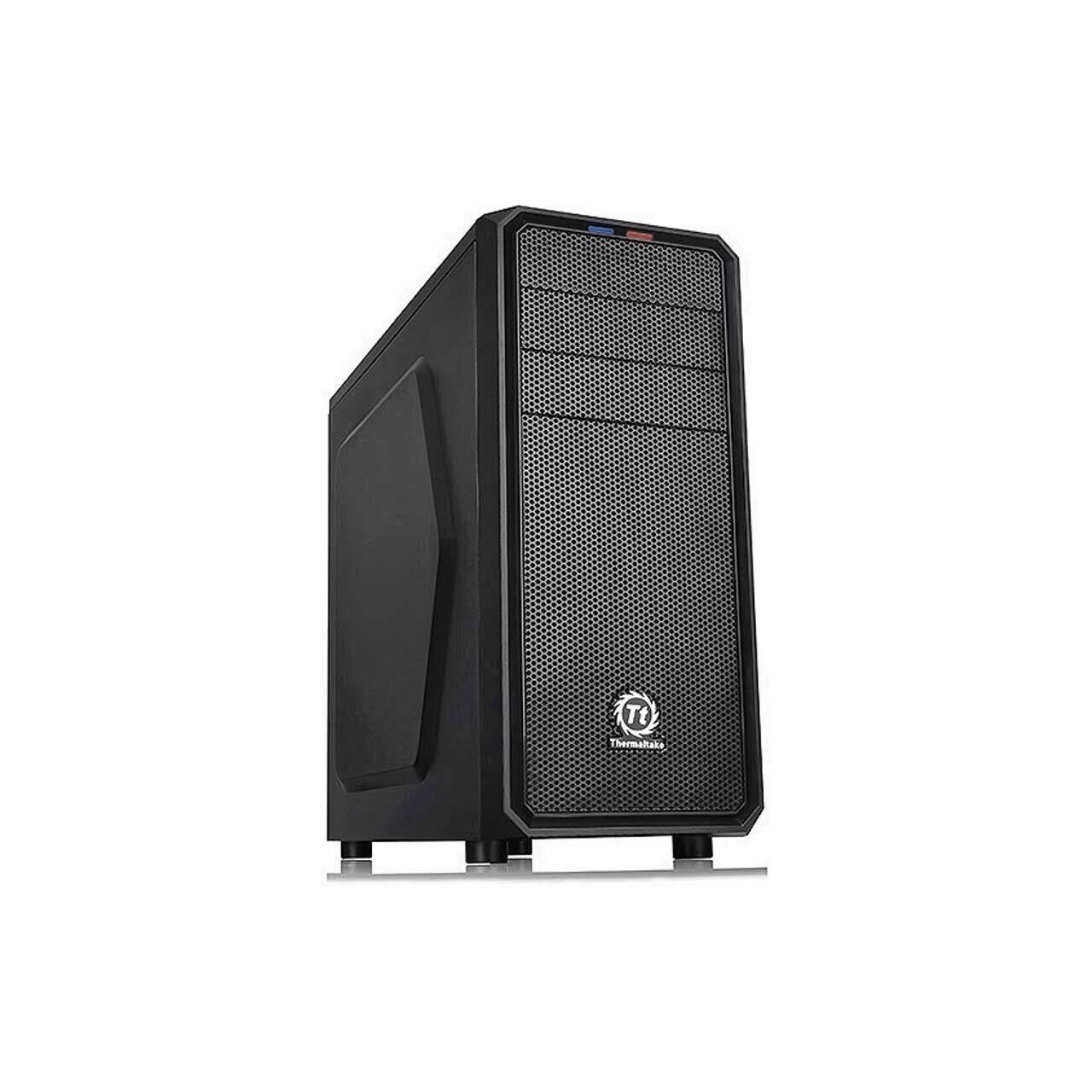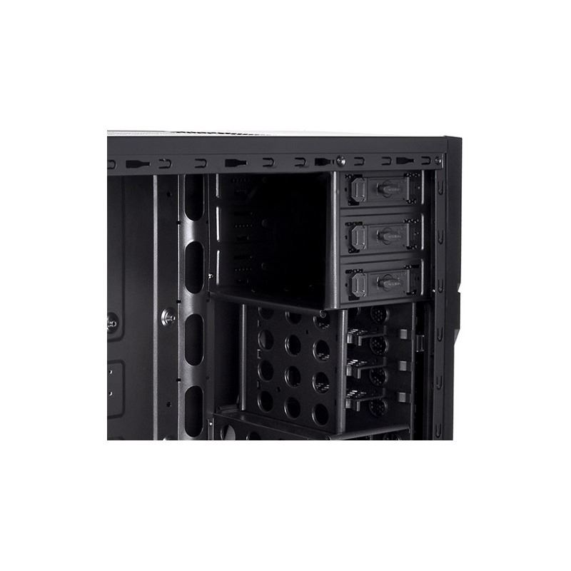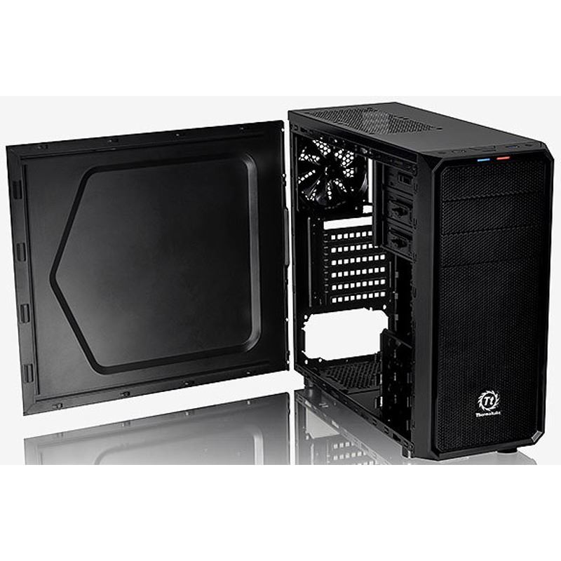 Thermaltake Versa H25, SPCC Steel ATX Mid Tower, fara sursa, interior vopsit negru, 3x5.25” (extern), 3x3.5”/2.5” (intern), 3x2.5” (intern), design tool-less, fata – 2x 120mm fans (optional), spate – 1x 120mm Turbo fan (1000 RPM, 16 dBA, inclus), tavan – 2x 120mm fans (optional), 1x USB 3.0, 1x USB 2.0, HD Audio, ATX / microATX, sloturi expansiune: x7, inaltime maxima cooler procesor: 155mm, lungime maxima placa video: 315mm, suport radiatoare water cooling: spate – 1 x 120mm, filtre de praf incluse, dimensiuni: 429 x 209 x 478mm, greutate: 4.2kg