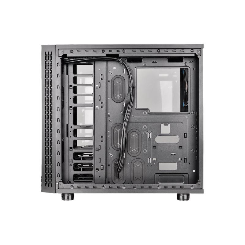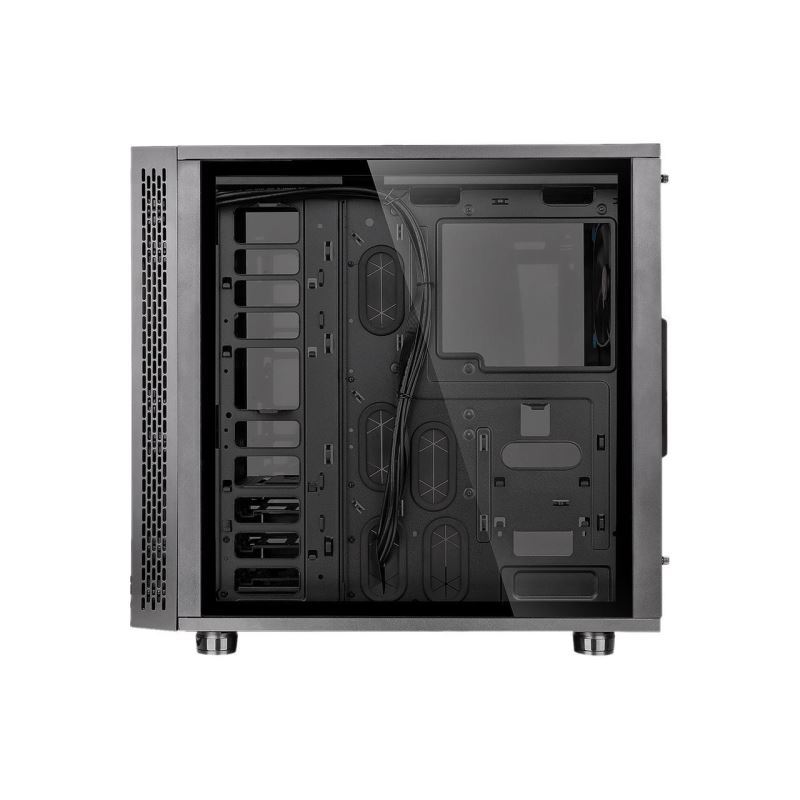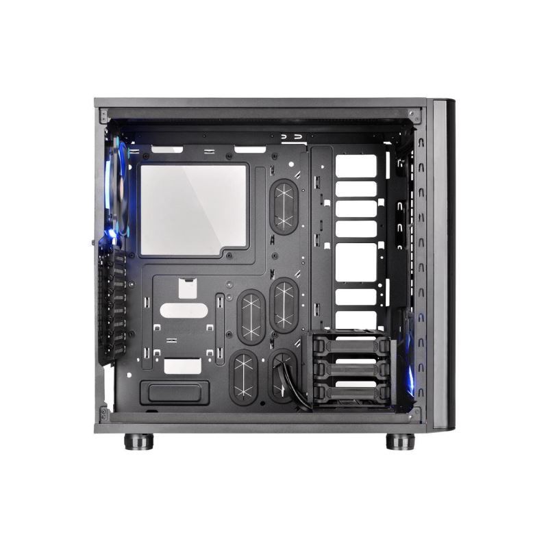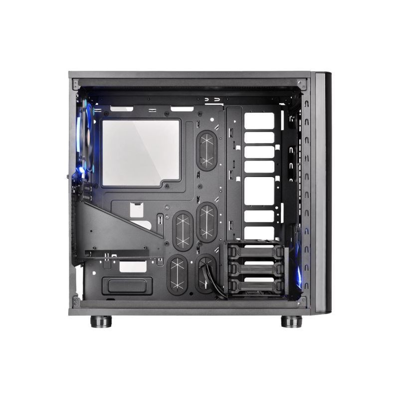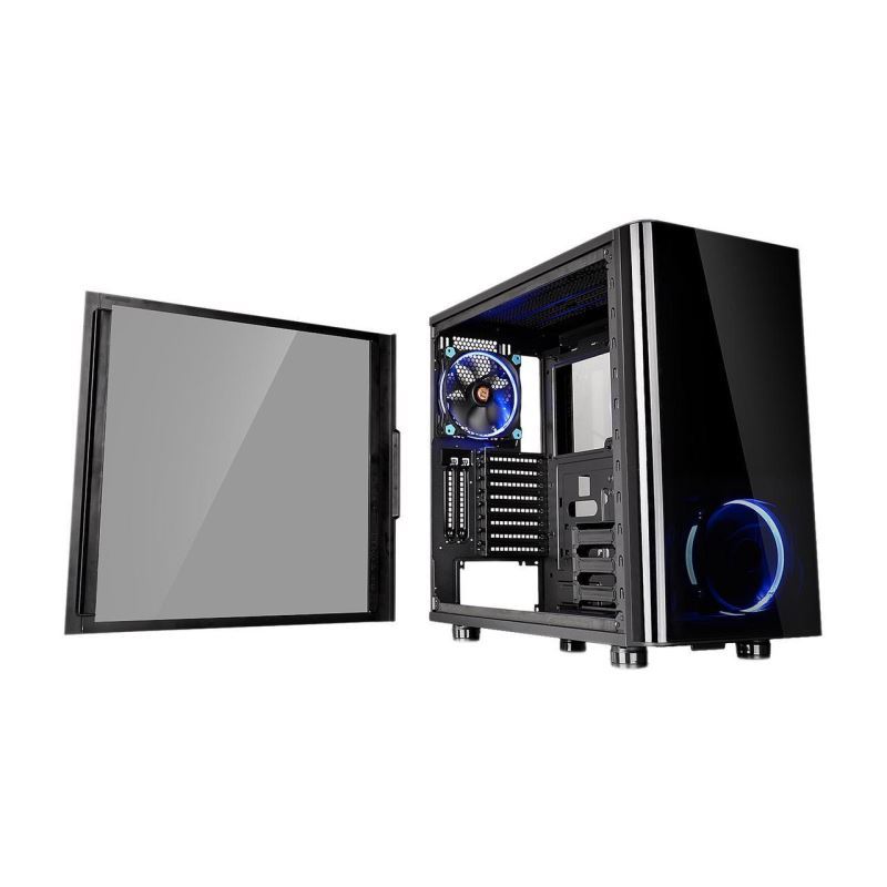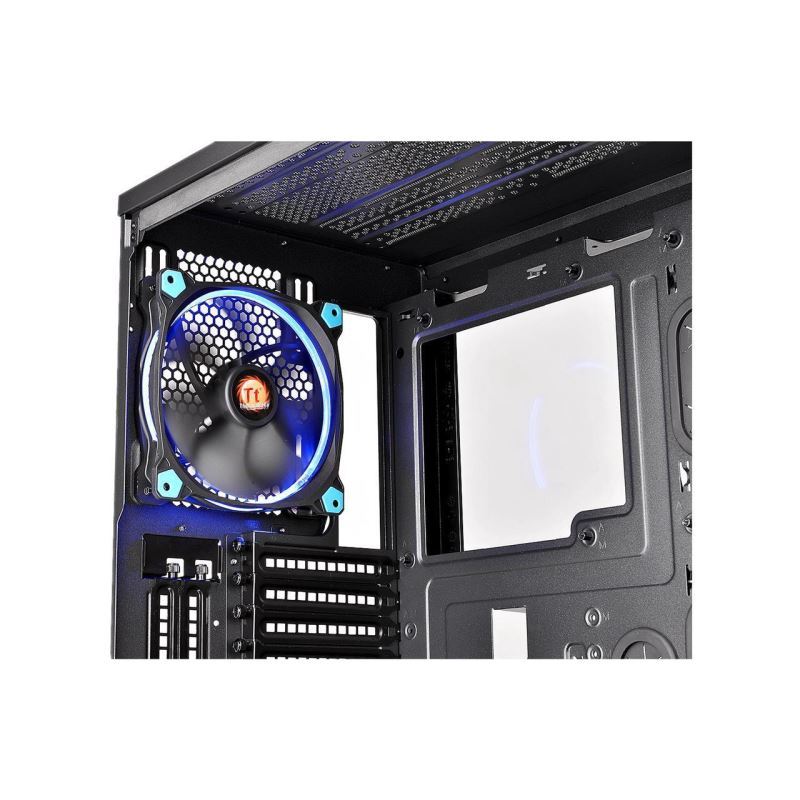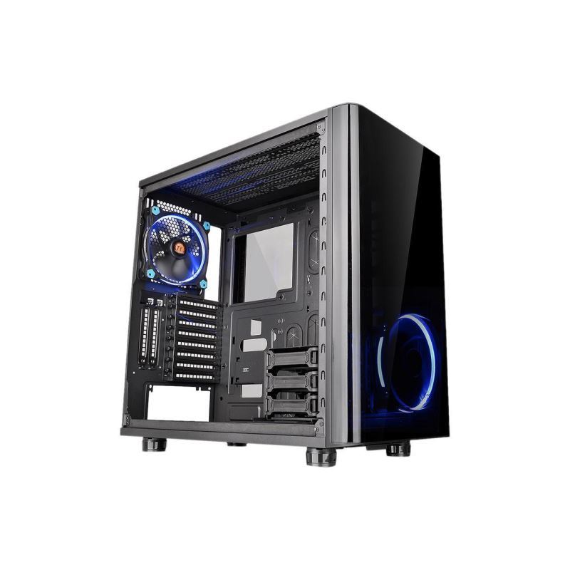 Thermaltake View 31 Tempered Glass Edition, SPCC Steel ATX Mid Tower, fara sursa (tip ATX, montata jos), design premium cu panoul lateral din sticla securizata cu grosimea de 4mm, interior vopsit negru, 3x3.5”/2.5” (intern), fata – 1x 140mm Riing LED Blue fan (1400rpm, 28dBA / 1000rpm, 22dBA cu LNC, inclus) si 1x 140mm fan (optional) / 3x 120mm fans (optional) / 1x 200mm fan (optional), spate – 1x 140mm Riing LED Blue fan (1400rpm, 28dBA / 1000rpm, 22dBA cu LNC, inclus) sau 1x 120mm fan (optional), tavan – 3x 140mm / 3x 120mm / 2x 200mm fans (optional), podea – 2x 140/120mm fans (optional), 2x USB 3.0, 2x USB 2.0, HD Audio, ATX / microATX / Mini-ITX, sloturi expansiune: x8+2, posibilitatea montarii placii video in pozitie verticala (cablul Thermaltake PCI-e X16 Riser Cable nu este inclus), inaltime maxima cooler procesor: 180mm, lungime maxima placa video: 278mm (cu rack HDD) sau 420mm (fara rack HDD), lungime maxima sursa: 180mm (cu ventilatorul din podea instalat) sau 220mm (fara ventilatorul din podea instalat), suport radiatoare water cooling: fata – 1 x 360mm sau 1 x 280mm, tavan – 1 x 360mm sau 1 x 280mm, spate – 1 x 140mm sau 1 x 120mm, podea – 1 x 140mm sau 1 x 120mm, dimensiuni (HxWxD): 497 x 250 x 511mm, greutate: 9.9kg