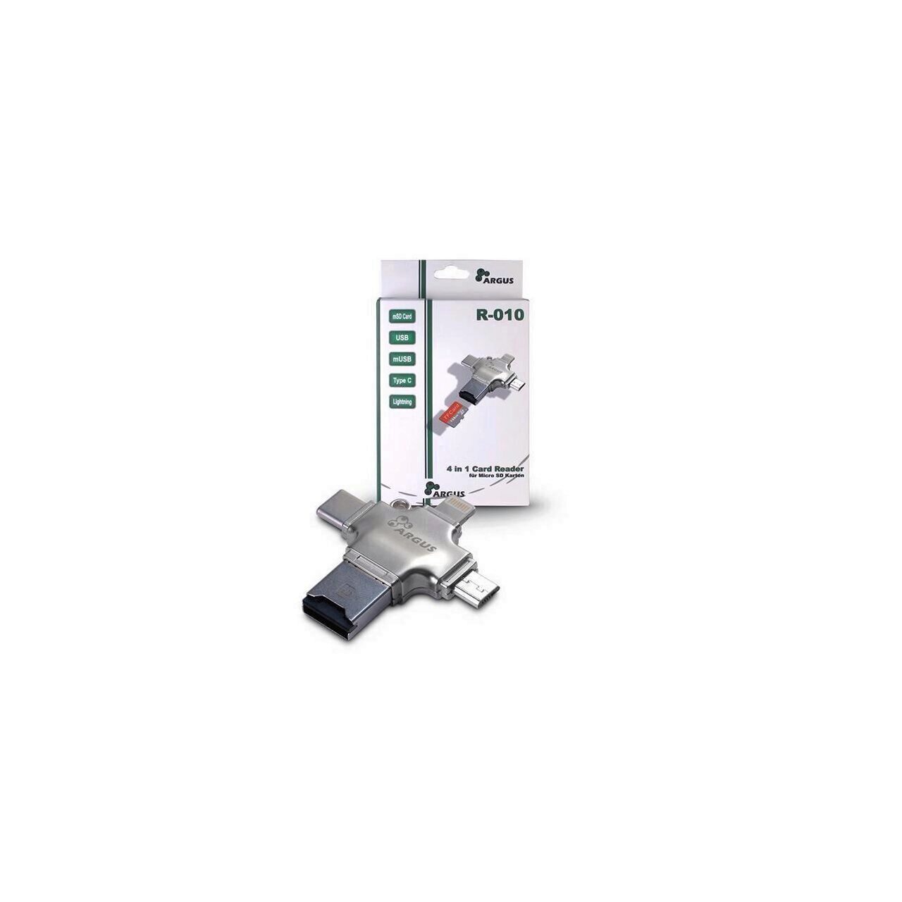 Inter-Tech Argus R-010 Card Reader, conectori: USB 2.0 Type-A/Micro-USB/USB Type-C/Lightning (MFi), compatibil: TF, SD, SDHC, SDXC, microSD, microSDHC, microSDHX, capacitati de memorie suportate: 8/16/32/64/128GB, formate de partitii suportate: FAT, exFAT, constructie din aluminiu, dimensiuni (h/w/d): 7 x 41 x 41mm